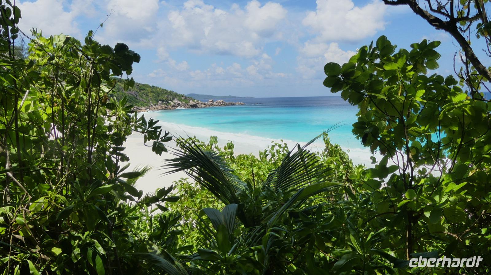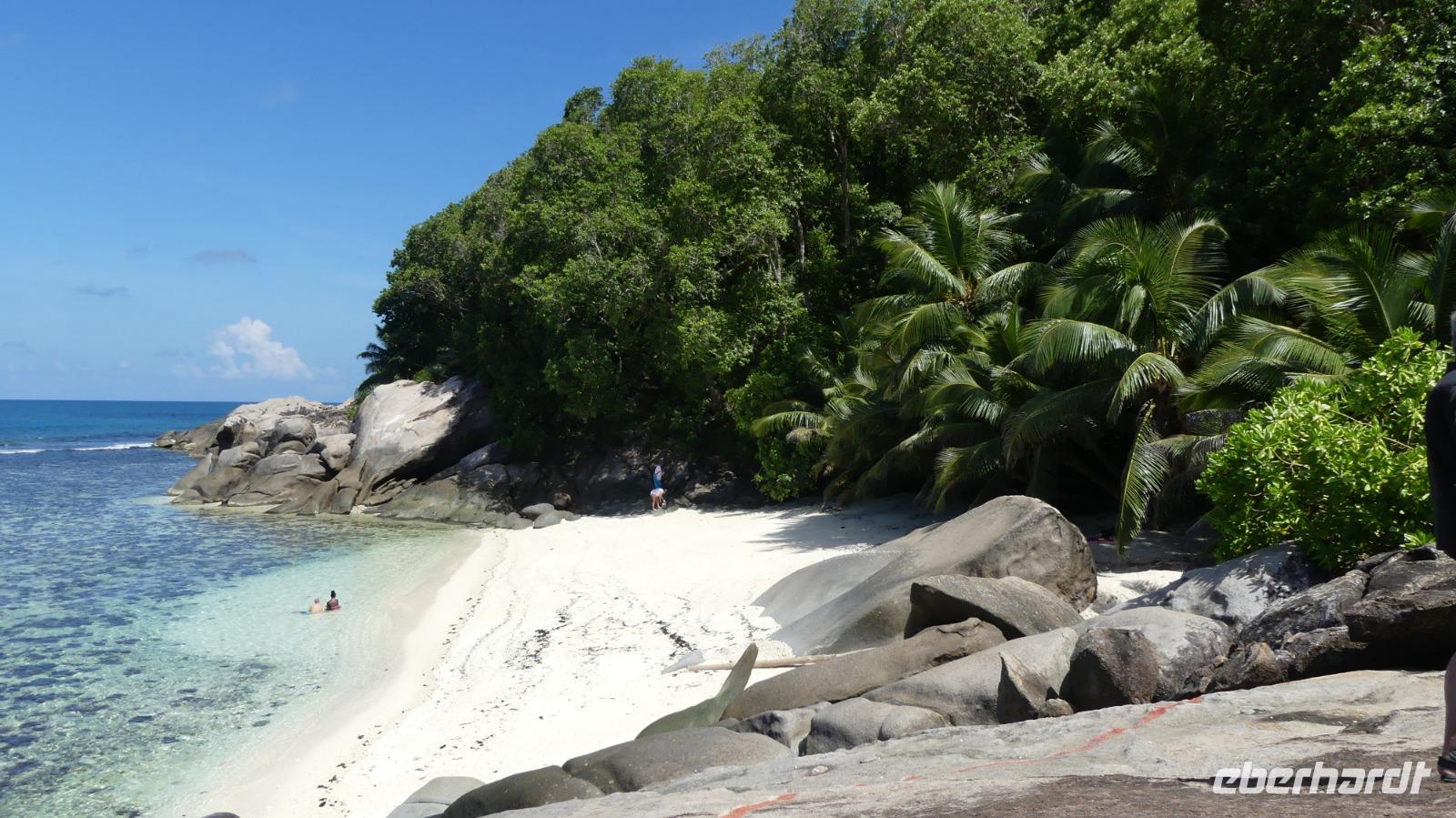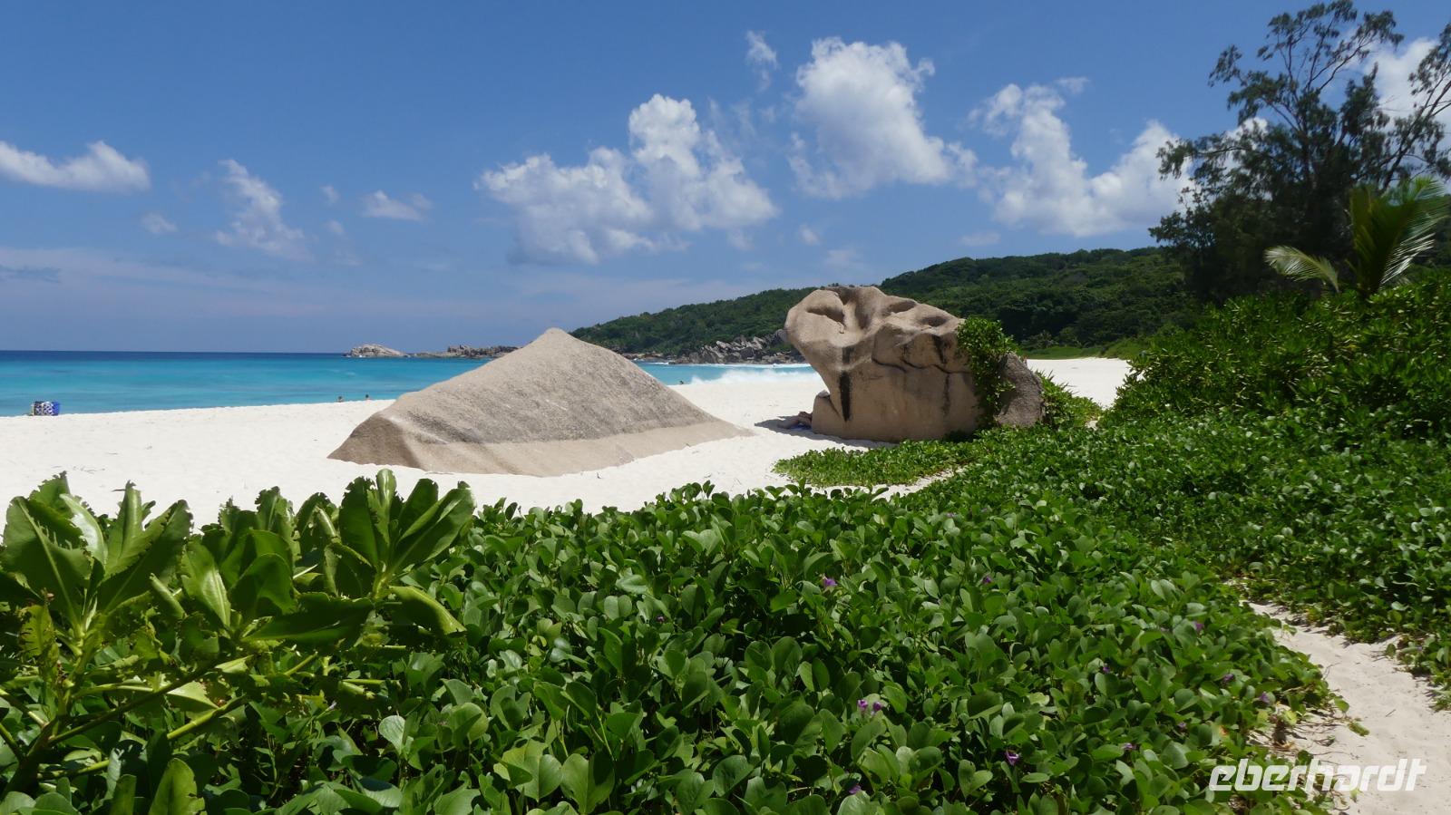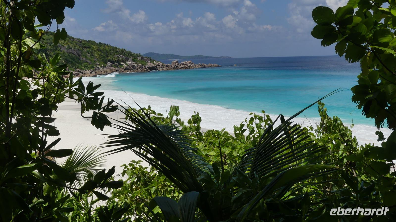 Zum Mittagessen begeben wir uns per LKW auf die andere Inselseite zum nächsten Traumstrand, den Grand´ Anse. Eingerahmt von Granitfelsen liegt der weiße Puderzuckerstrand (feiner Korallensand) am klaren türkisfarbenen Meer. Die intensiven Farben der Seychellen begeistern uns immer wieder aufs Neue. Kleiner Schönheitsfehler: da es kein vorgelagertes Riff gibt, sorgt die Brandung für Strömungen, weshalb man nicht weit hinausschwimmen sollte.