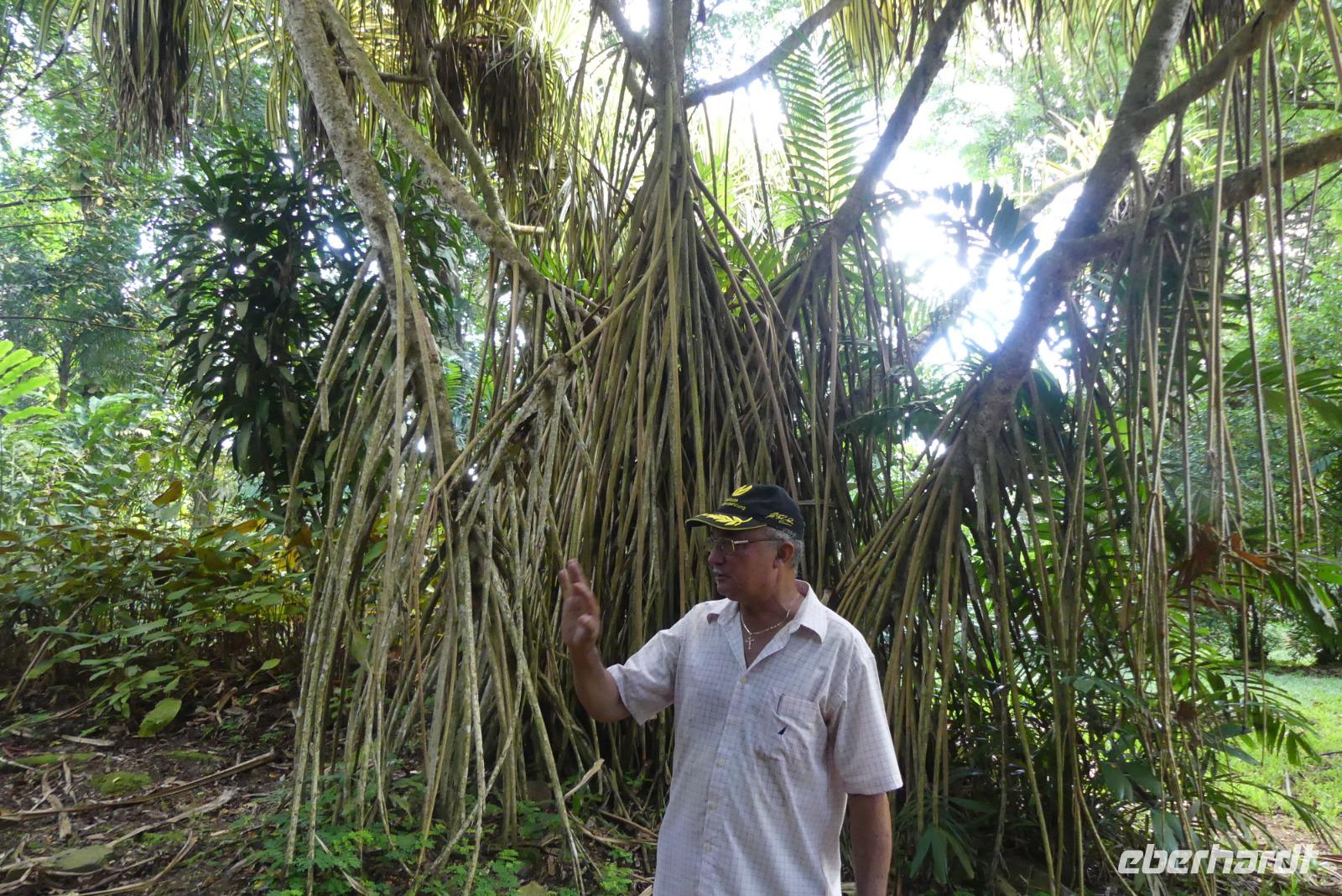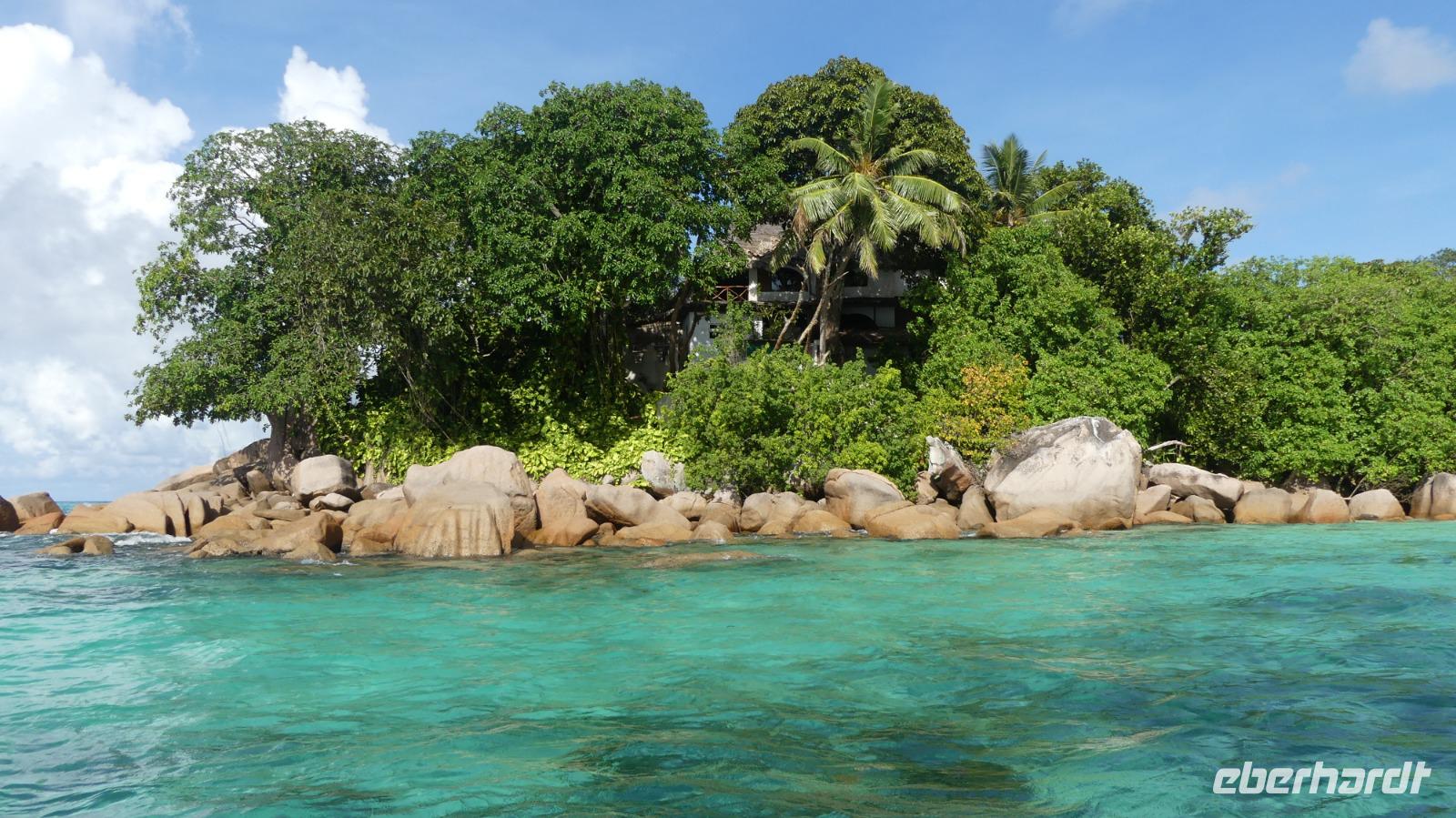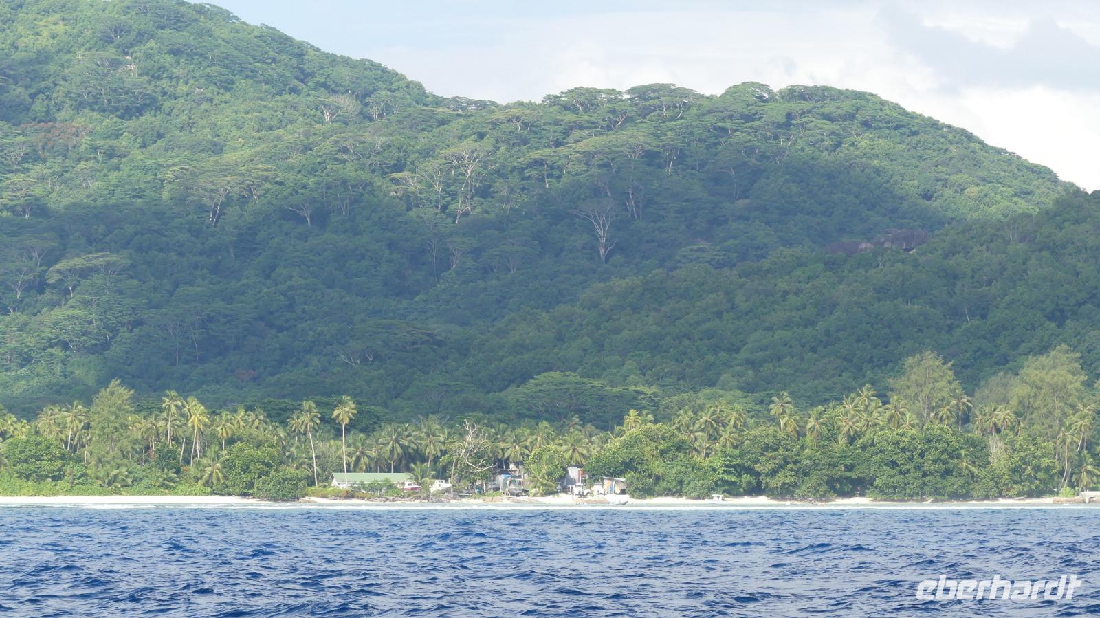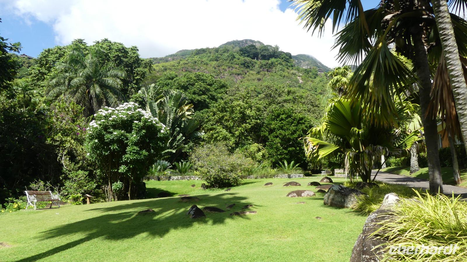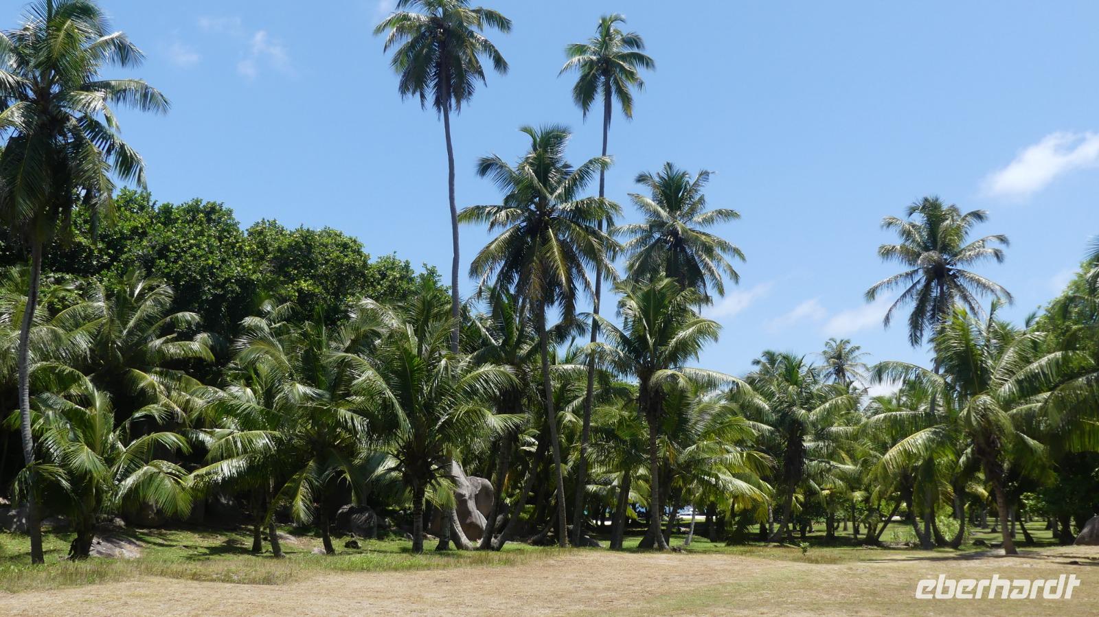Reiseleiter Cyril erzählt uns von der Geschichte der Insel, wie sie aufgeforstet wurde und hier Schätze vergraben wurden. Es war der britische Journalist Brendon Grimshaw, der 1962 die abgeholzte Insel kaufte und mit Hilfe Einheimischer viele endemische Pflanzen, wie die Coco de Mer anpflanzte. Der Brite schlug Millionenangebote potentieller Käufer aus und ist hier auf dem Inselfriedhof begraben.