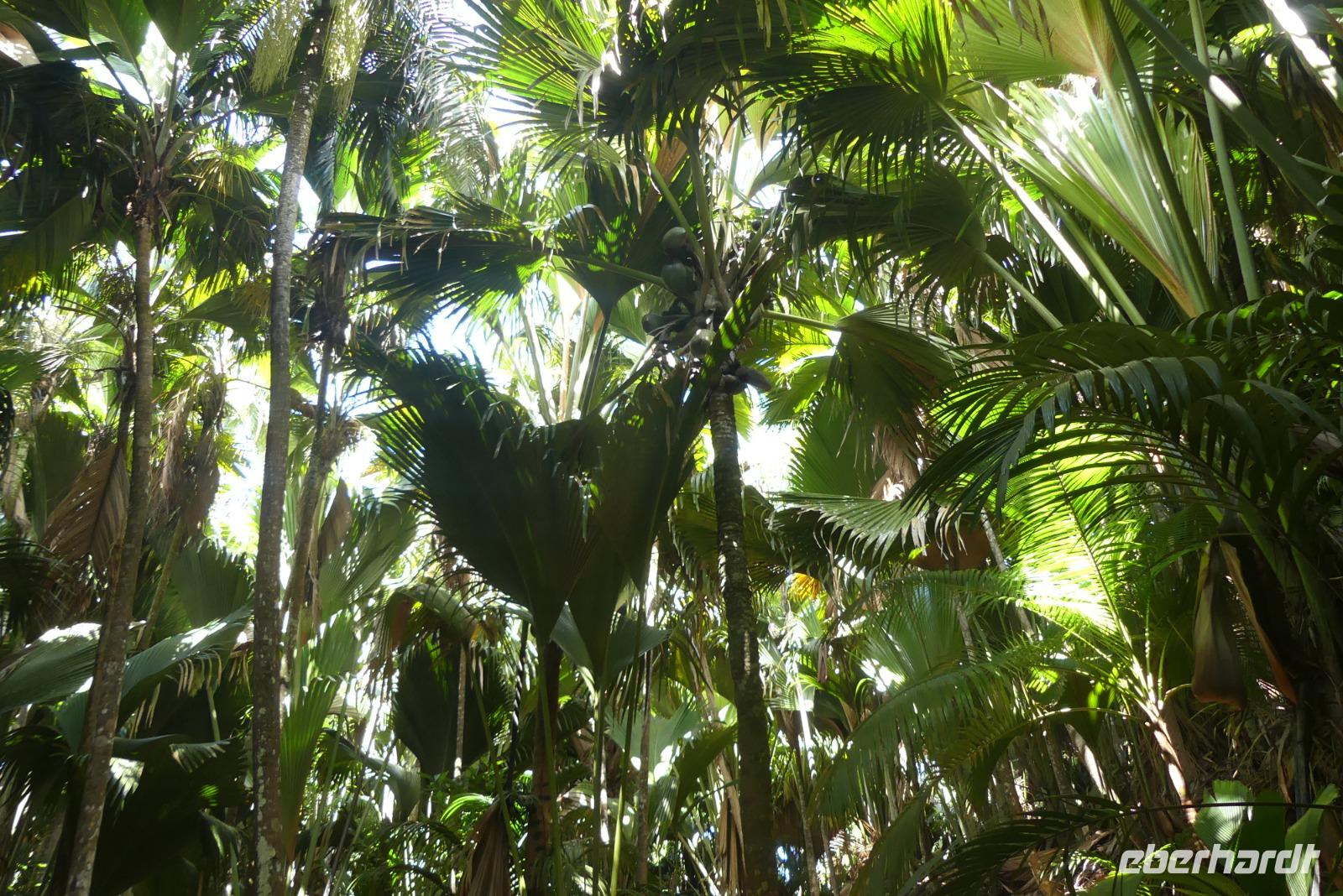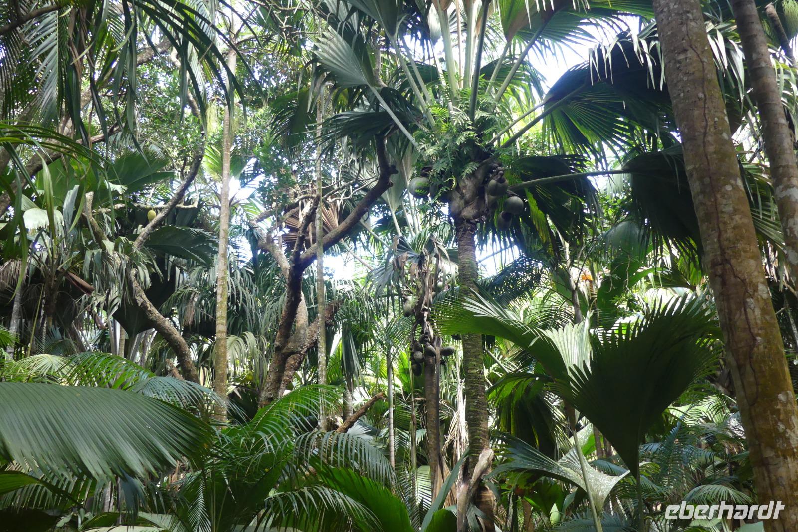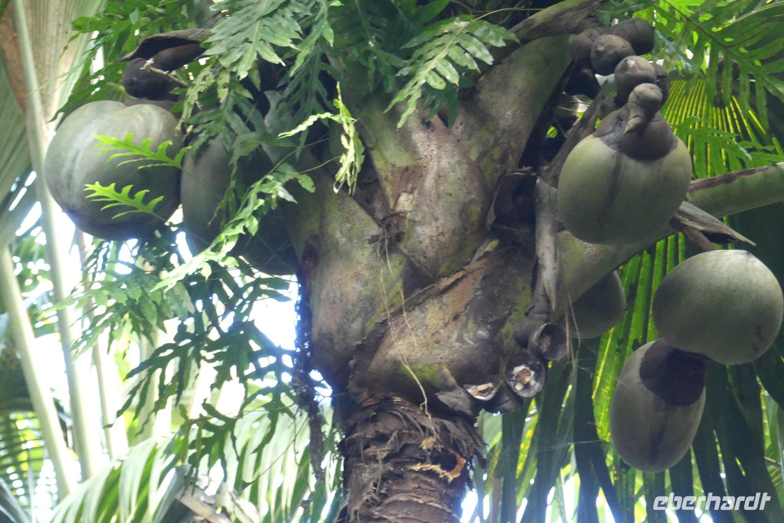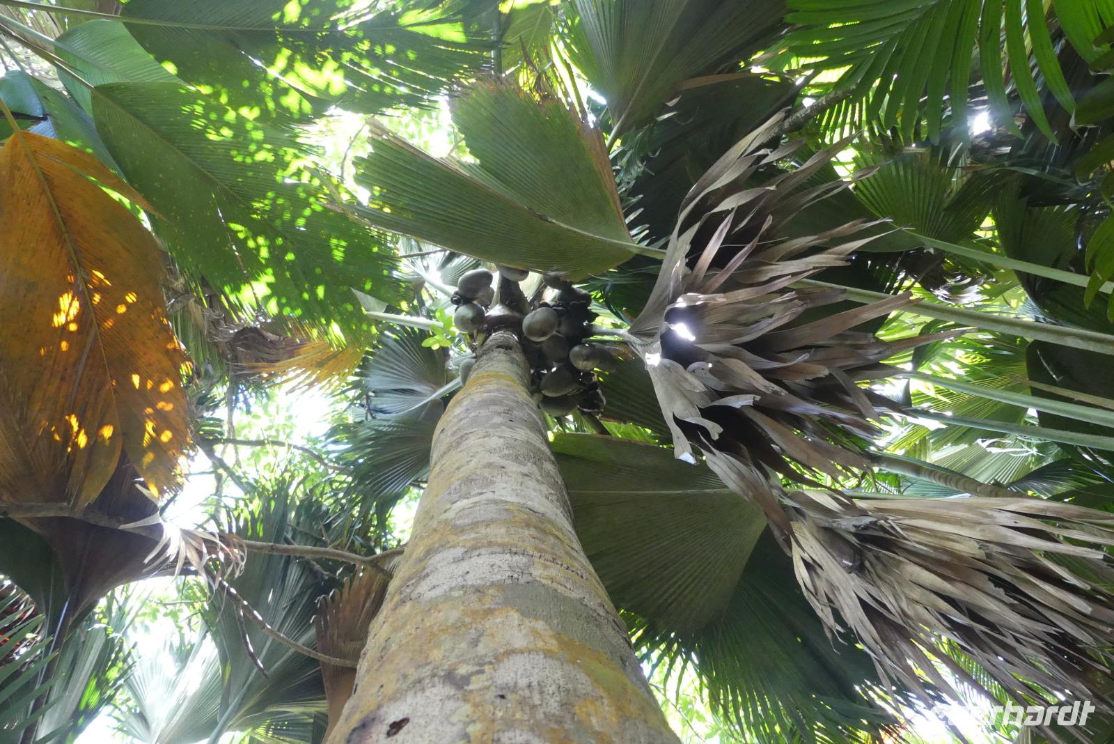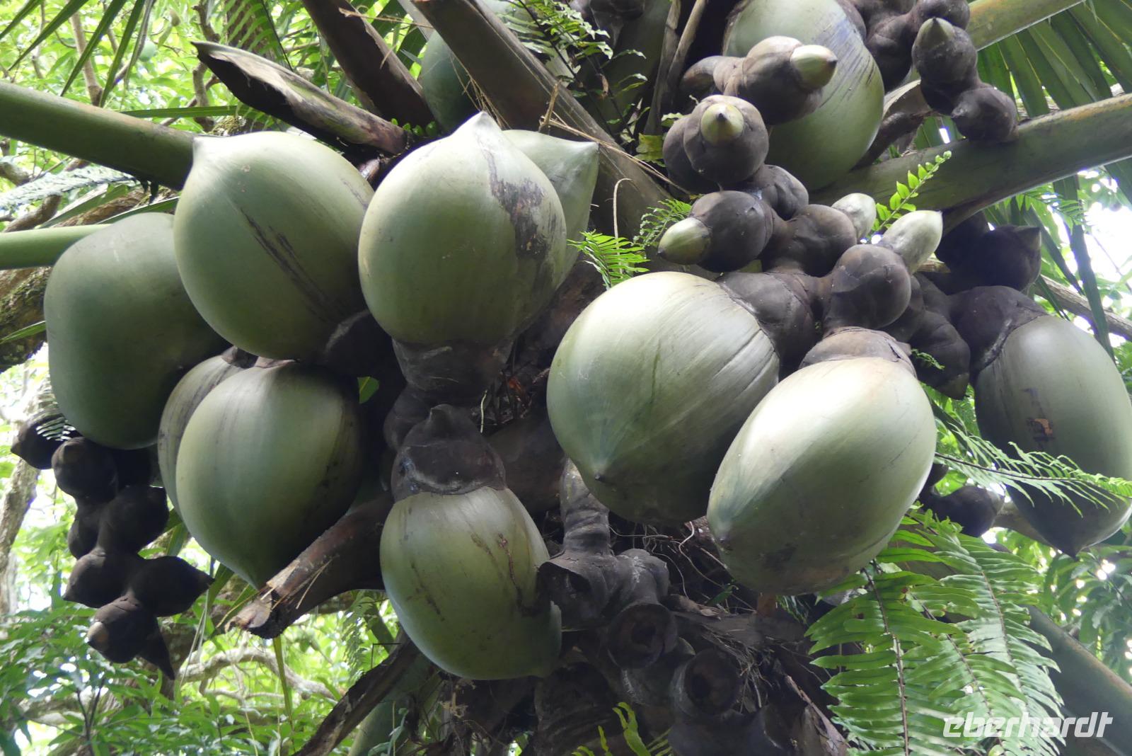 Zunächst sind wir im Nationalpark Vallée de Mai. Die riesigen Blätter der Coco de Mer bedecken über uns den Himmel fast vollständig. Es ist ein bizarrer Palmenwald, dominiert von der Coco de Mer, aber auch die anderen fünf heimischen Palmenarten sind hier vertreten. Das etwa 20 Hektar große Hochtal mit der urzeitlichen Seychellenpalme steht unter strengem Schutz und gehört seit 1983 zum UNESCO-Weltnaturerbe der Unesco. Nur hier auf Praslin und auf der Schwesterinsel Curieuse wächst die Coco de Mer. Die Coco de Mer hat erstaunliche Eigenschaften: erst nach rund 20 bis 25 Jahren Wachstum ist das Geschlecht der Palme erkennbar, gerade mal ein Blatt im Jahr wächst, dafür ist es abgesehen von der Konkurrenz auf Mauritius das größte im gesamten Pflanzenreich; nach der Befruchtung braucht der Samen ganze 6 bis 7 Jahren bis zur Reife, dann ist er aber der größte der Welt, bis 24 kg brachten Samen schon auf die Waage - Weltrekord, das schafft kein anderer Samen! Ein guter Grund für uns, ein ausgiebiges Fotoshooting gemeinsam mit einem Riesensamen zu machen.