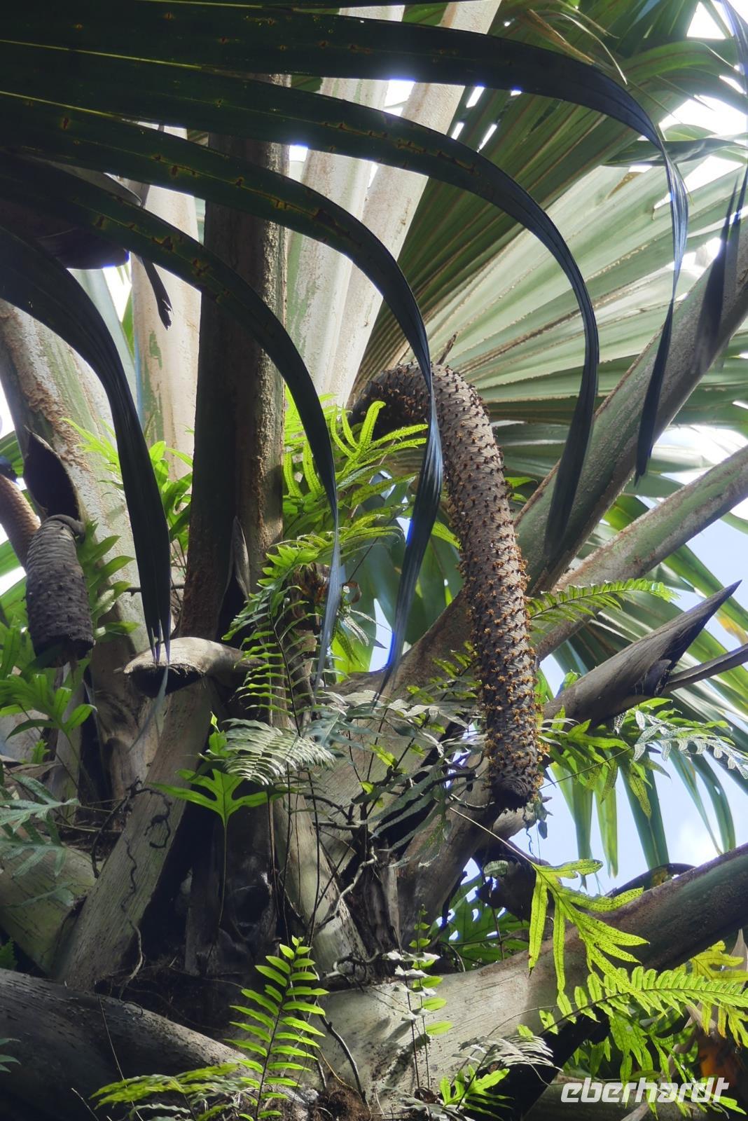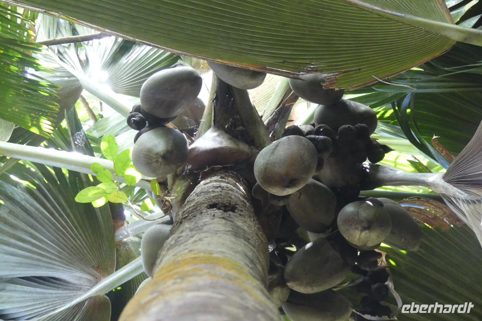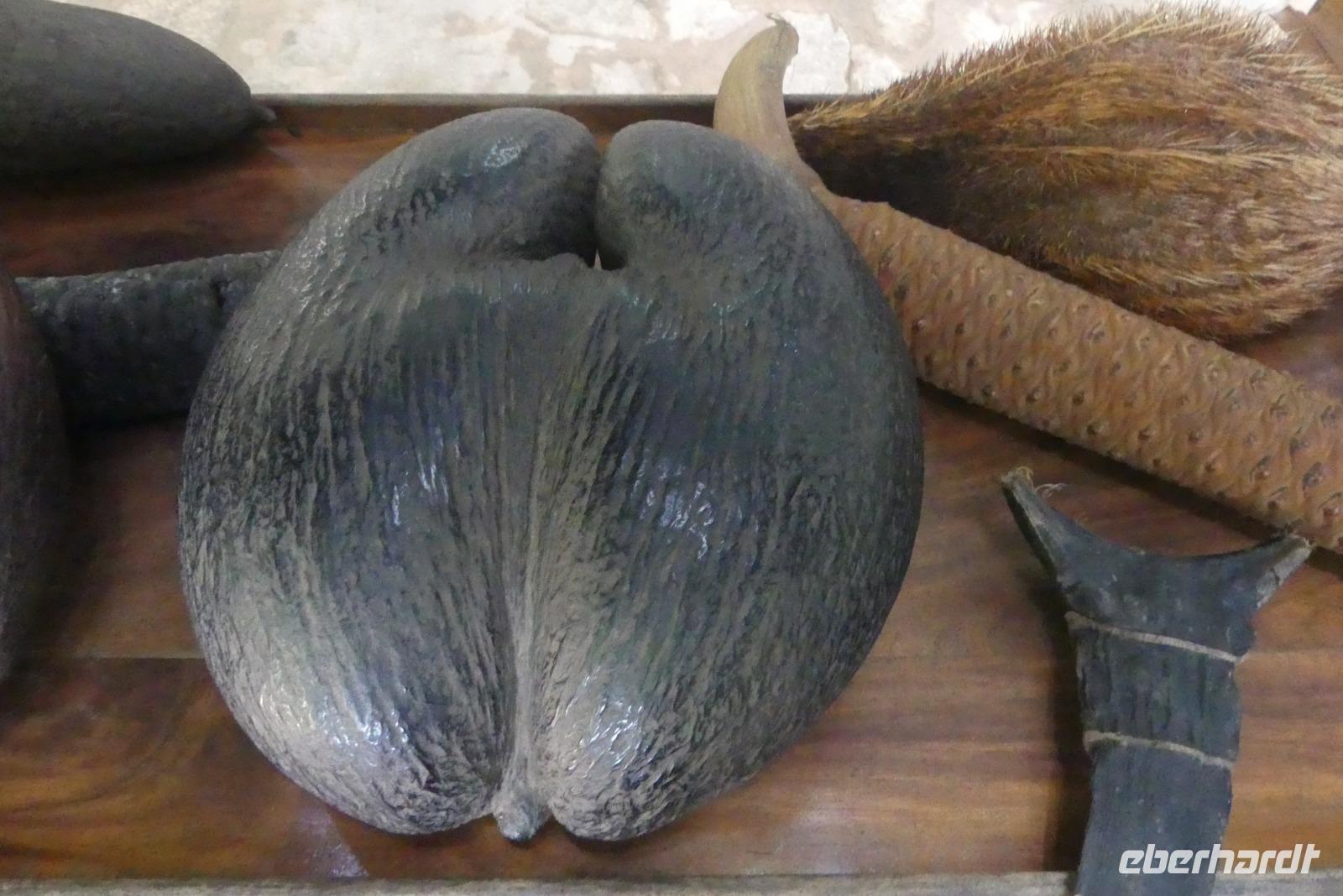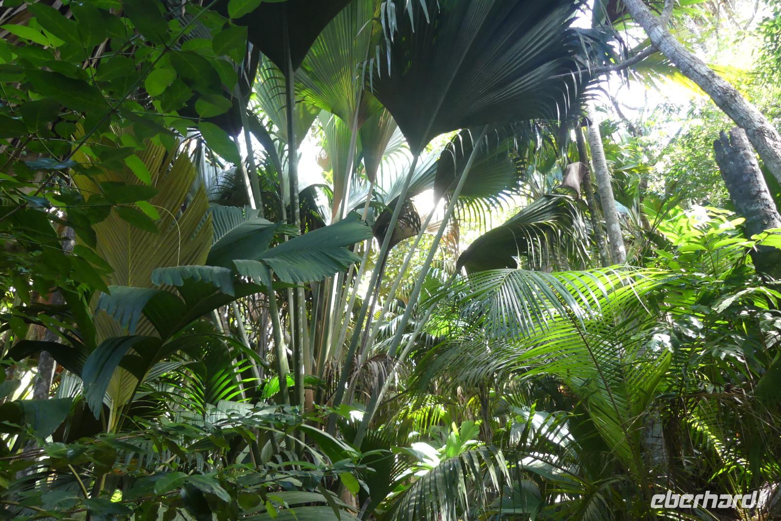 Zunächst sind wir im Nationalpark Vallée de Mai. Die riesigen Blätter der Coco de Mer bedecken über uns den Himmel fast vollständig. Es ist ein bizarrer Palmenwald, dominiert von der Coco de Mer, aber auch die anderen fünf heimischen Palmenarten sind hier vertreten. Das etwa 20 Hektar große Hochtal mit der urzeitlichen Seychellenpalme steht unter strengem Schutz und gehört seit 1983 zum UNESCO-Weltnaturerbe der Unesco. Nur hier auf Praslin und auf der Schwesterinsel Curieuse wächst die Coco de Mer. Die Coco de Mer hat erstaunliche Eigenschaften: erst nach rund 20 bis 25 Jahren Wachstum ist das Geschlecht der Palme erkennbar, gerade mal ein Blatt im Jahr wächst, dafür ist es abgesehen von der Konkurrenz auf Mauritius das größte im gesamten Pflanzenreich; nach der Befruchtung braucht der Samen ganze 6 bis 7 Jahren bis zur Reife, dann ist er aber der größte der Welt, bis 24 kg brachten Samen schon auf die Waage - Weltrekord, das schafft kein anderer Samen! Ein guter Grund für uns, ein ausgiebiges Fotoshooting gemeinsam mit einem Riesensamen zu machen.