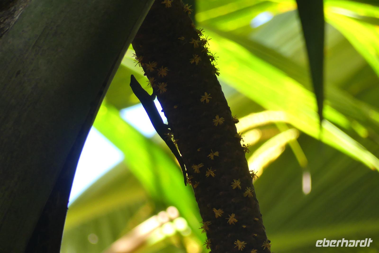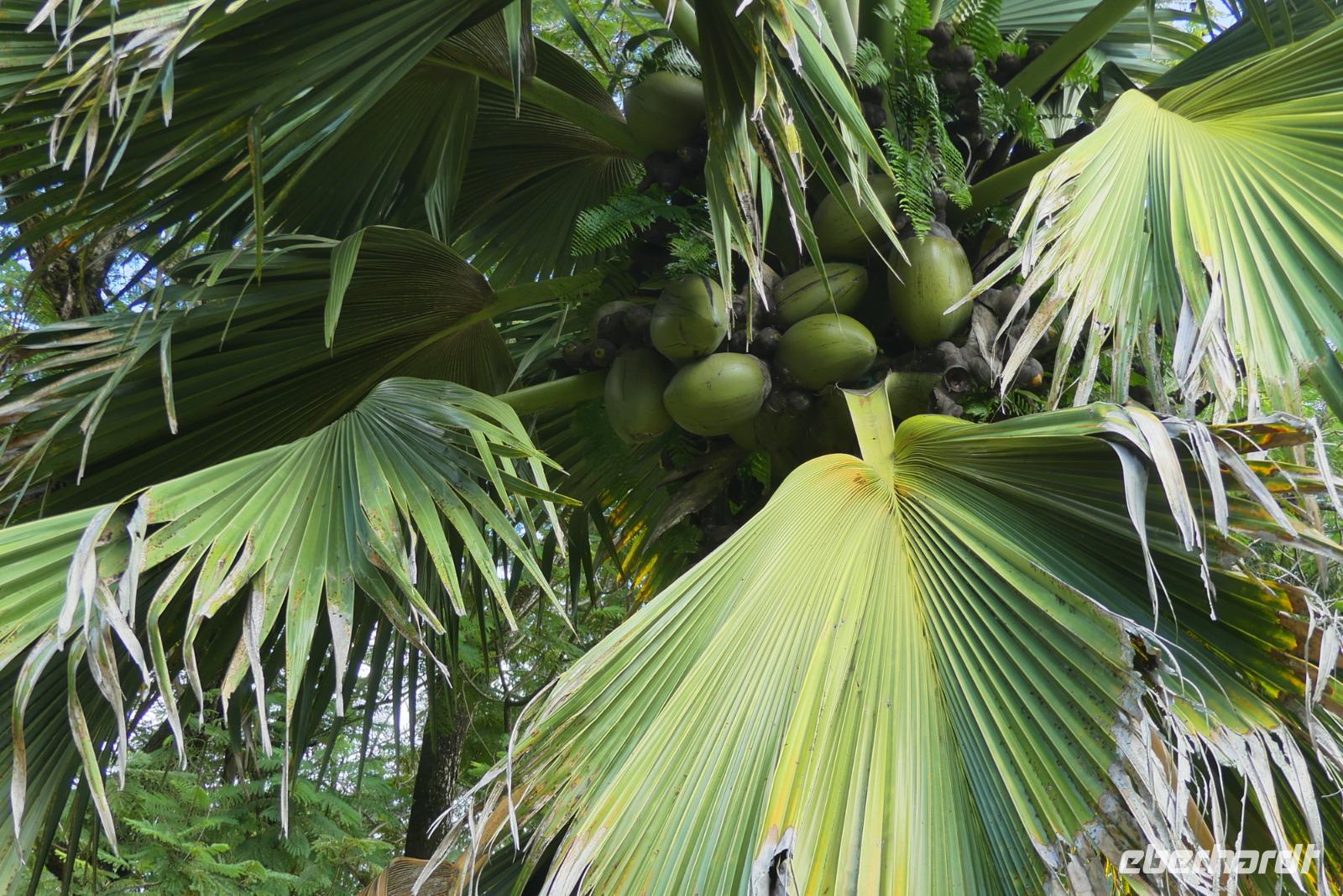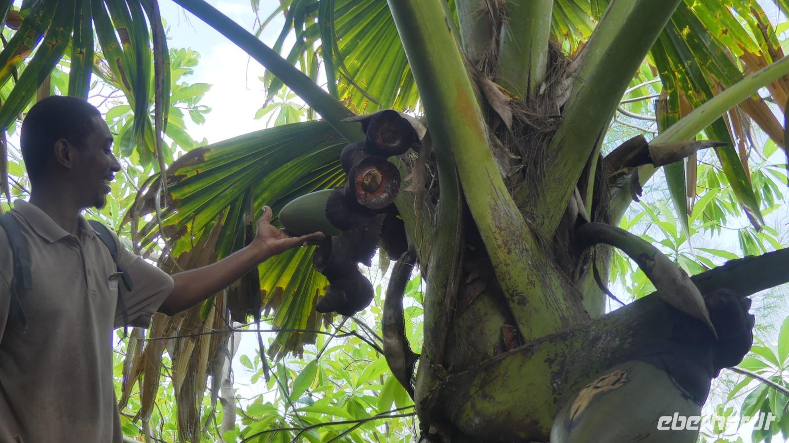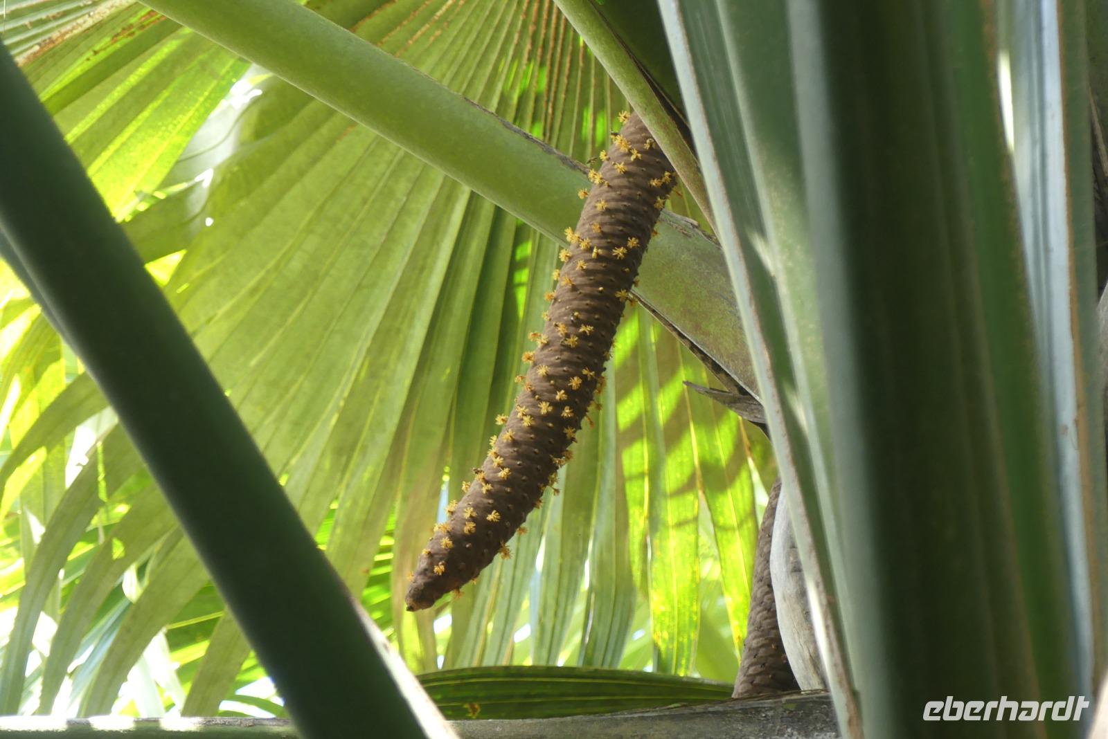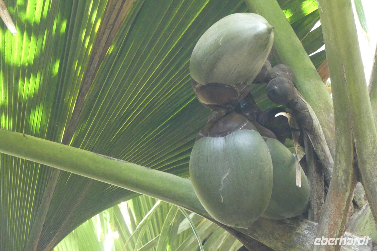 Zunächst sind wir im Nationalpark Vallée de Mai. Die riesigen Blätter der Coco de Mer bedecken über uns den Himmel fast vollständig. Es ist ein bizarrer Palmenwald, dominiert von der Coco de Mer, aber auch die anderen fünf heimischen Palmenarten sind hier vertreten. Das etwa 20 Hektar große Hochtal mit der urzeitlichen Seychellenpalme steht unter strengem Schutz und gehört seit 1983 zum UNESCO-Weltnaturerbe der Unesco. Nur hier auf Praslin und auf der Schwesterinsel Curieuse wächst die Coco de Mer. Die Coco de Mer hat erstaunliche Eigenschaften: erst nach rund 20 bis 25 Jahren Wachstum ist das Geschlecht der Palme erkennbar, gerade mal ein Blatt im Jahr wächst, dafür ist es abgesehen von der Konkurrenz auf Mauritius das größte im gesamten Pflanzenreich; nach der Befruchtung braucht der Samen ganze 6 bis 7 Jahren bis zur Reife, dann ist er aber der größte der Welt, bis 24 kg brachten Samen schon auf die Waage - Weltrekord, das schafft kein anderer Samen! Ein guter Grund für uns, ein ausgiebiges Fotoshooting gemeinsam mit einem Riesensamen zu machen.