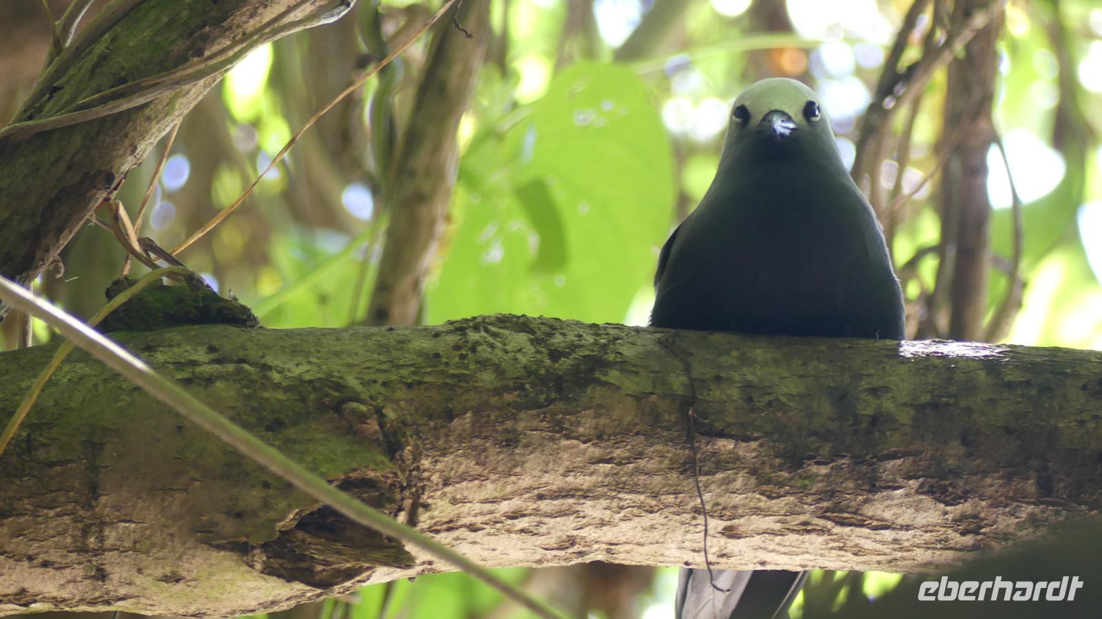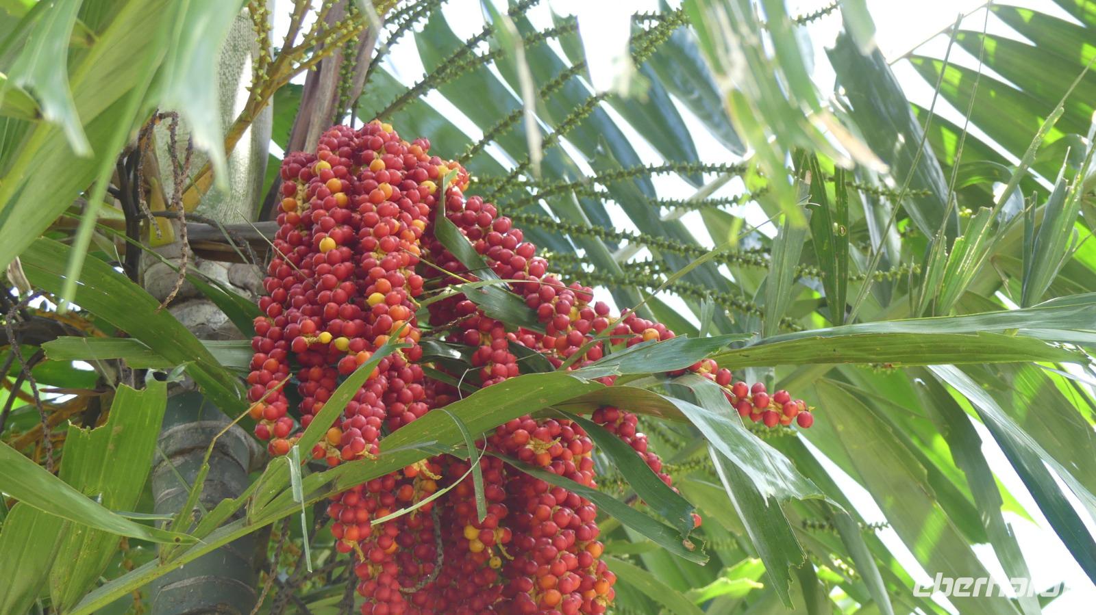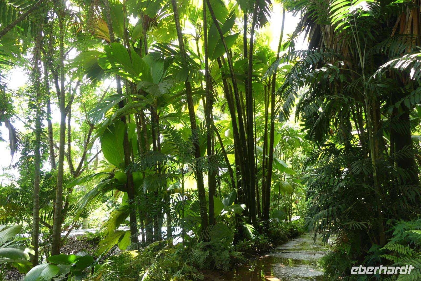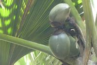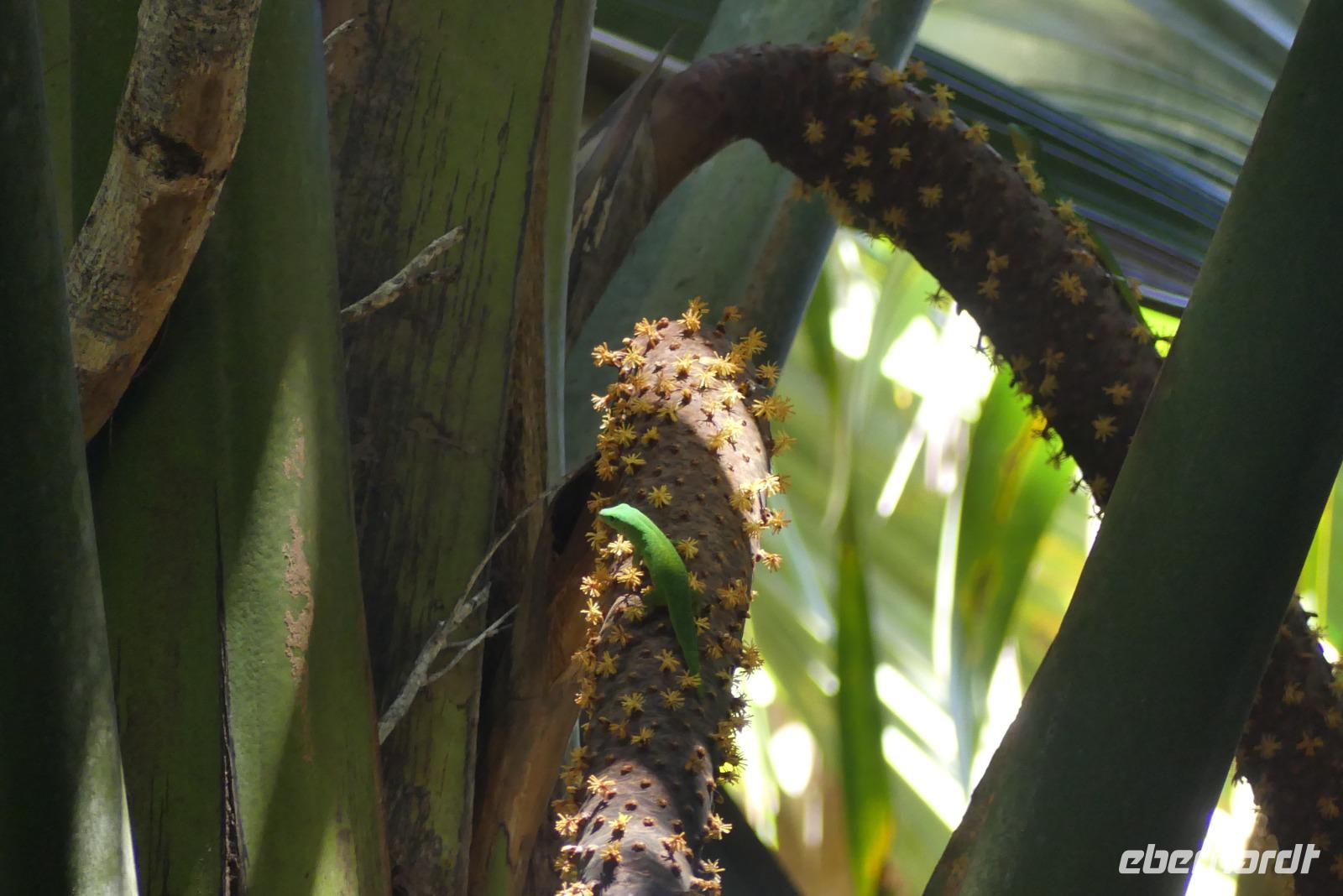 Zunächst sind wir im Nationalpark Vallée de Mai. Die riesigen Blätter der Coco de Mer bedecken über uns den Himmel fast vollständig. Es ist ein bizarrer Palmenwald, dominiert von der Coco de Mer, aber auch die anderen fünf heimischen Palmenarten sind hier vertreten. Das etwa 20 Hektar große Hochtal mit der urzeitlichen Seychellenpalme steht unter strengem Schutz und gehört seit 1983 zum UNESCO-Weltnaturerbe der Unesco. Nur hier auf Praslin und auf der Schwesterinsel Curieuse wächst die Coco de Mer. Die Coco de Mer hat erstaunliche Eigenschaften: erst nach rund 20 bis 25 Jahren Wachstum ist das Geschlecht der Palme erkennbar, gerade mal ein Blatt im Jahr wächst, dafür ist es abgesehen von der Konkurrenz auf Mauritius das größte im gesamten Pflanzenreich; nach der Befruchtung braucht der Samen ganze 6 bis 7 Jahren bis zur Reife, dann ist er aber der größte der Welt, bis 24 kg brachten Samen schon auf die Waage - Weltrekord, das schafft kein anderer Samen! Ein guter Grund für uns, ein ausgiebiges Fotoshooting gemeinsam mit einem Riesensamen zu machen.