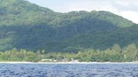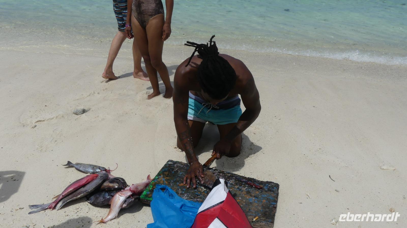 Mit Sister ist die Insel Grand Soeur, große Schwester der Nachbarinsel Petite Soeur gemeint. Landschaftlich reizvoll sind die parallel zueinander verlaufenden Strände an der Ost- und Westküste, getrennt durch einen schmalen Landstreifen von ca. 250 m. Darauf wachsen Kokospalmen und ein paar Riesenschildkröten leben hier. Wir landen am Weststrand, gut geeignet zum Schnorcheln, denn es gibt relativ viele Fische, darunter Fledermausfische die im flachen Wasser dicht an den Strand kommen. Kleine Haifische schwimmen ebenfalls dicht an den Strand, als unser Fisch zum Grillen vorbereitet wird und die Abfälle vom Fisch im Meer entsorgt werden.