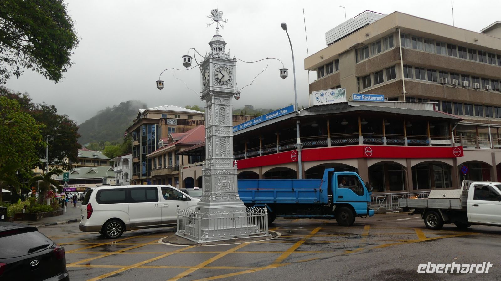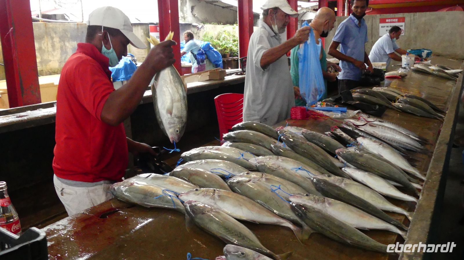 Frisch geduscht und neu eingekleidet in leichter Sommerkleidung brechen wir ganz entspannt nach Victoria auf, der kleinsten Hauptstadt unter den UN-Mitgliedsstaaten. Das Wetter ist allerdings wechselhaft, die Regenschauer häufen sich. Darauf waren wir jetzt nicht so richtig eingestellt, aber wir machen das Beste draus. Unseren kleinen Stadtrundgang beginnen wir in der Nähe des „Big Ben“, einer Miniaturausgabe des großen Originals in London und Wahrzeichen Victorias, welcher auf der Kreuzung der beiden Hauptverkehrsstraßen aufgestellt ist. Auf dem Markt werden Fisch, Obst wie Mangos, Papaya, Bananen und Kokosnüsse sowie Gewürze wie zum Beispiel Zimt, Vanille und verschiedene Currys angeboten. Vieles stammt aus der Region, doch manches wird auch preiswert aus Madagaskar importiert. Zum Glück ist der Markt weitgehend überdacht, so dass uns der Regen zumindest hier nicht stört. Anschließend besuchen wir noch die katholische Kathedrale.