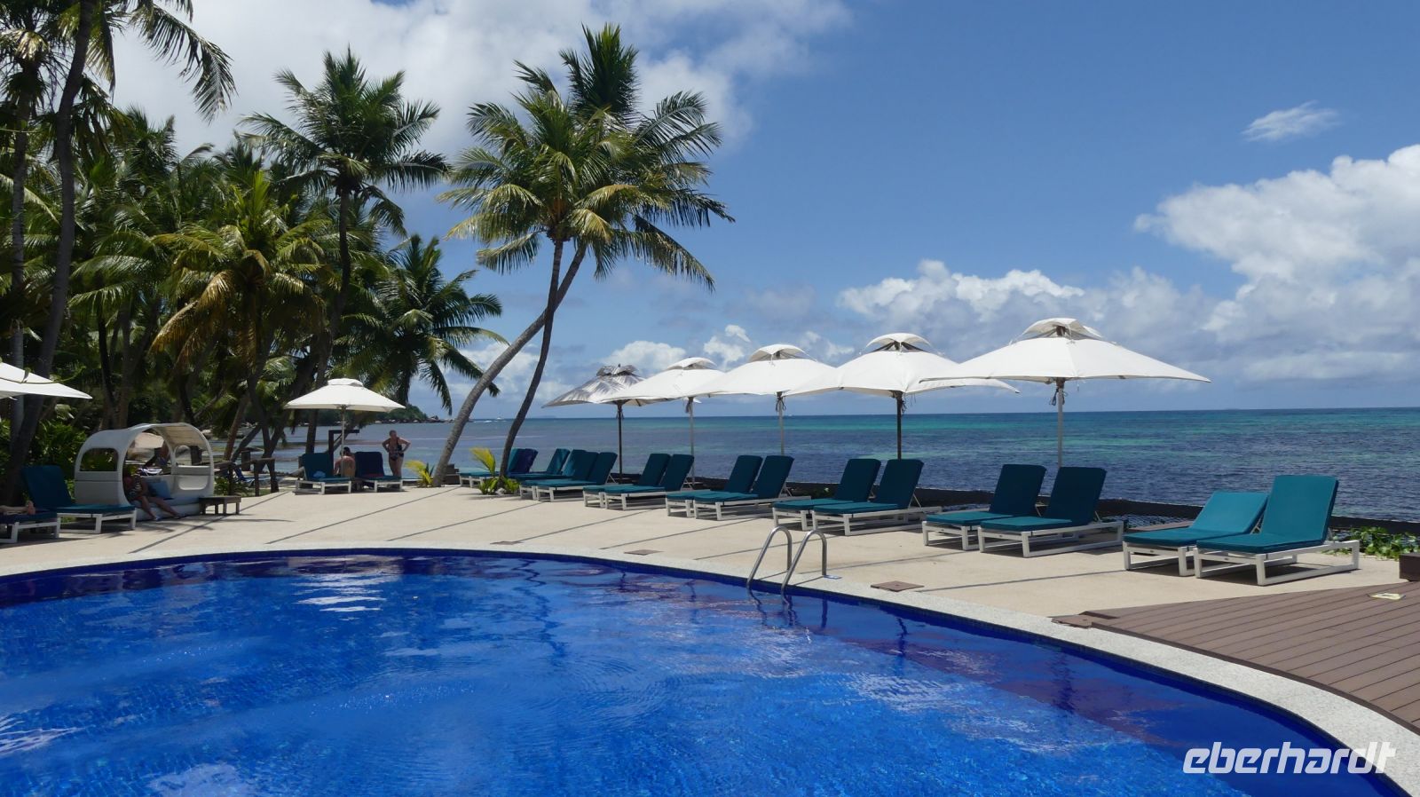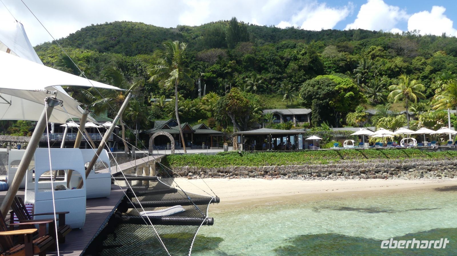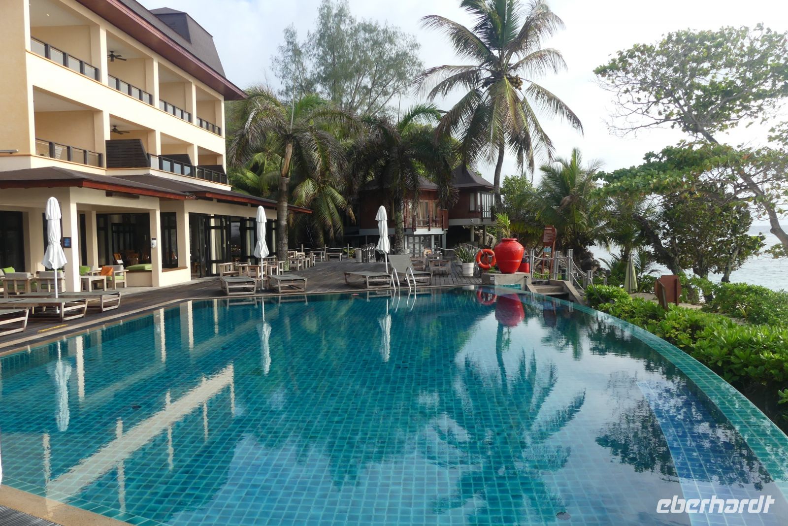In der Hotelanlage kann man sich sehr gut an einem der Pools entspannen. Das Coco de Mer Hotel hat einen Süßwasser- und einen Salzwasserpool. Letzterer befindet sich auf der Steganlage unter weißen Segeldächern, ist gekühlt und bietet den perfekten Blick auf den Sonnenuntergang. Auch die ca. 80 Hektar große Gartenanlage will erkundet sein. Coco de Mer Palmen, Kokospalmen, Mangobäume, Hibiskussträucher u. v. m. zieren die Anlage.