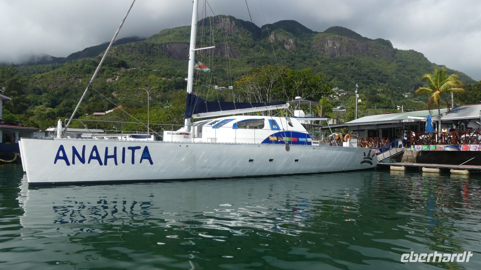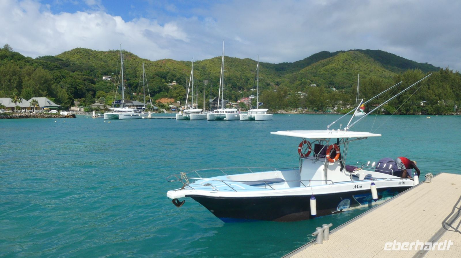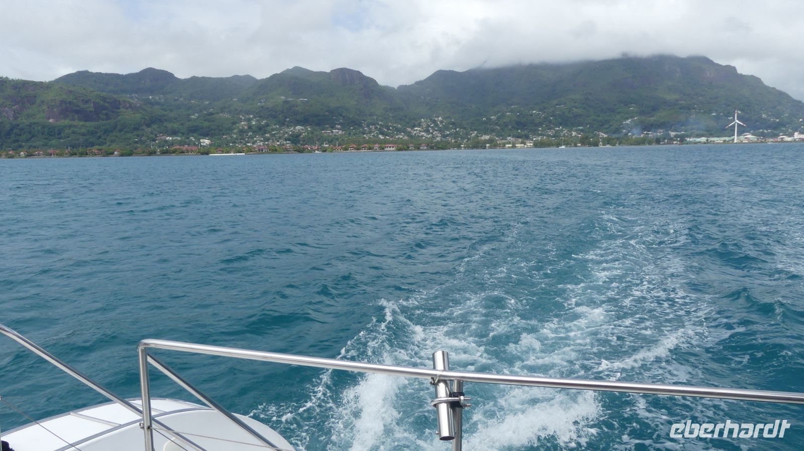 Heute ist der Regen vorbei, ein Sonne-/Wolkenmix wird uns durch den Tag begleiten. Unseren ersten Bootsausflug dieser Reise unternehmen wir mit dem Katamaran „Anahita“. Dieser liegt in der Marina von Victoria, im Hintergrund befinden sich malerisch die höchsten Berge der Seychellen. Betreten des Katamarans ist nur barfuß erlaubt. Die Schuhe werden beim Einsteigen abgegeben. Ziel unseres Ausflugs ist der Saint Anne Marine Nationalpark, eine geschützte Inselgruppe vor Victoria. Unterwegs füttern wir zunächst Fische – es kommen viele Zebra- und einige Batfische (auch Fledermausfisch oder Platax genannt). Bei einer Glasbodenfahrt können wir Fische und Korallen beobachten, allerdings sind viele Korallen abgestorben infolge hoher Wassertemperaturen (El Niño) abgestorben. Aufgrund der kürzlichen Regenfälle ist auch die Sicht unter Wasser eingeschränkt. Auch beim anschließenden Schnorcheln im 27 Grad warmen Wasser beobachten wir zahlreiche Fische.