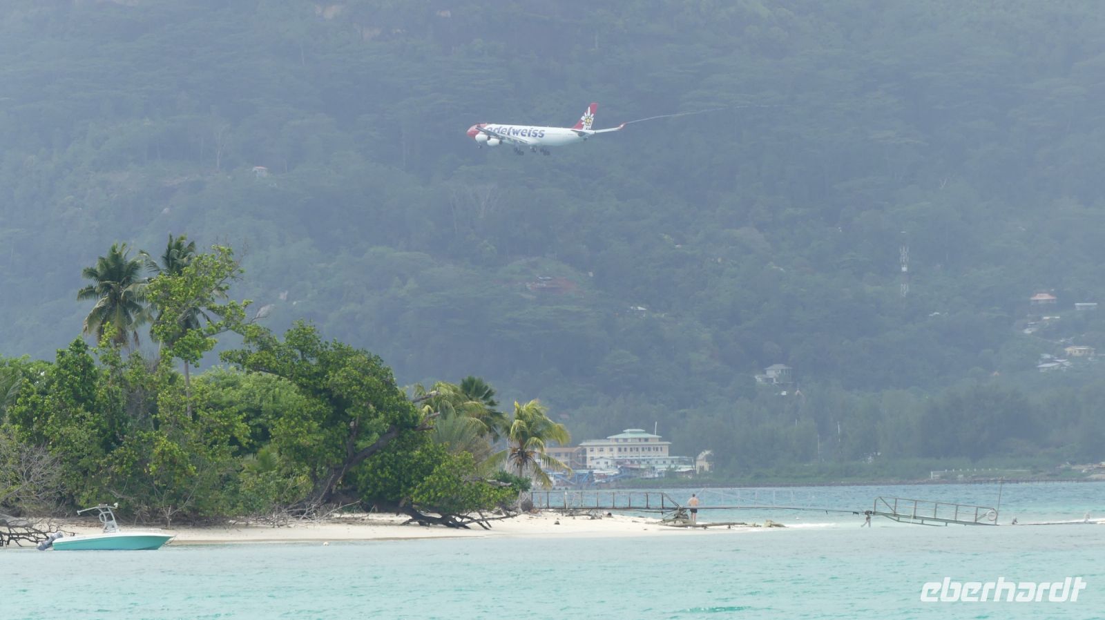 Am frühen Morgen erreichen wir nach 9 Stunden und 40 Minuten Flugzeit Mahé, die Hauptinsel der Seychellen. Auf dem Rollfeld wird unser Flieger mit Wasserfontänen der Feuerwehr begrüßt – das Ritual für einen ankommenden Erstflug. Auch das Fernsehen ist am Flughafen, filmt unsere Ankunft und fragt mich, ob ich ein kurzes interview gemeinsam mit einem Gast geben möchte, was ich natürlich gern tue. Schon dieser Empfang zeigt, wie groß hier die Freude ist, dass wieder Touristen die Seychellen besuchen. Und ich kann jetzt schon sagen, dass uns diese Freude der Seychellos die gesamte Reise begleiten wird.