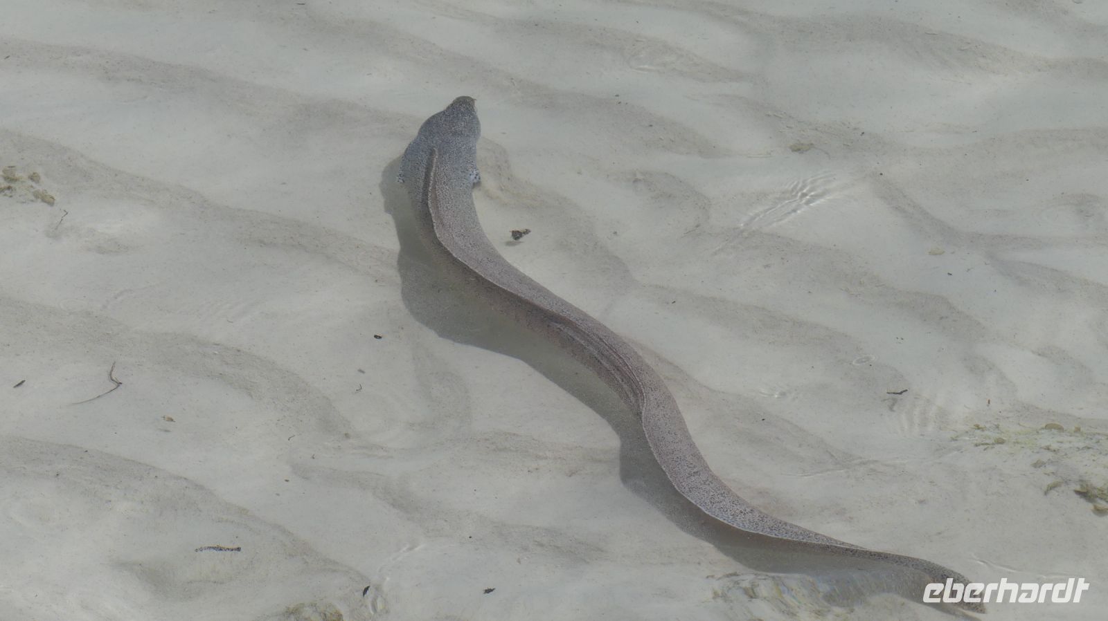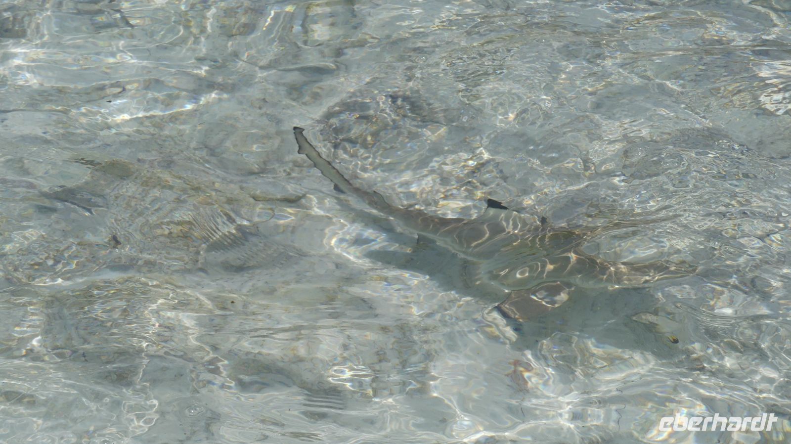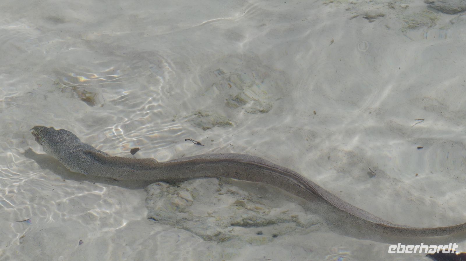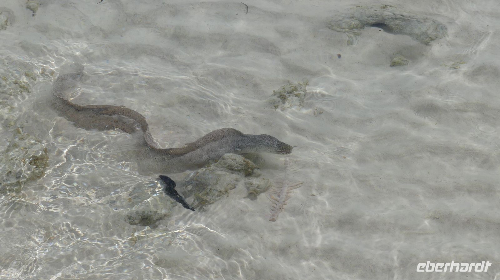 Nach dem Umsteigen auf ein kleineres Boot landen wir am Weststrand. Hier befindet sich ein Riff zum Schnorcheln und das Schwimmen ist ungefährlich. Wir verbringen hier mehrere Stunden. Unsere Bootsbesatzung bereitet inzwischen das Mittagessen vor. Frischer Fisch gegrillt ist natürlich auch dabei. Die Essenreste bekommen die Fische. Das sind vor allem die Fledermausfische (Batfisch), die im flachen Wasser dicht an den Strand kommen. Auch kleine Haifische (Schwarzspitzen-Riffhai) kommen ebenfalls dicht an den Strand. Außerdem sehen wir 2 Seeaale (auch Meeraal).