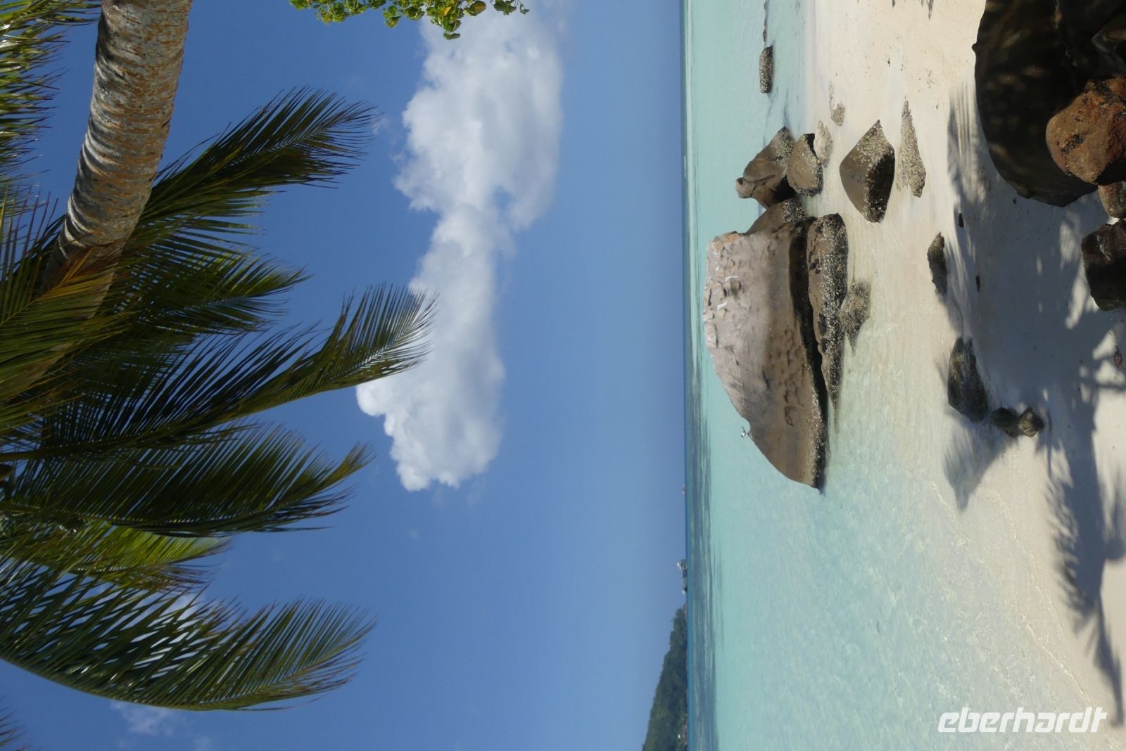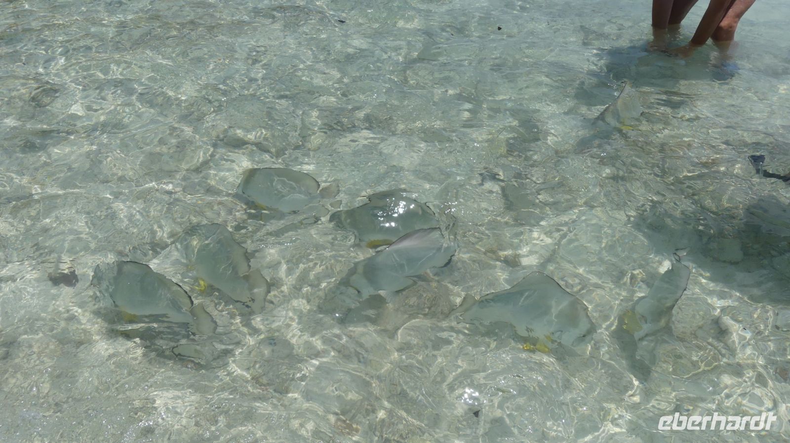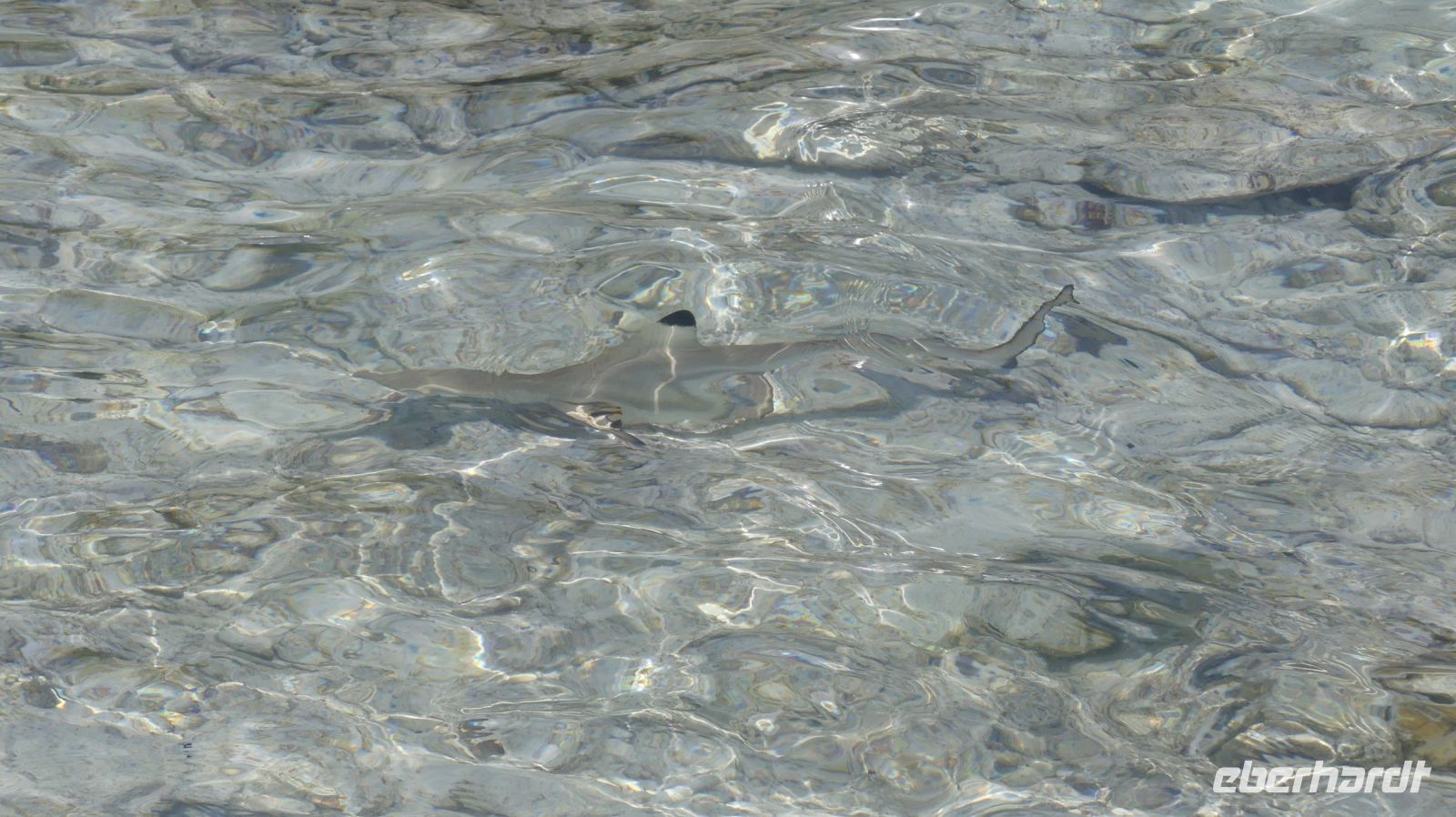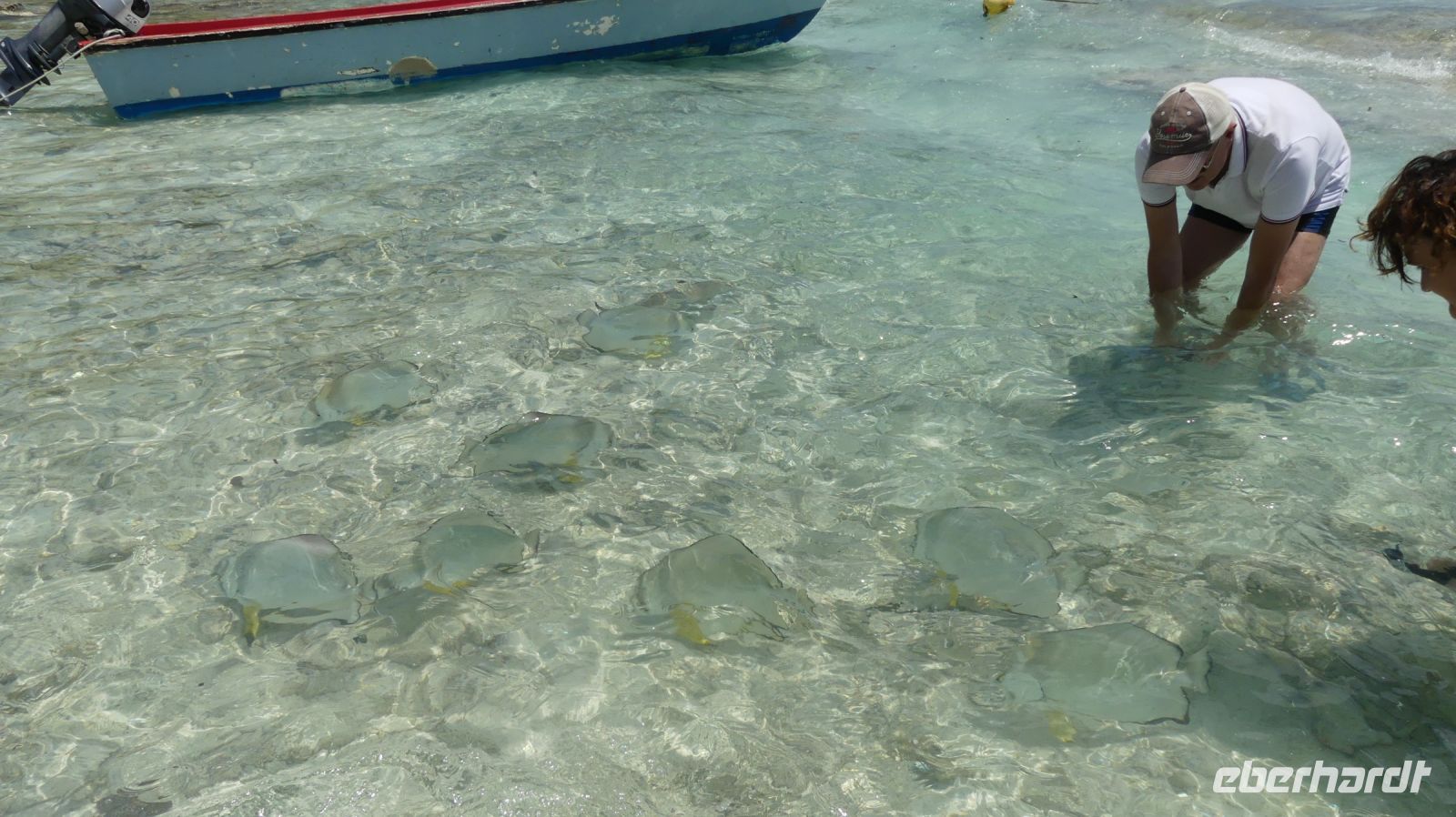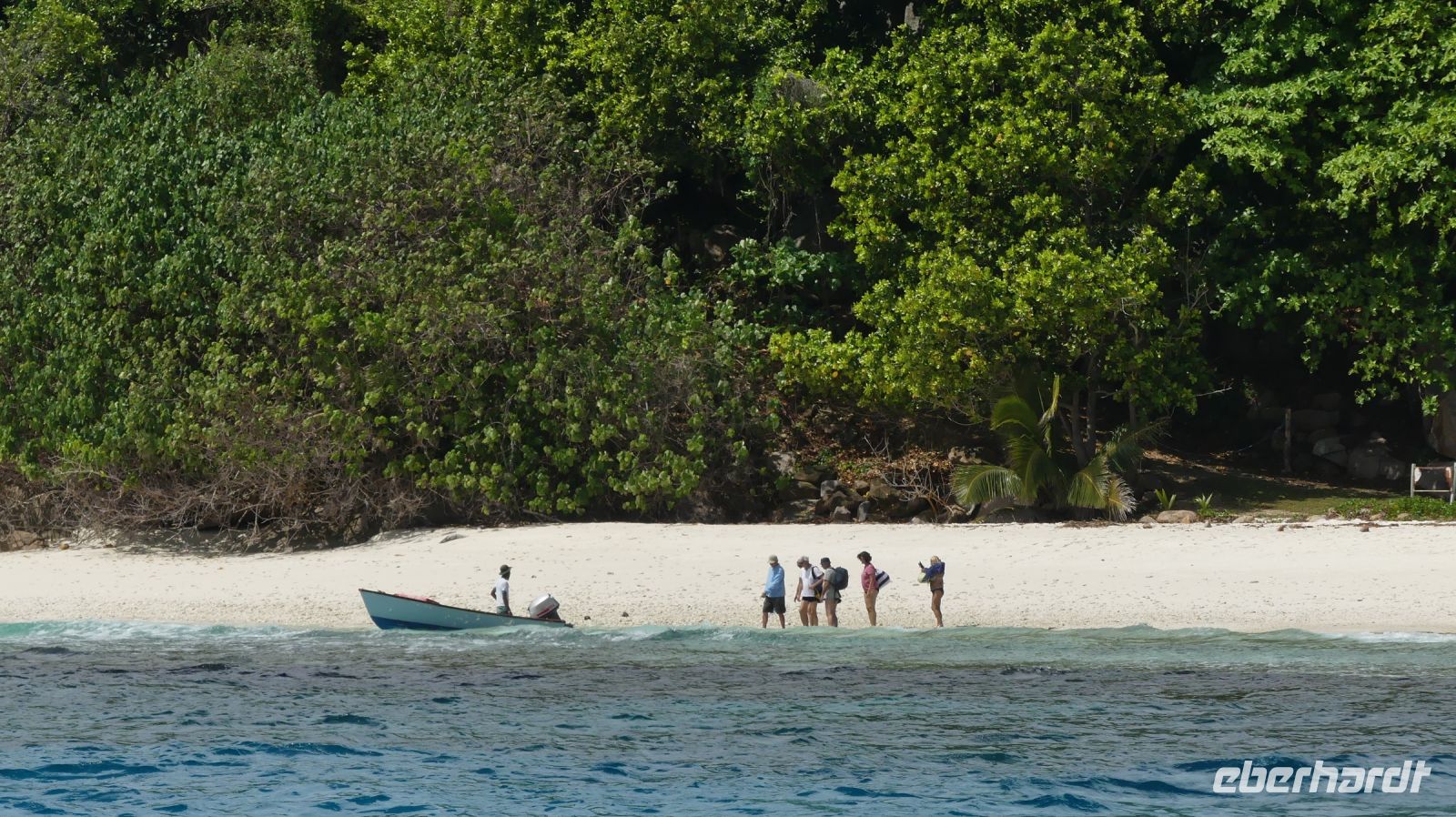 Nach dem Umsteigen auf ein kleineres Boot landen wir am Weststrand. Hier befindet sich ein Riff zum Schnorcheln und das Schwimmen ist ungefährlich. Wir verbringen hier mehrere Stunden. Unsere Bootsbesatzung bereitet inzwischen das Mittagessen vor. Frischer Fisch gegrillt ist natürlich auch dabei. Die Essenreste bekommen die Fische. Das sind vor allem die Fledermausfische (Batfisch), die im flachen Wasser dicht an den Strand kommen. Auch kleine Haifische (Schwarzspitzen-Riffhai) kommen ebenfalls dicht an den Strand. Außerdem sehen wir 2 Seeaale (auch Meeraal).