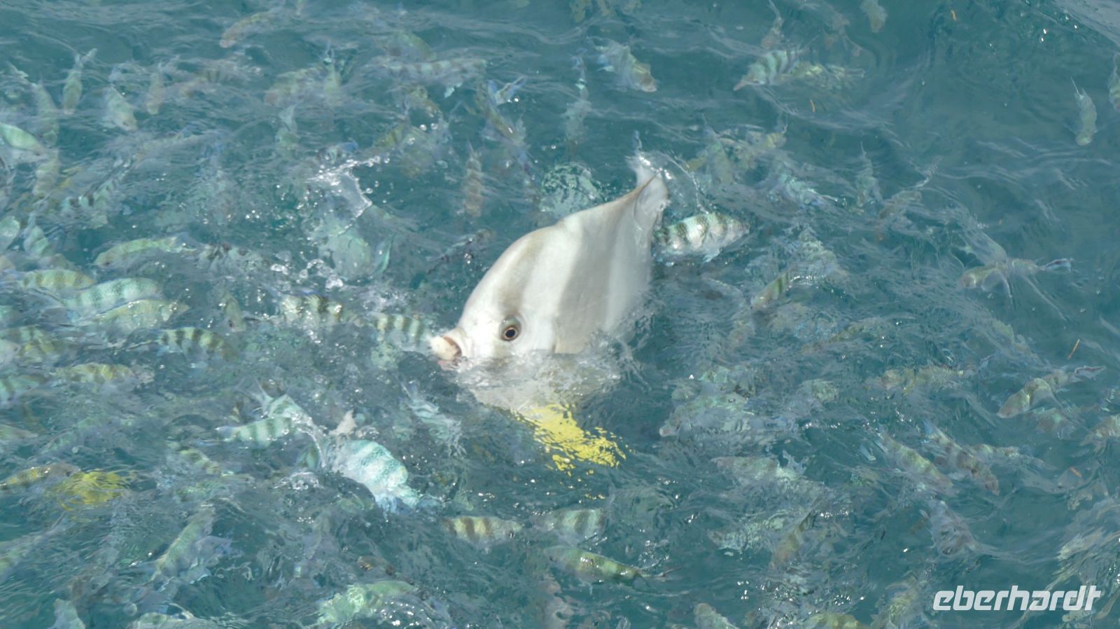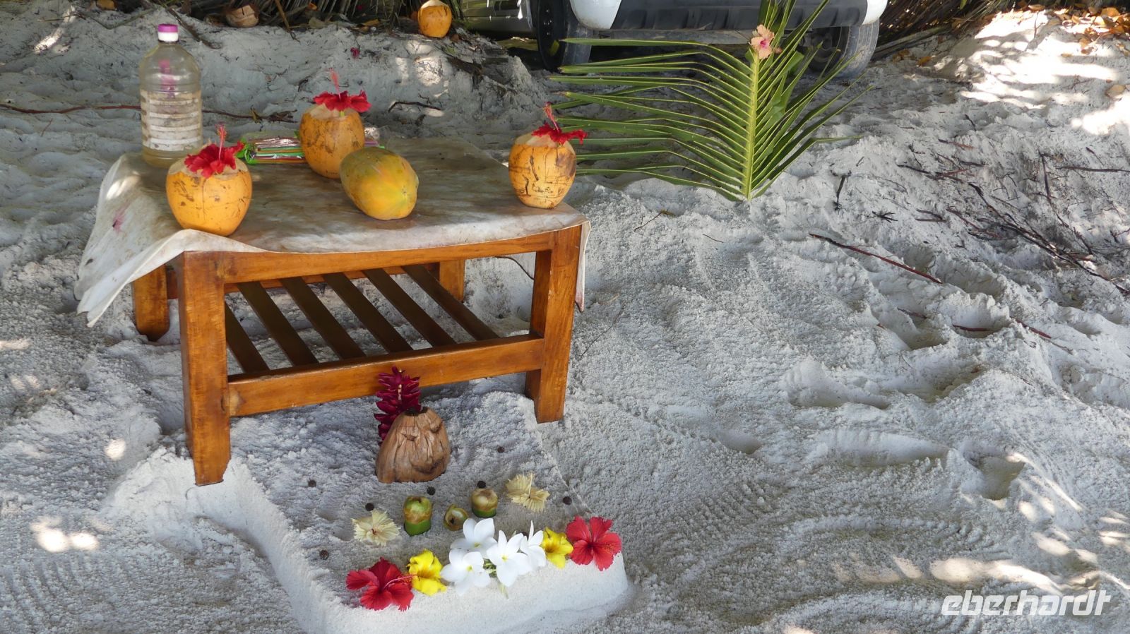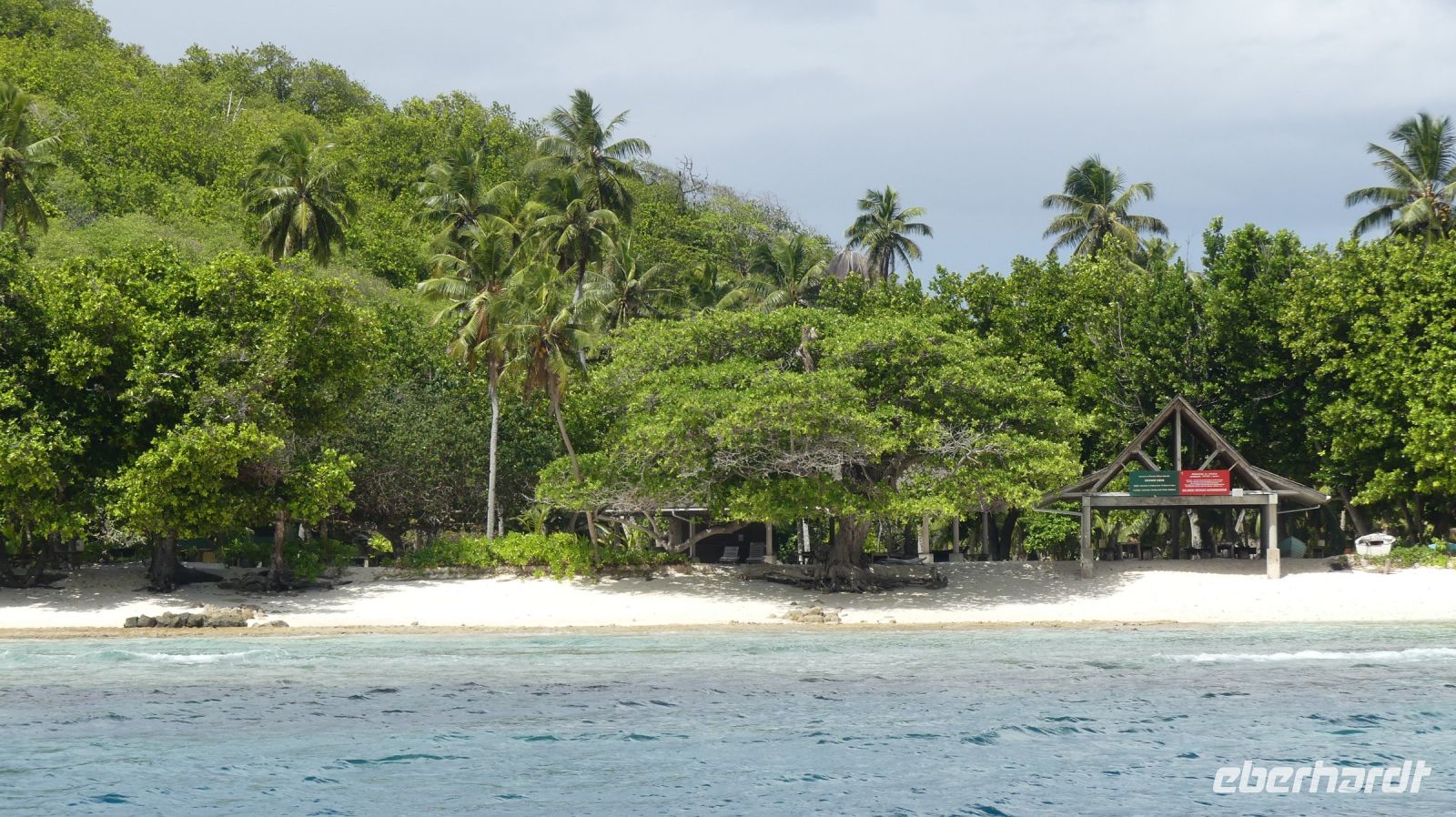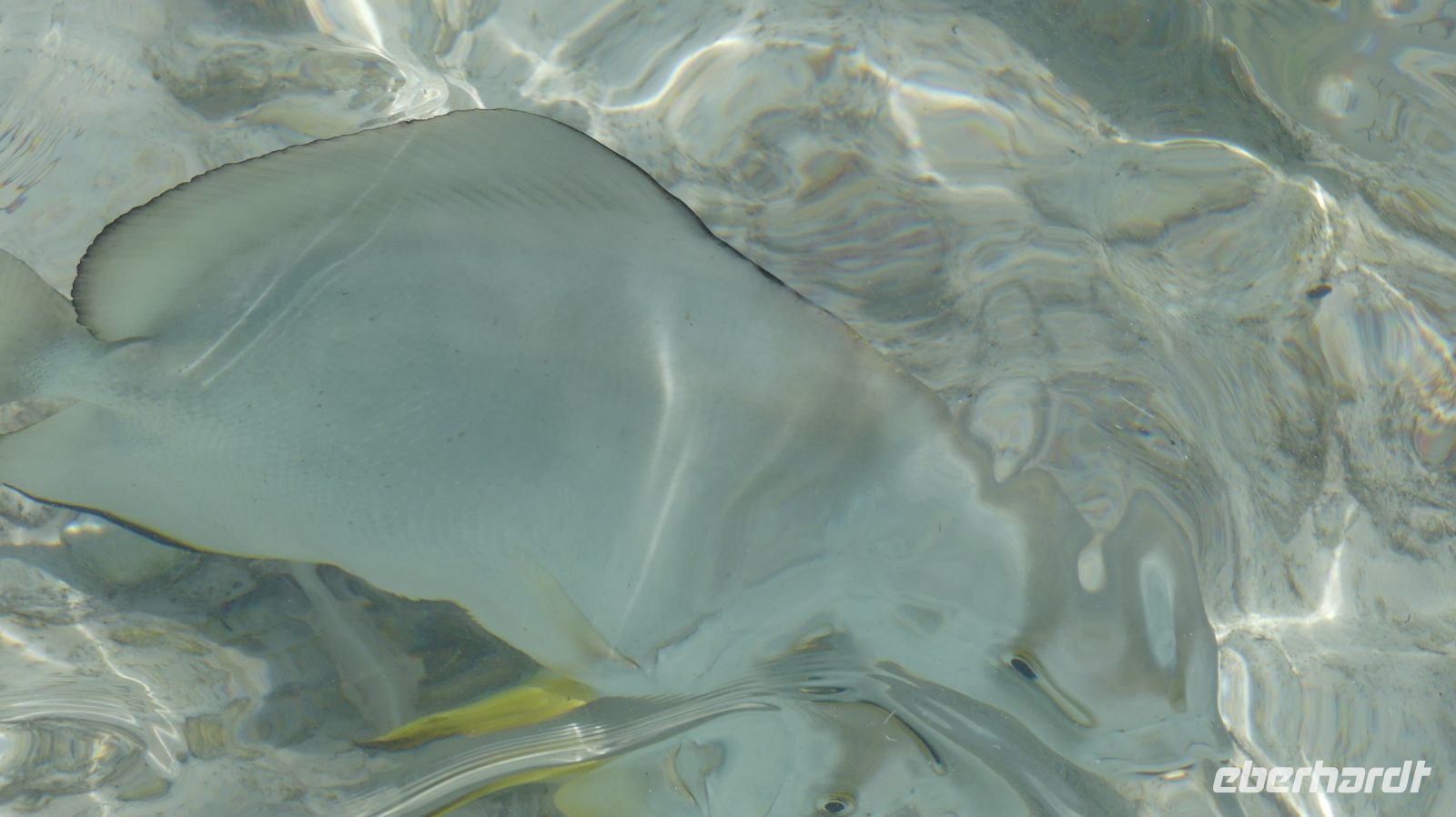 Nach dem Umsteigen auf ein kleineres Boot landen wir am Weststrand. Hier befindet sich ein Riff zum Schnorcheln und das Schwimmen ist ungefährlich. Wir verbringen hier mehrere Stunden. Unsere Bootsbesatzung bereitet inzwischen das Mittagessen vor. Frischer Fisch gegrillt ist natürlich auch dabei. Die Essenreste bekommen die Fische. Das sind vor allem die Fledermausfische (Batfisch), die im flachen Wasser dicht an den Strand kommen. Auch kleine Haifische (Schwarzspitzen-Riffhai) kommen ebenfalls dicht an den Strand. Außerdem sehen wir 2 Seeaale (auch Meeraal).
