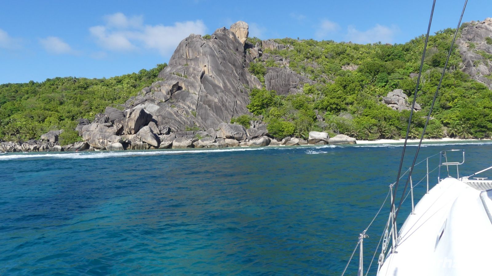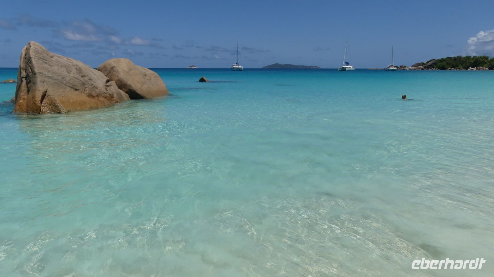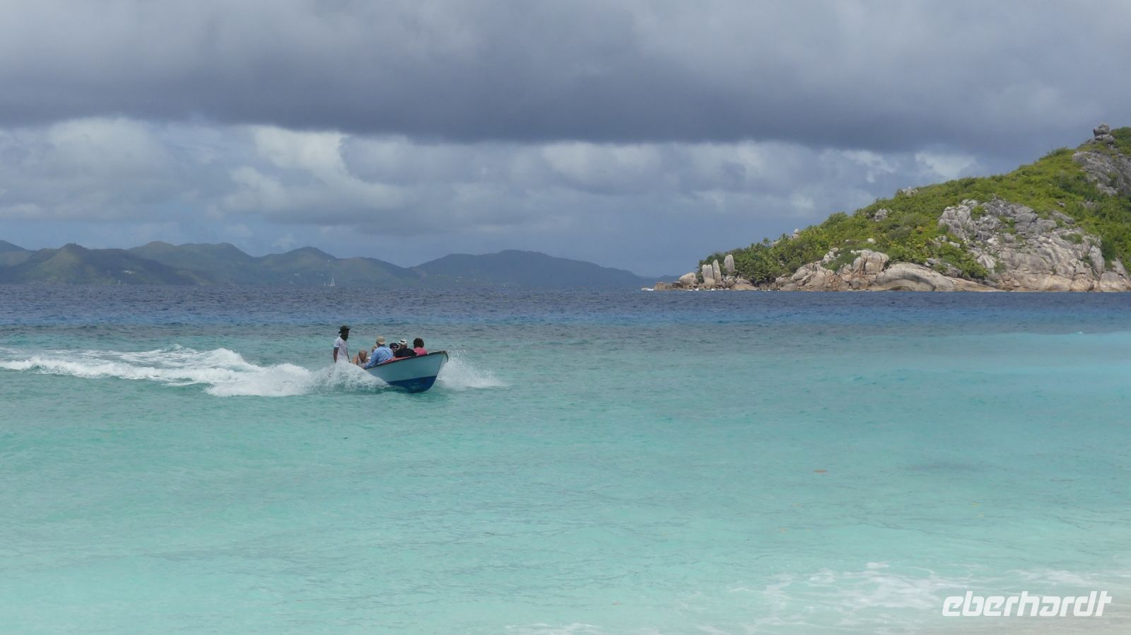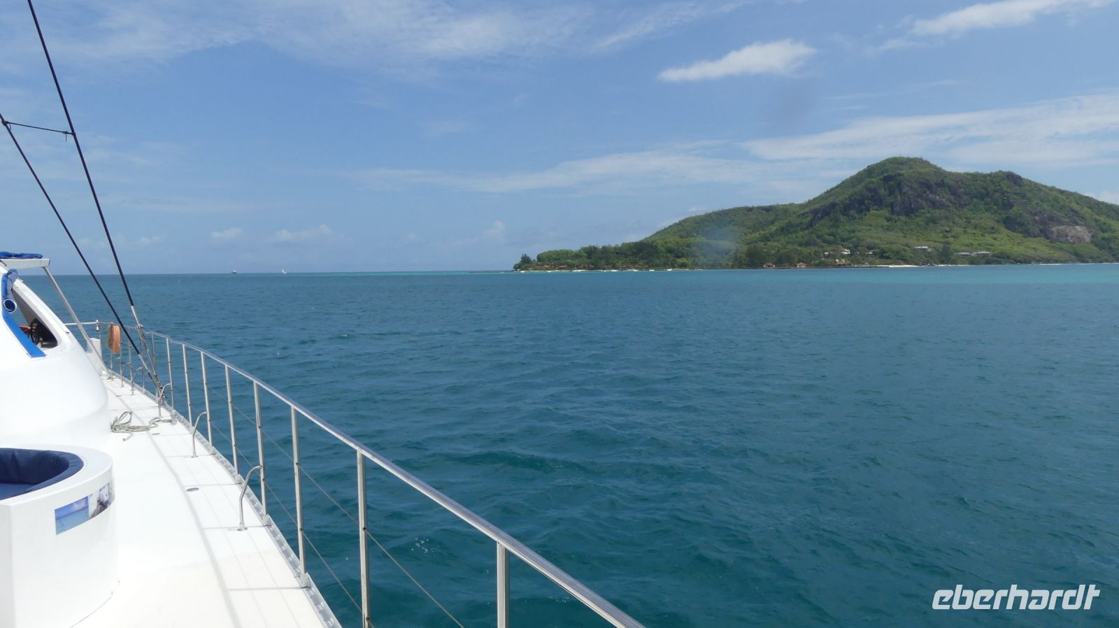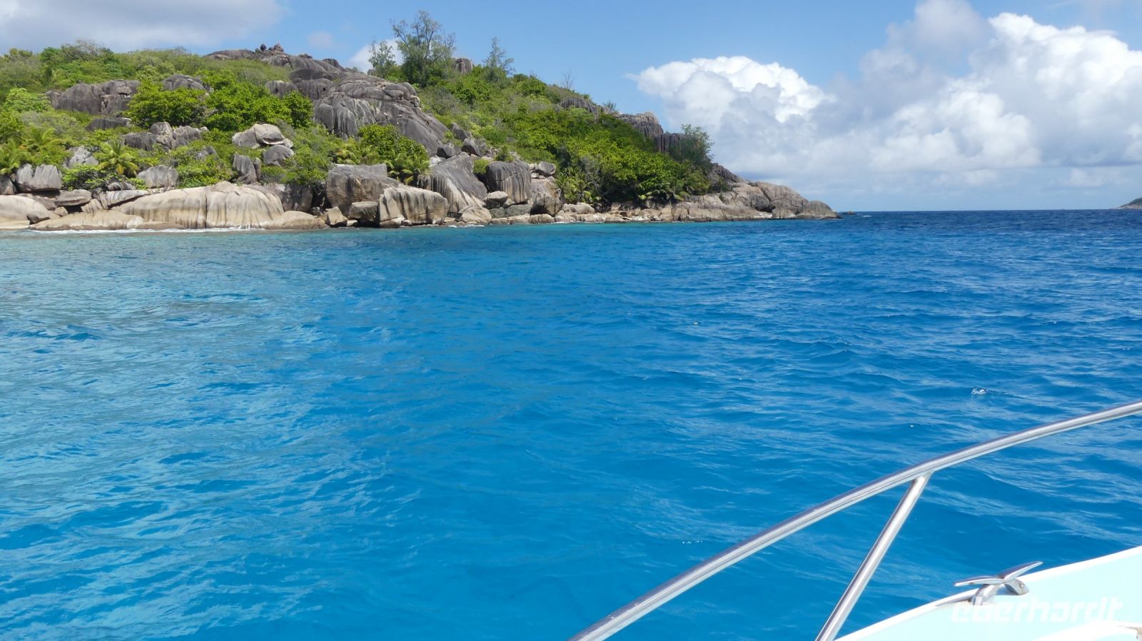 Nach dem Mittagessen kehren wir zu unserem Katamaran zurück und nutzen diesen den ganzen Nachmittag. In der Nähe des Anse Severe schnorcheln wir vom Katamaran aus, ein guter Fleck mit schönen nachgewachsenen Korallen und vielen tropischen Fischen, Barrakudas und einem Rochen. Sehr schön ist die Umrundung von La Digue mit einer weiteren Schnorchel-/Schwimmpause.