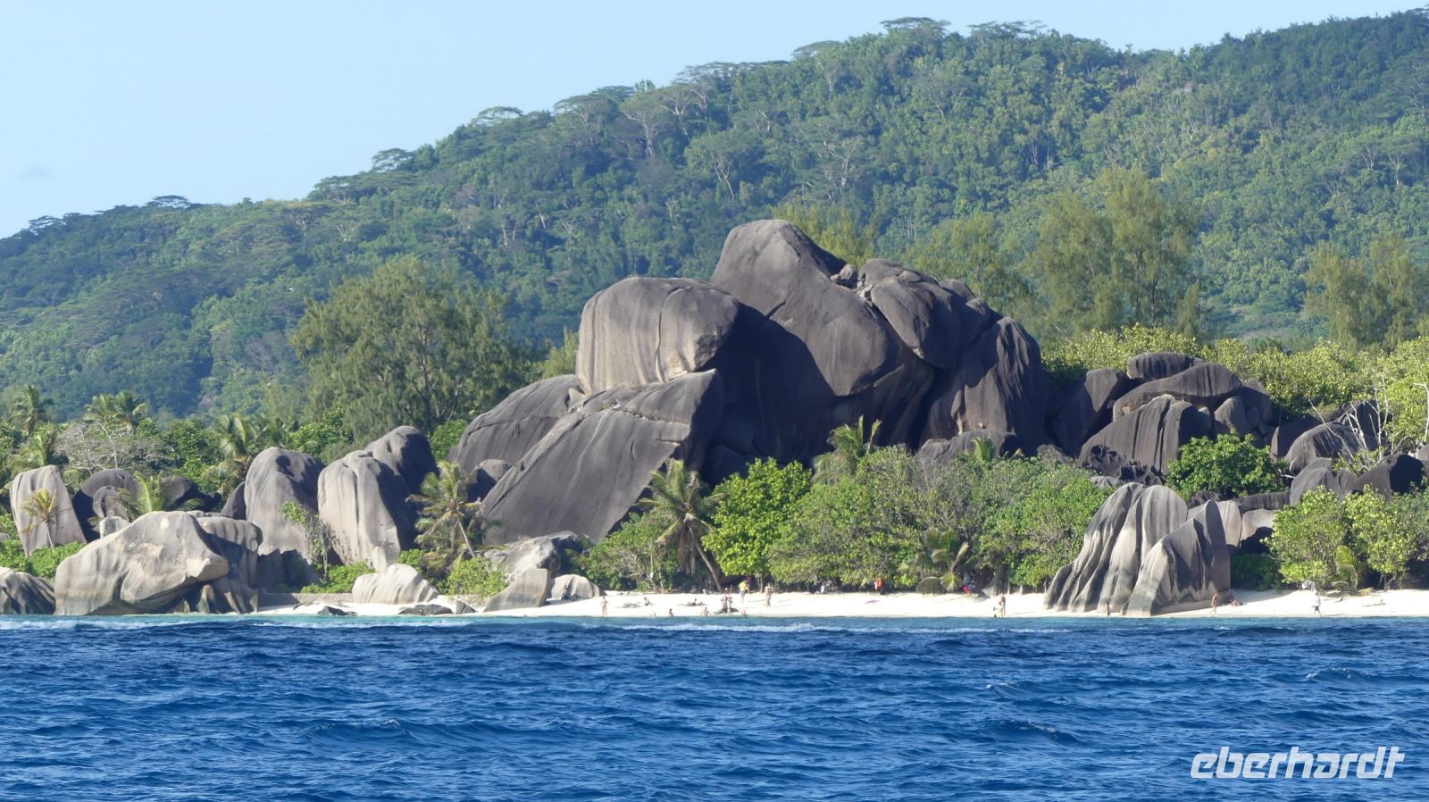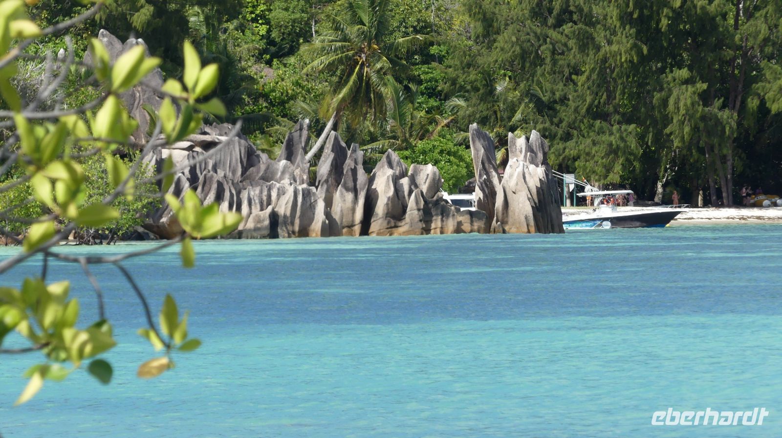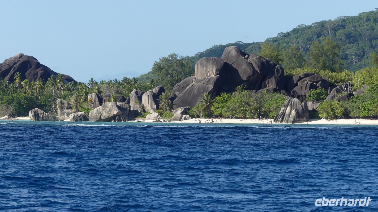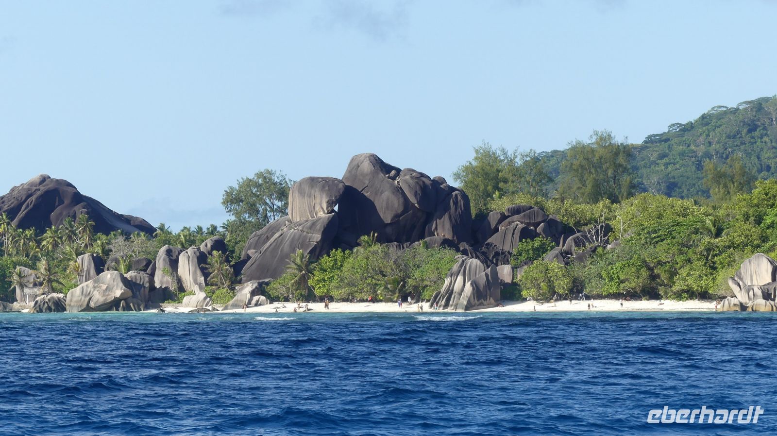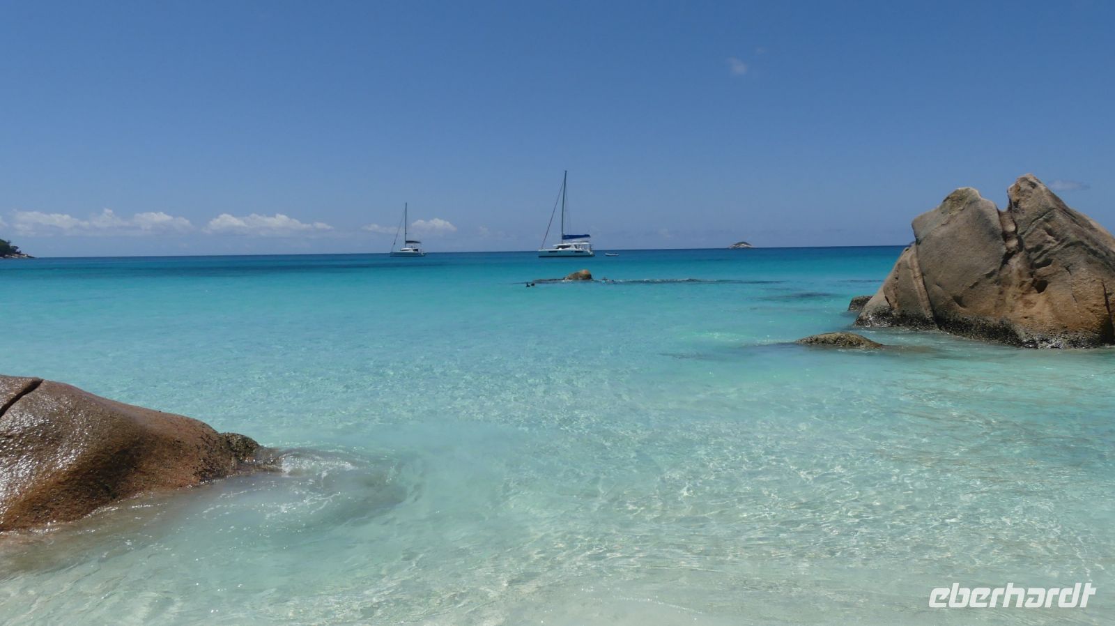 Nach dem Mittagessen kehren wir zu unserem Katamaran zurück und nutzen diesen den ganzen Nachmittag. In der Nähe des Anse Severe schnorcheln wir vom Katamaran aus, ein guter Fleck mit schönen nachgewachsenen Korallen und vielen tropischen Fischen, Barrakudas und einem Rochen. Sehr schön ist die Umrundung von La Digue mit einer weiteren Schnorchel-/Schwimmpause.