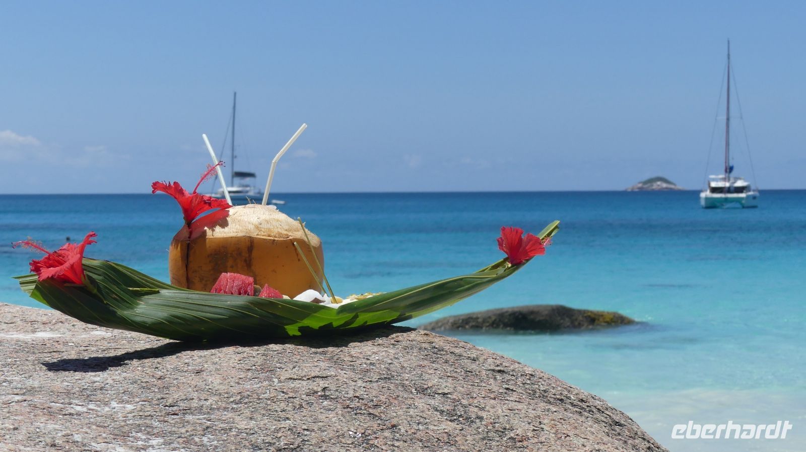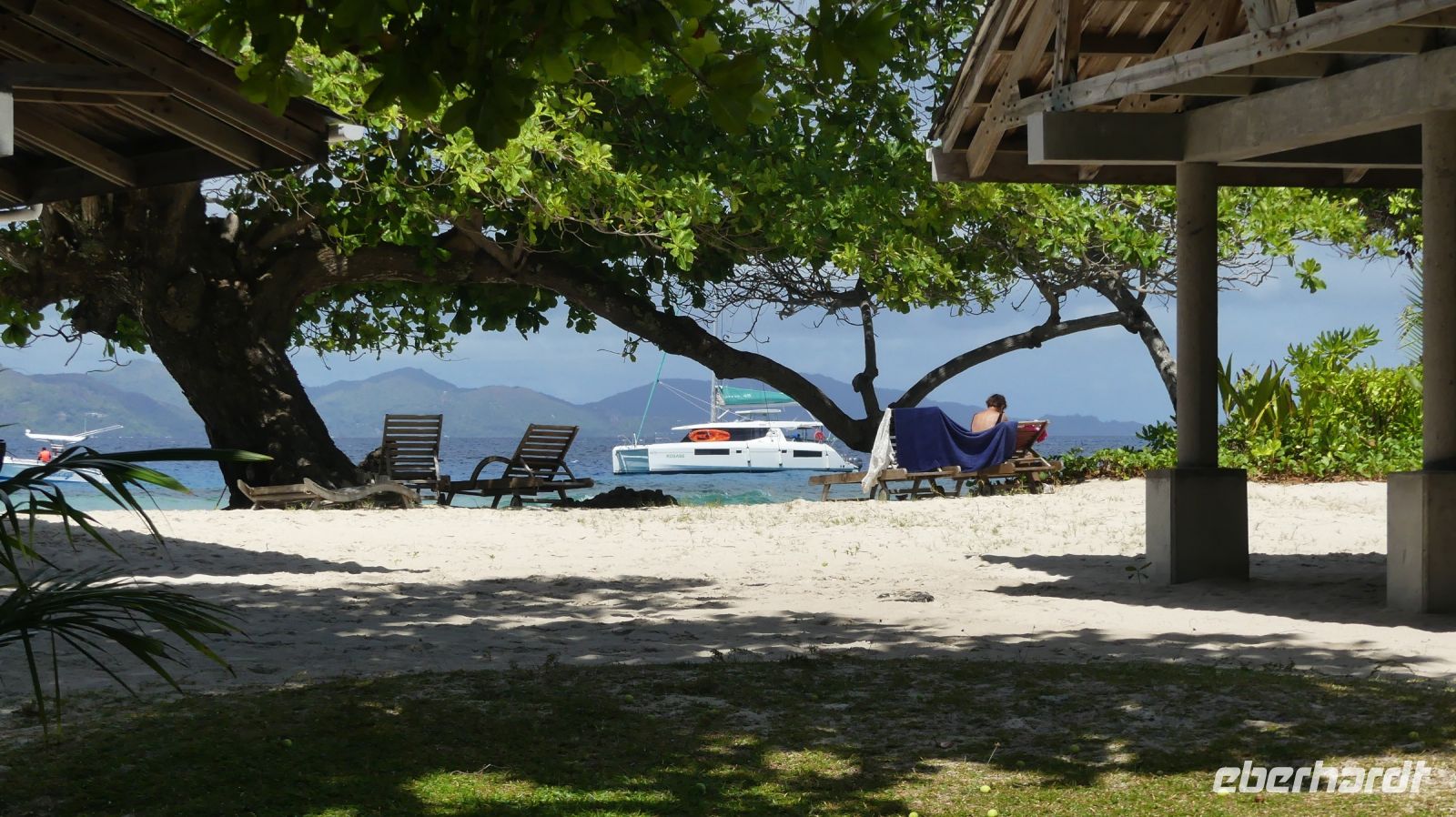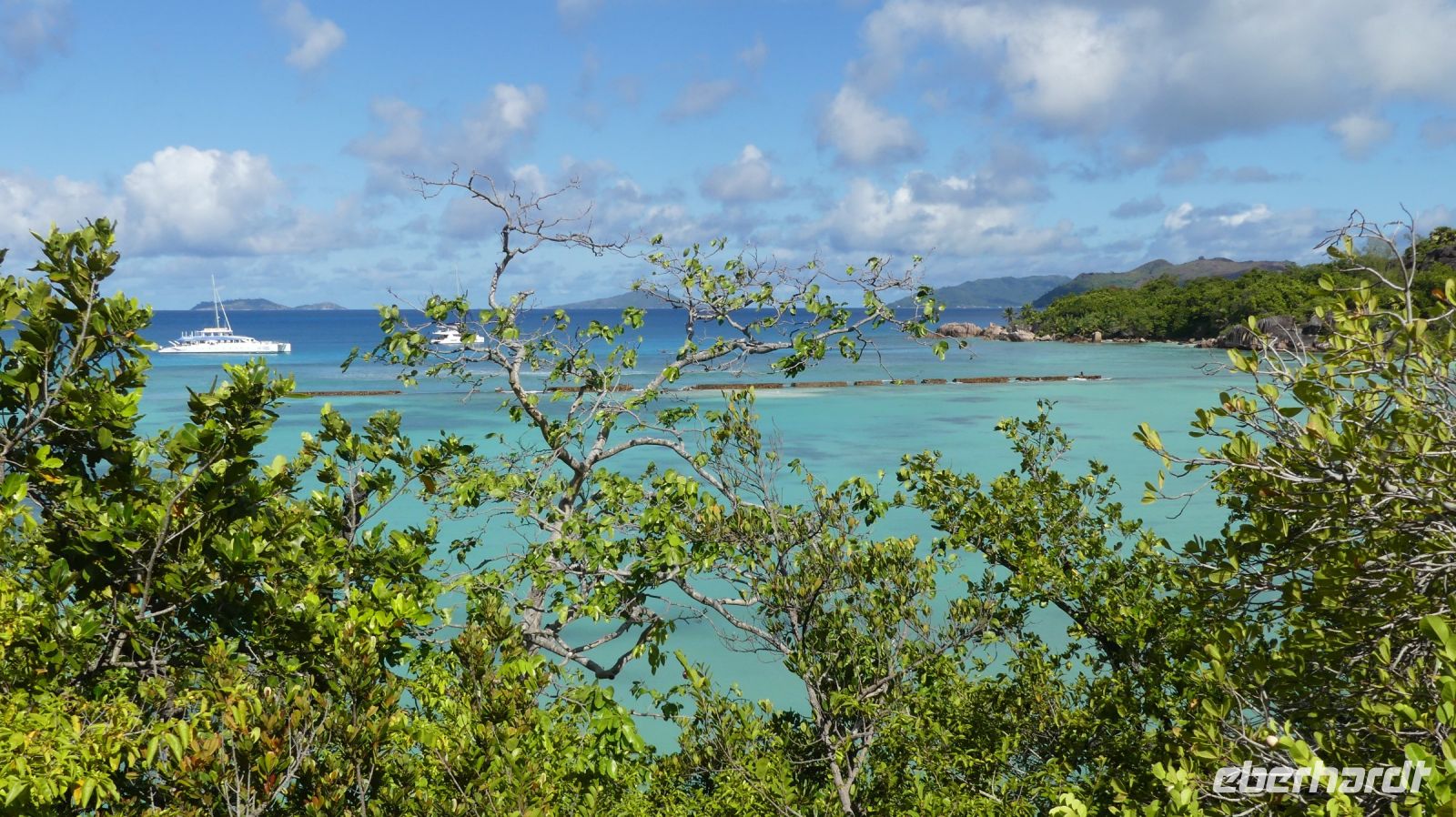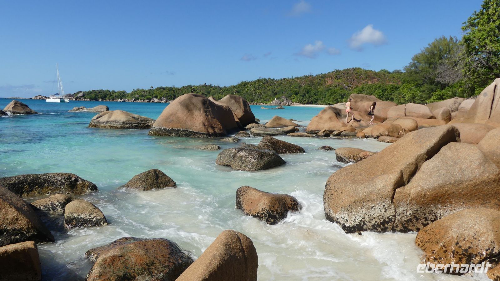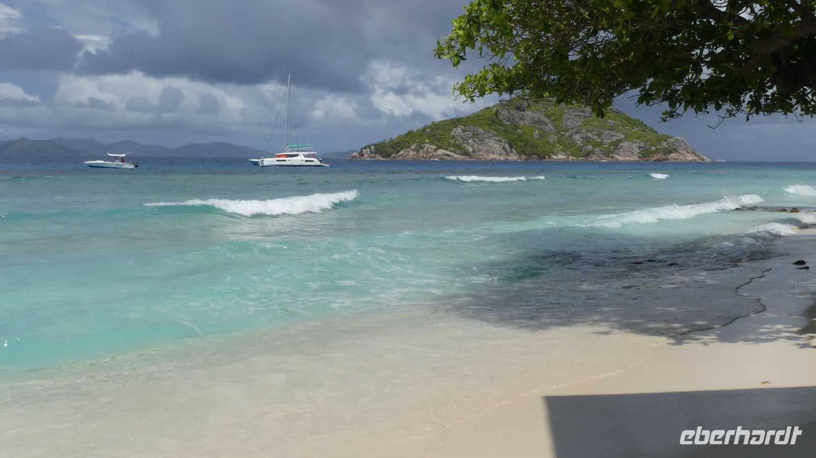 Nach dem Mittagessen kehren wir zu unserem Katamaran zurück und nutzen diesen den ganzen Nachmittag. In der Nähe des Anse Severe schnorcheln wir vom Katamaran aus, ein guter Fleck mit schönen nachgewachsenen Korallen und vielen tropischen Fischen, Barrakudas und einem Rochen. Sehr schön ist die Umrundung von La Digue mit einer weiteren Schnorchel-/Schwimmpause.