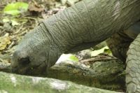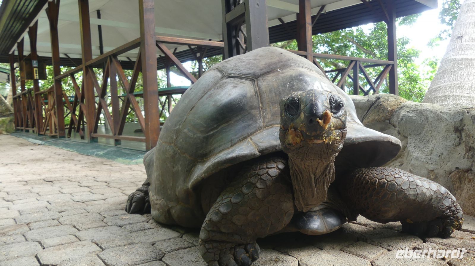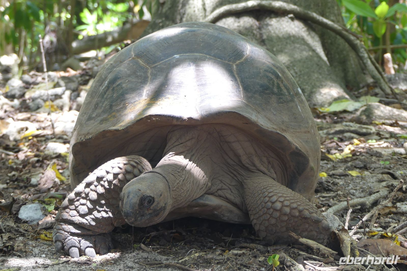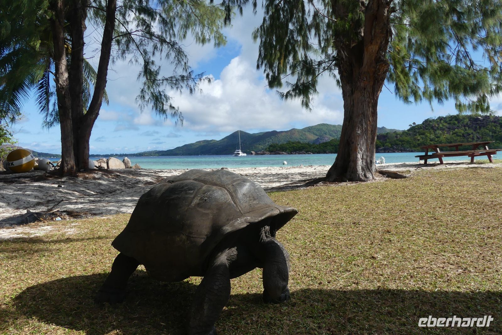Nachmittags steuern wir die Insel Moyenne an. Ein kleines Schlauchboot bringt uns zur Insel. Auf Moyenne wurden viele Riesenschildkröten angesiedelt, die wir in verschiedenen Größen und ganz aus der Nähe beobachten können. Cyrill erklärt uns, wie wir an der Form des Panzers das Geschlecht der Schildkröten erkennen können. Cyril erzählt uns auch von der Geschichte Moyennes, wie die Insel aufgeforstet wurde und hier ein Piratenschatz vergraben wurde.