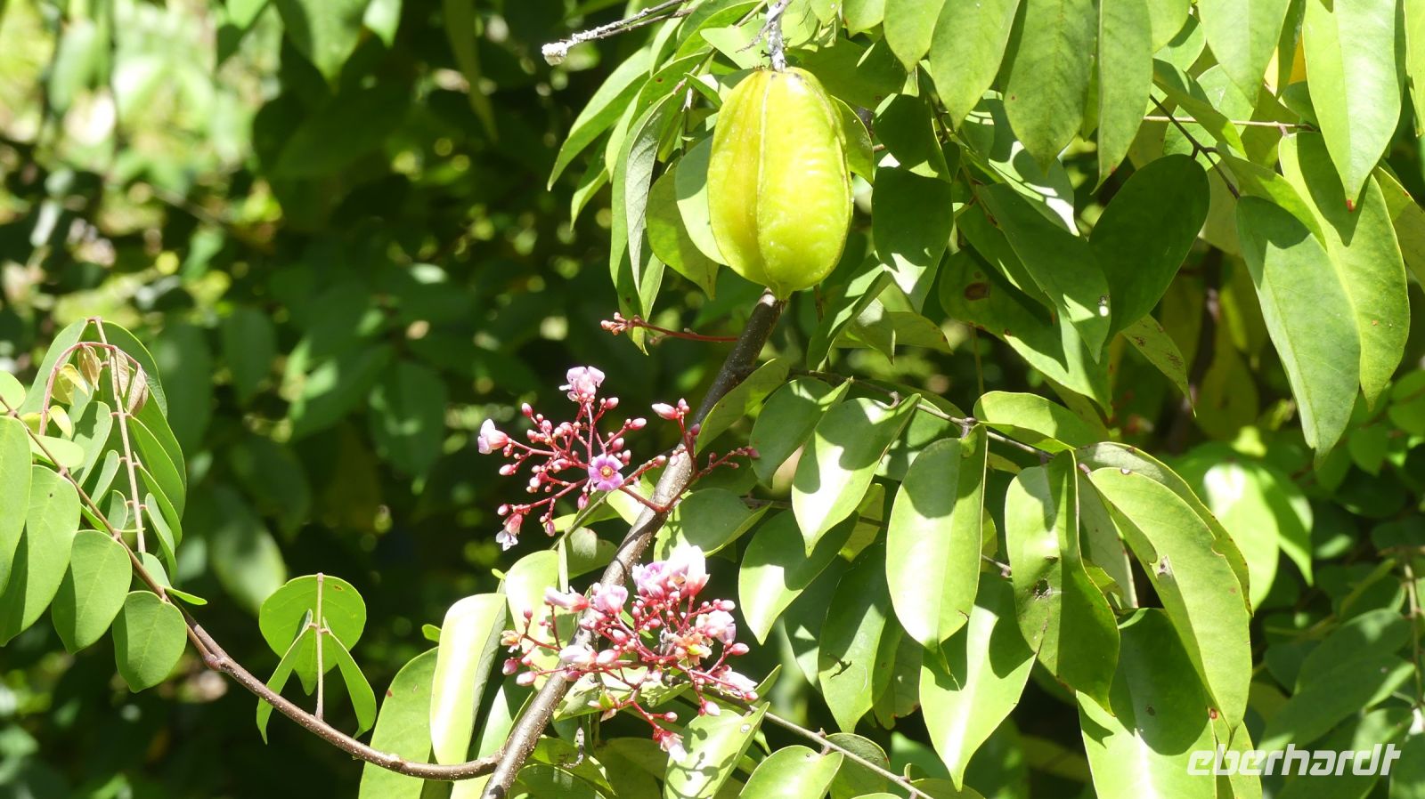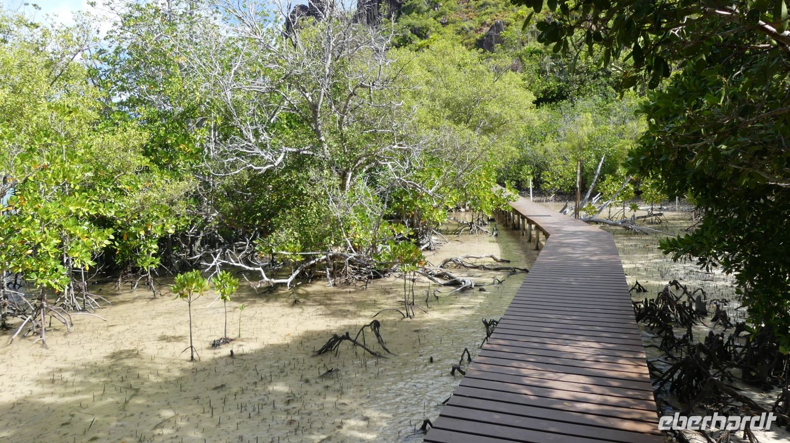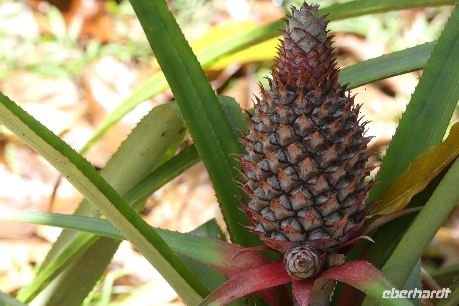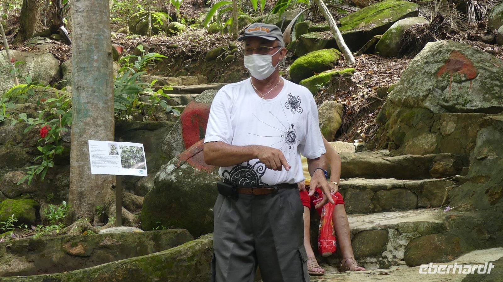 Für Donnerstag haben sich Einige von uns für eine Wanderung auf dem Naturpfad hinter dem Hotel angemeldet. Ziel ist ein ca. 260 Meter hoher Aussichtspunkt. Unterwegs erfahren wir von Jimmy viel Interessantes über die Pflanzenwelt. Die WetterApp hat für heute 50% Regenwahrscheinlichkeit angezeigt. Nach dem anfänglichen Sonnenschein erleben wir unterwegs eine warme Regendusche – auch ein Erlebnis! Immerhin verzieht sich am Aussichtspunkt der Regen, so dass wir die umliegenden Inseln und unser Hotel sehen können.