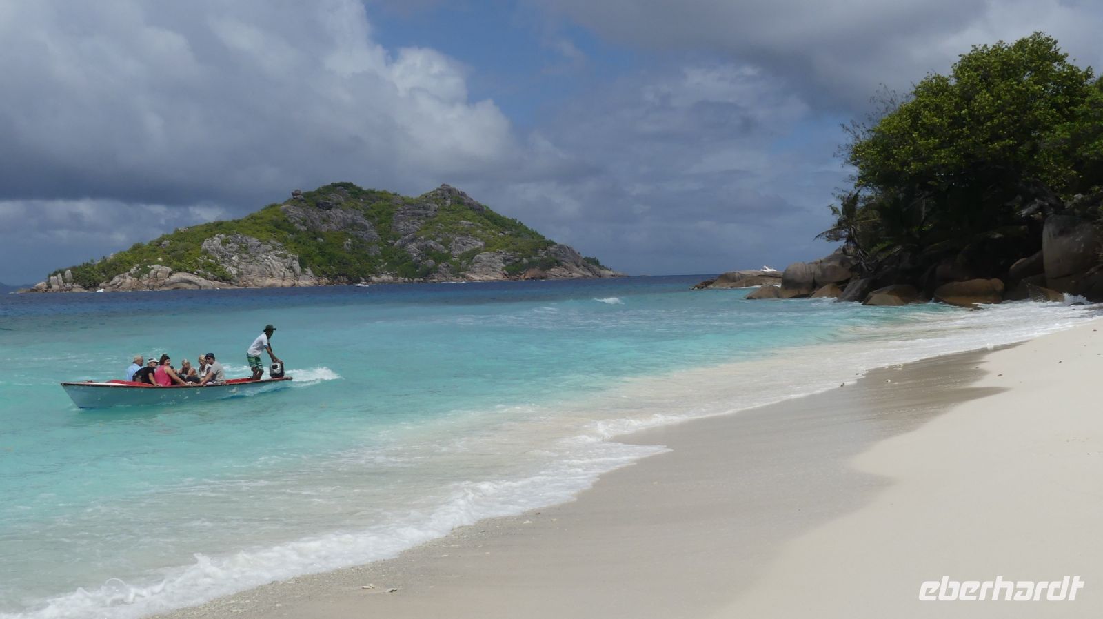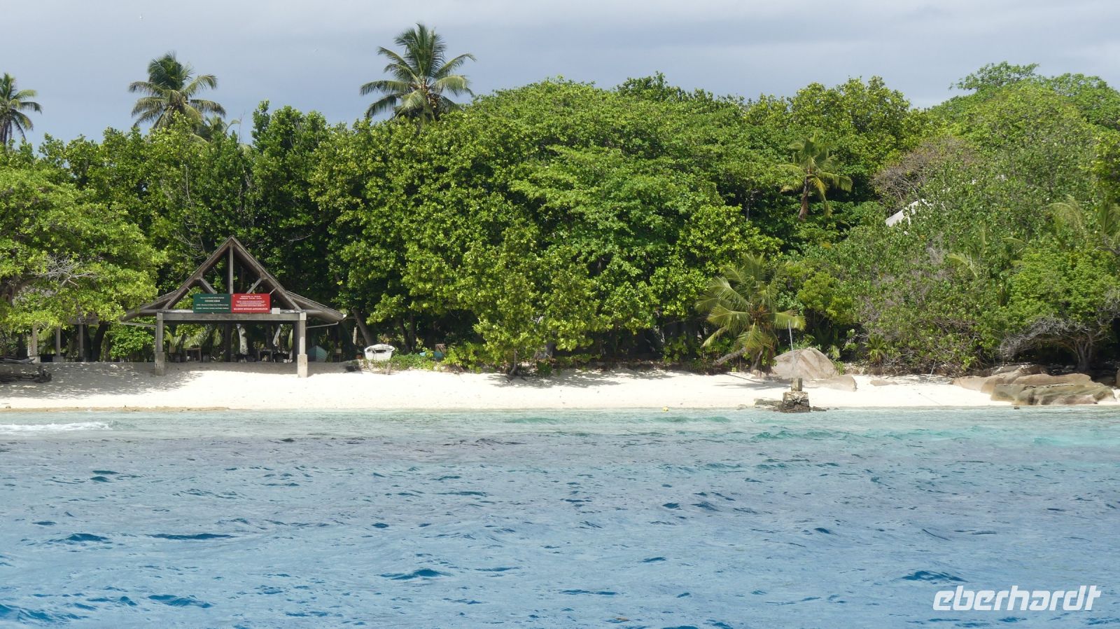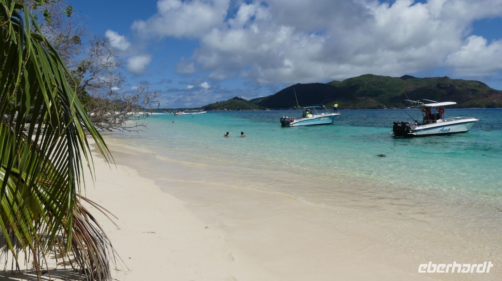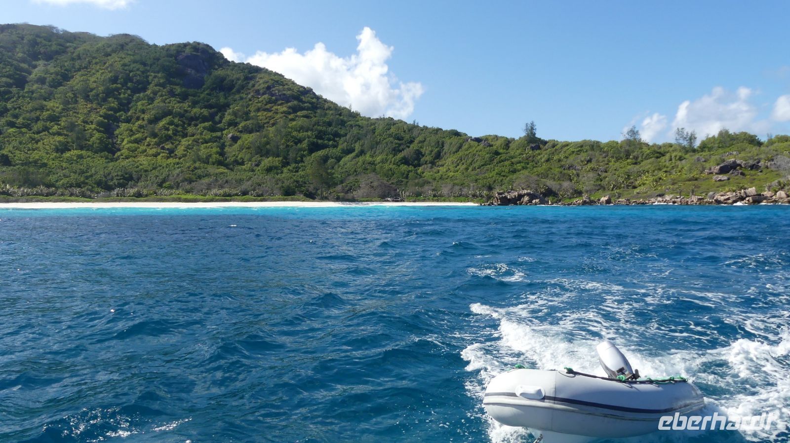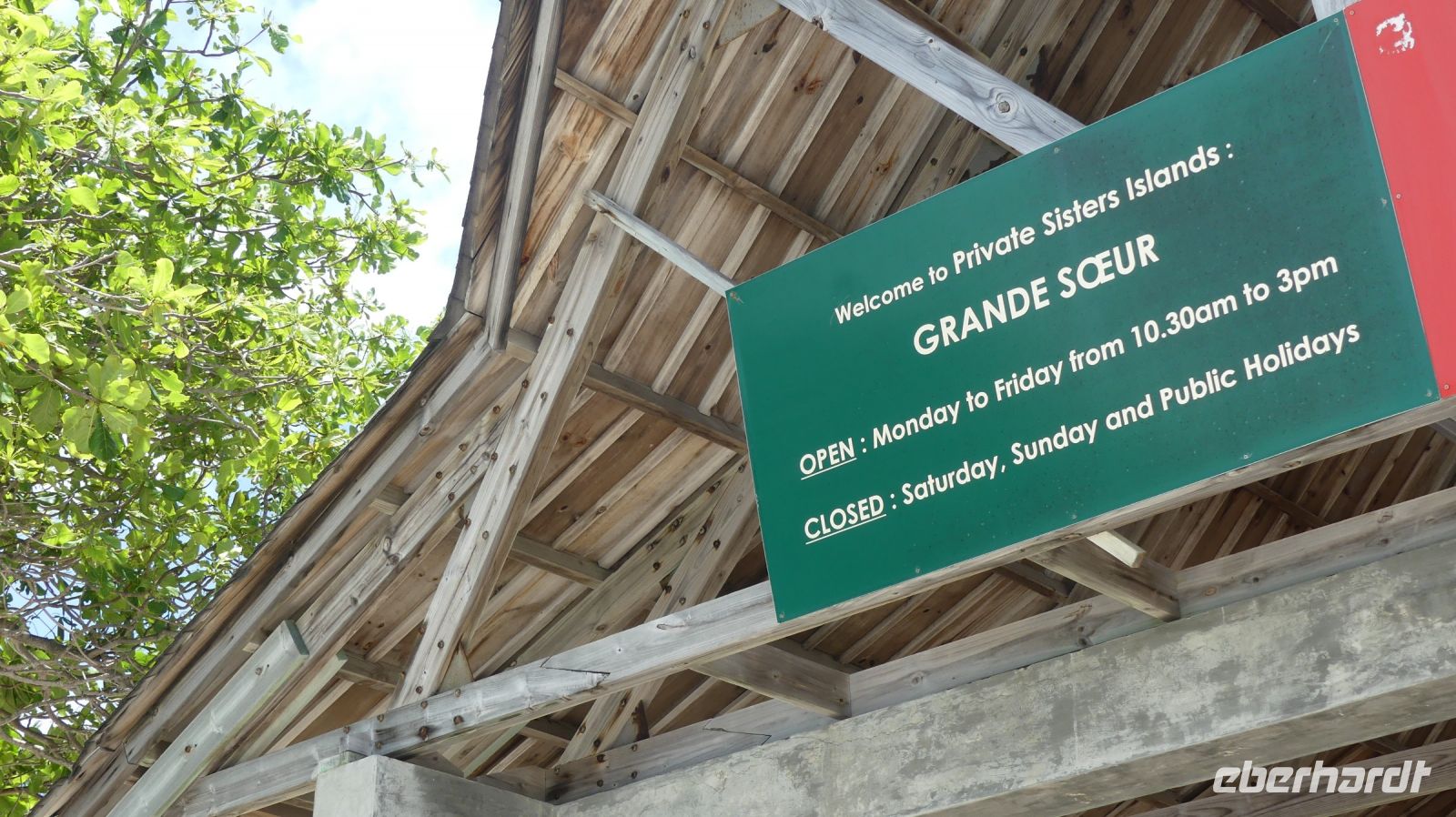Am Jetty steigen wir in unser Schnellboot, welches wir schon vor einigen Tagen zur Vogelinsel hatten. Der Regen vom Morgen hat sich glücklicherweise verzogen. Allerdings ist die See etwas unruhig, entsprechend ist es auch die Überfahrt. Unser erstes Ziel ist die Insel Grand Soeur (Sister), große Schwester der Nachbarinsel Petite Soeur. Die im Privatbesitz befindliche Insel kann zu bestimmten Tageszeiten besucht werden. In der Inselmitte befindet sich eine kleine Kokospalmenplantage mit einigen Riesenschildkröten. Reizvoll sind die parallel zueinander verlaufenden Strände an der Ost- und Westküste, die ca. 300 Meter auseinander liegen.