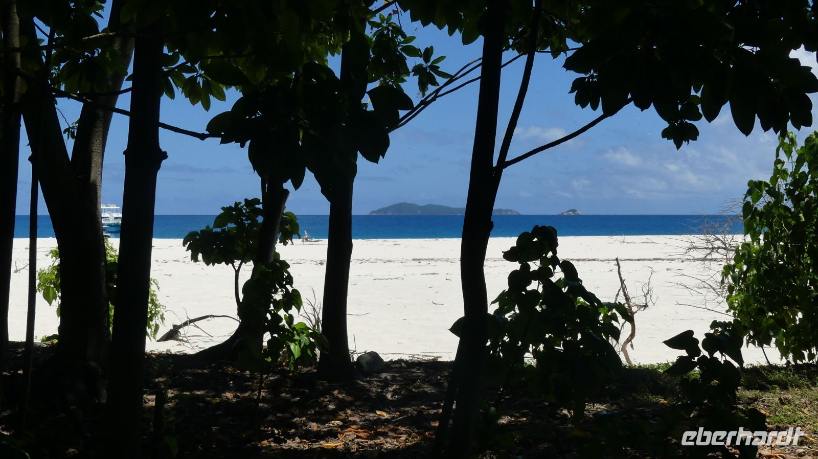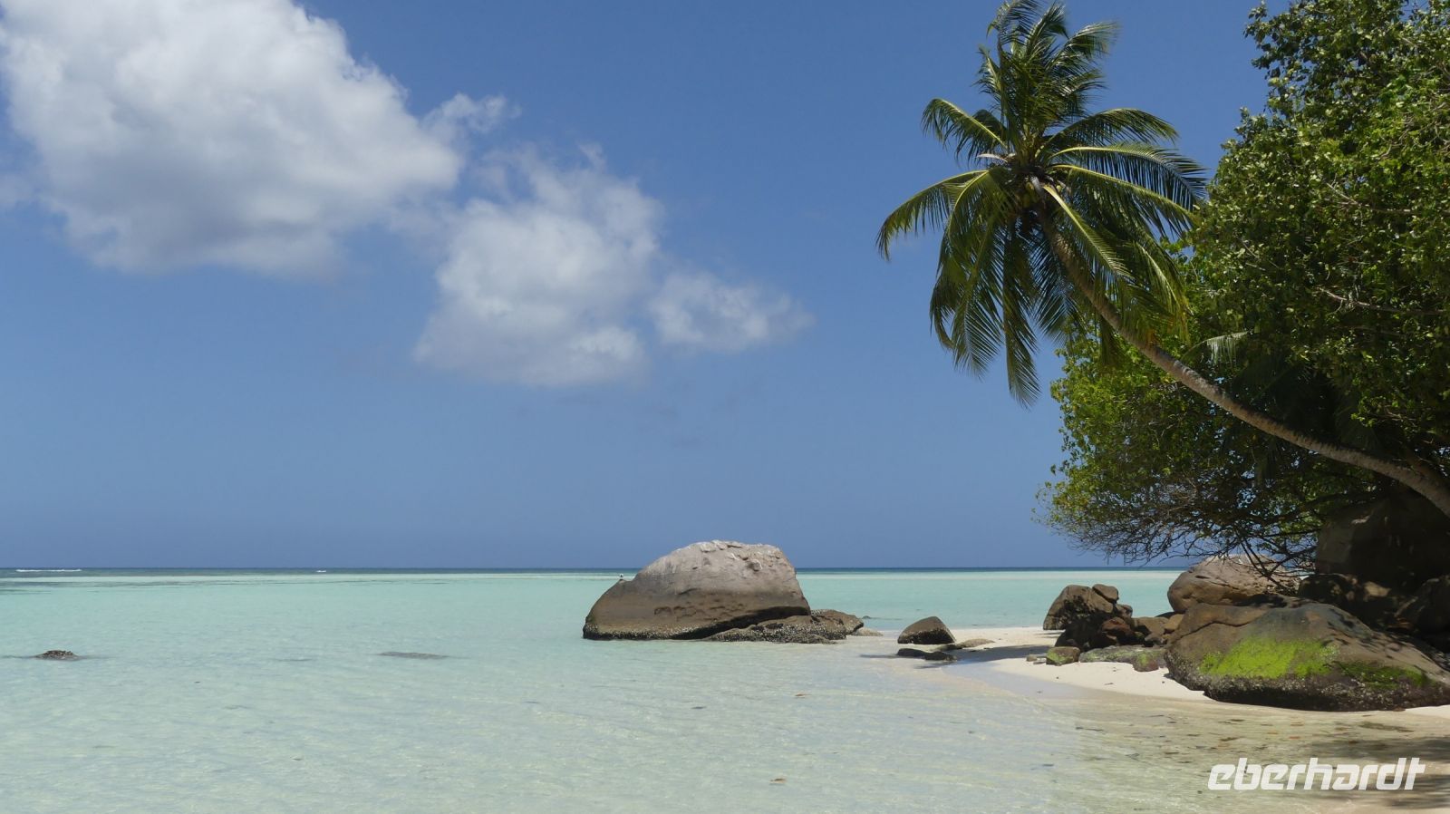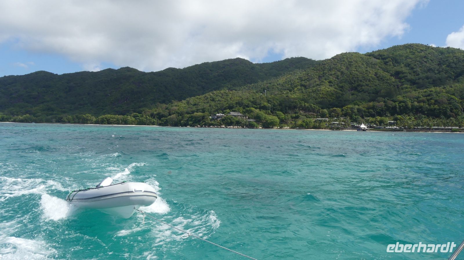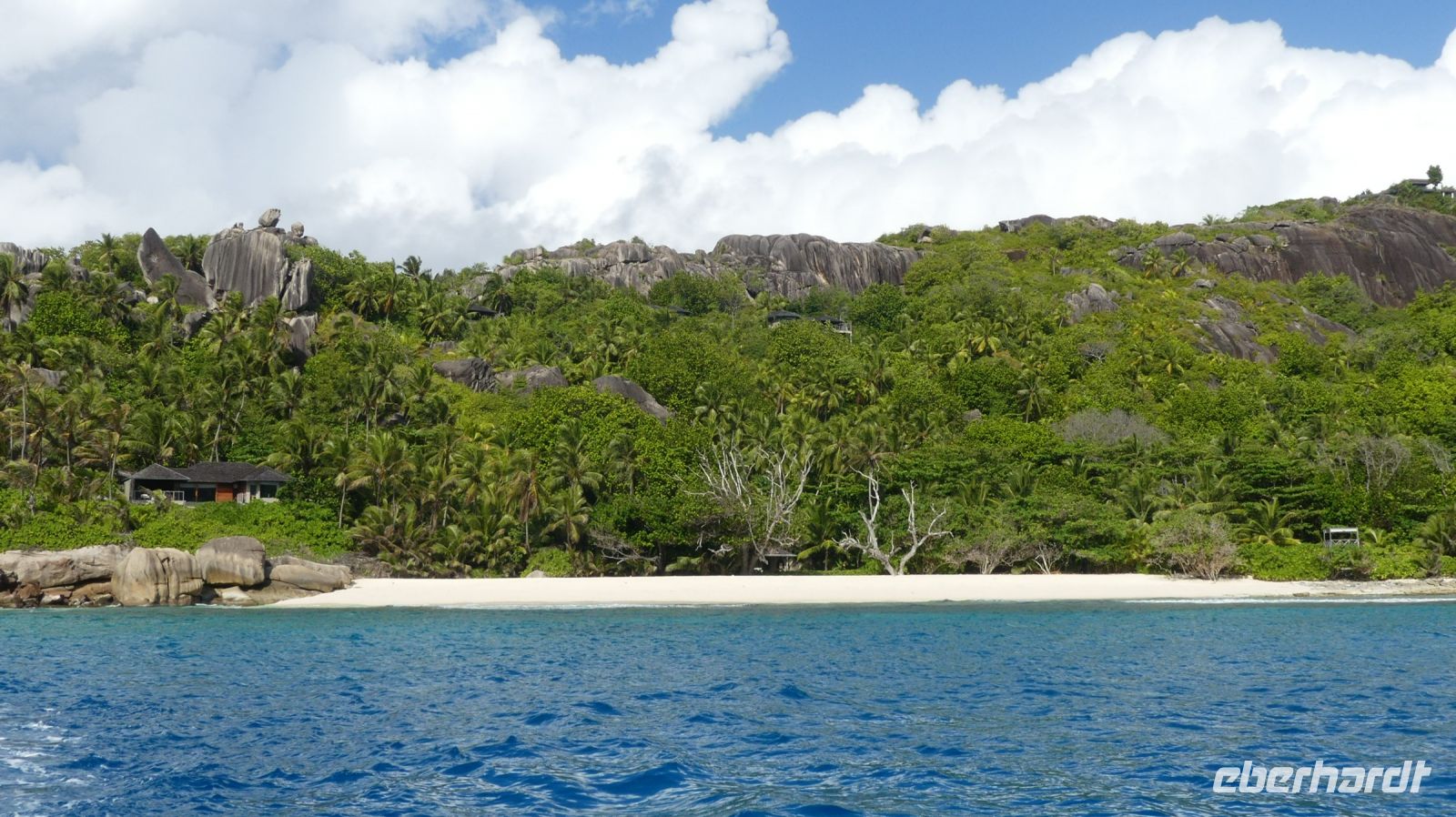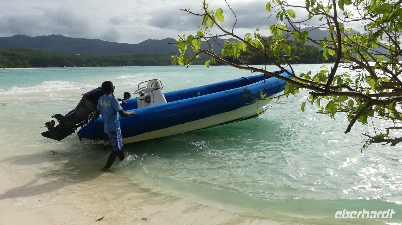 Am Jetty steigen wir in unser Schnellboot, welches wir schon vor einigen Tagen zur Vogelinsel hatten. Der Regen vom Morgen hat sich glücklicherweise verzogen. Allerdings ist die See etwas unruhig, entsprechend ist es auch die Überfahrt. Unser erstes Ziel ist die Insel Grand Soeur (Sister), große Schwester der Nachbarinsel Petite Soeur. Die im Privatbesitz befindliche Insel kann zu bestimmten Tageszeiten besucht werden. In der Inselmitte befindet sich eine kleine Kokospalmenplantage mit einigen Riesenschildkröten. Reizvoll sind die parallel zueinander verlaufenden Strände an der Ost- und Westküste, die ca. 300 Meter auseinander liegen.
