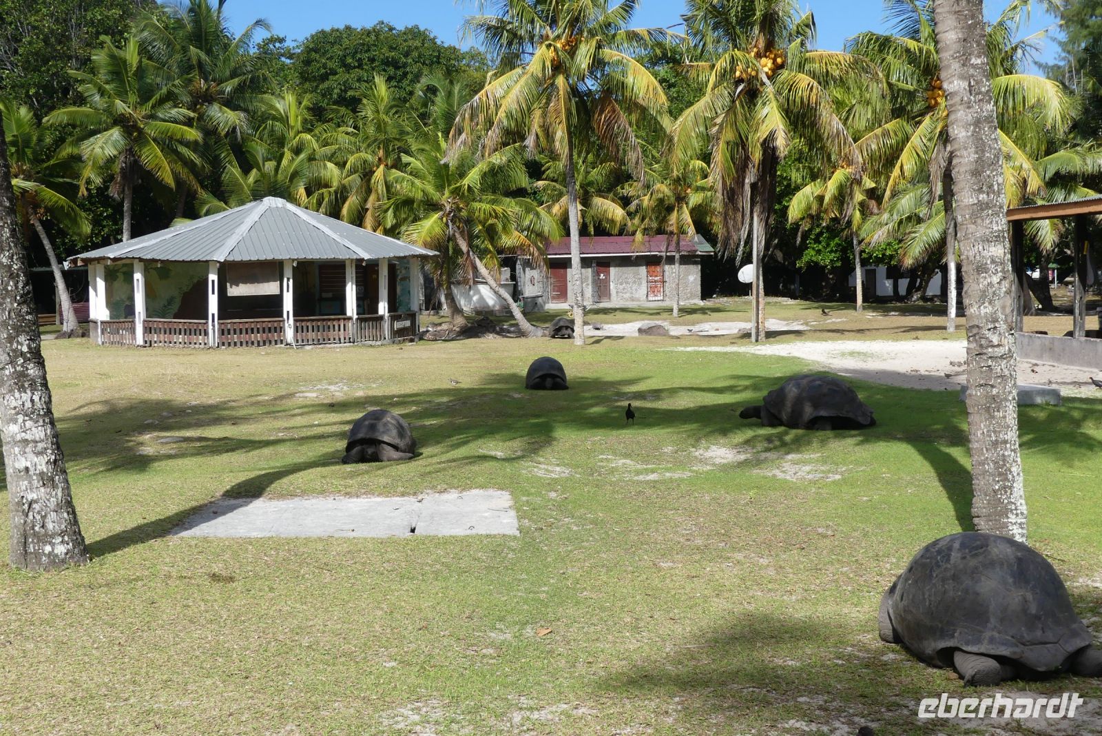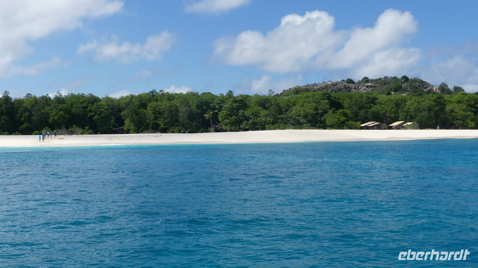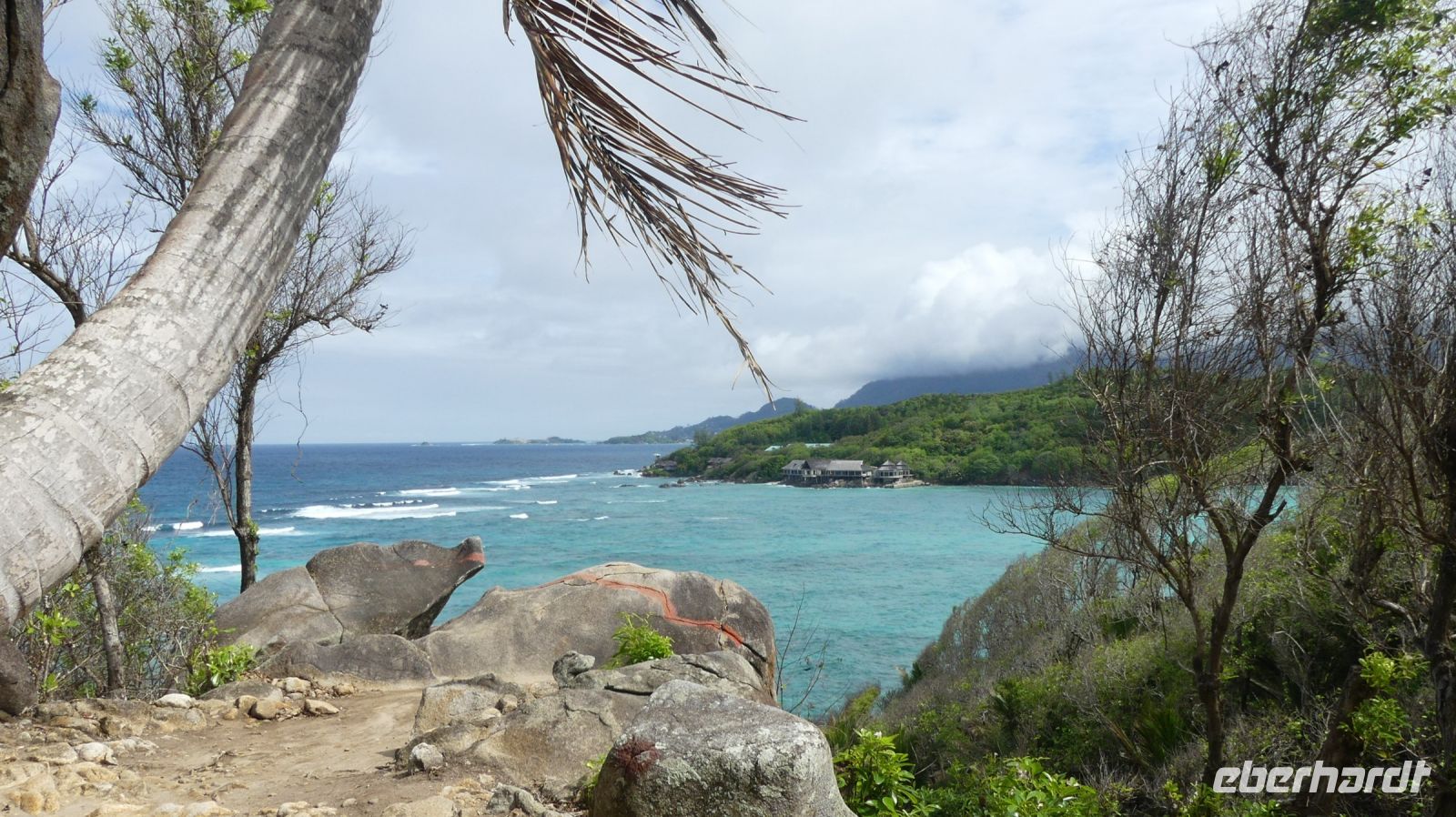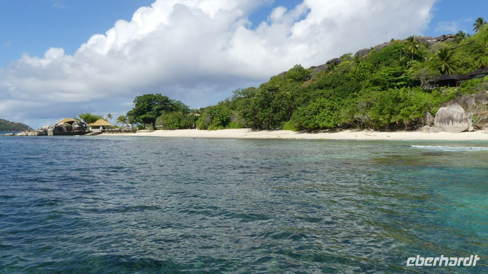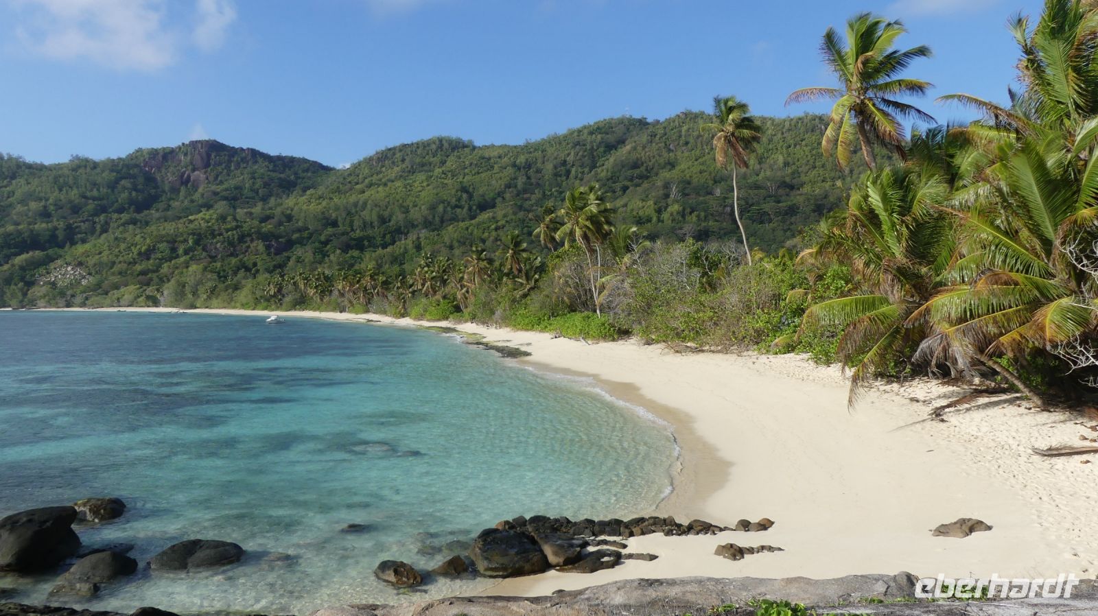 Am Jetty steigen wir in unser Schnellboot, welches wir schon vor einigen Tagen zur Vogelinsel hatten. Der Regen vom Morgen hat sich glücklicherweise verzogen. Allerdings ist die See etwas unruhig, entsprechend ist es auch die Überfahrt. Unser erstes Ziel ist die Insel Grand Soeur (Sister), große Schwester der Nachbarinsel Petite Soeur. Die im Privatbesitz befindliche Insel kann zu bestimmten Tageszeiten besucht werden. In der Inselmitte befindet sich eine kleine Kokospalmenplantage mit einigen Riesenschildkröten. Reizvoll sind die parallel zueinander verlaufenden Strände an der Ost- und Westküste, die ca. 300 Meter auseinander liegen.