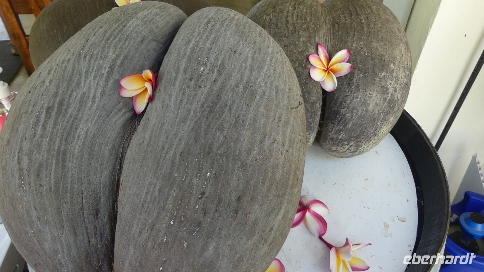 Zunächst fahren wir zum Nationalpark Vallée de Mai. Die riesigen Blätter der Coco de Mer bedecken über uns den Himmel nahezu vollständig. Es ist ein einzigartiger Palmenwald, dominiert von der Coco de Mer, aber auch die anderen fünf heimischen Palmenarten sind hier vertreten. Das etwa 20 Hektar große Tal mit der urzeitlichen Seychellenpalme steht unter strengem Schutz und gehört seit 1983 zum Weltnaturerbe der UNESCO. Nur hier auf Praslin und auf der Schwesterinsel Curieuse wächst die Coco de Mer. Die Coco de Mer Palme hat erstaunliche Eigenschaften: erst nach rund 20 bis 25 Jahren Wachstum ist das Geschlecht der Palme erkennbar, gerade mal ein Blatt im Jahr bringt sie hervot, dafür ist es abgesehen von einer anderen Palmenart auf Mauritius das größte im gesamten Pflanzenreich; nach der Befruchtung braucht der Samen ganze 6 bis 7 Jahre bis zur Reife, dann ist er aber der größte der Welt, bis 24 kg brachten Samen schon auf die Waage – Weltrekord, das schafft kein anderer Samen! Ein Foto mit diesem Riesensamen deshalb ein Muss! Unser Spaziergang durch den Wald dauert so ungefähr 2 Stunden. Cyril hat immer wieder interessante Details für uns parat und wir stauen immer noch über diesen Wald, über die riesigen Blätter und Samen.