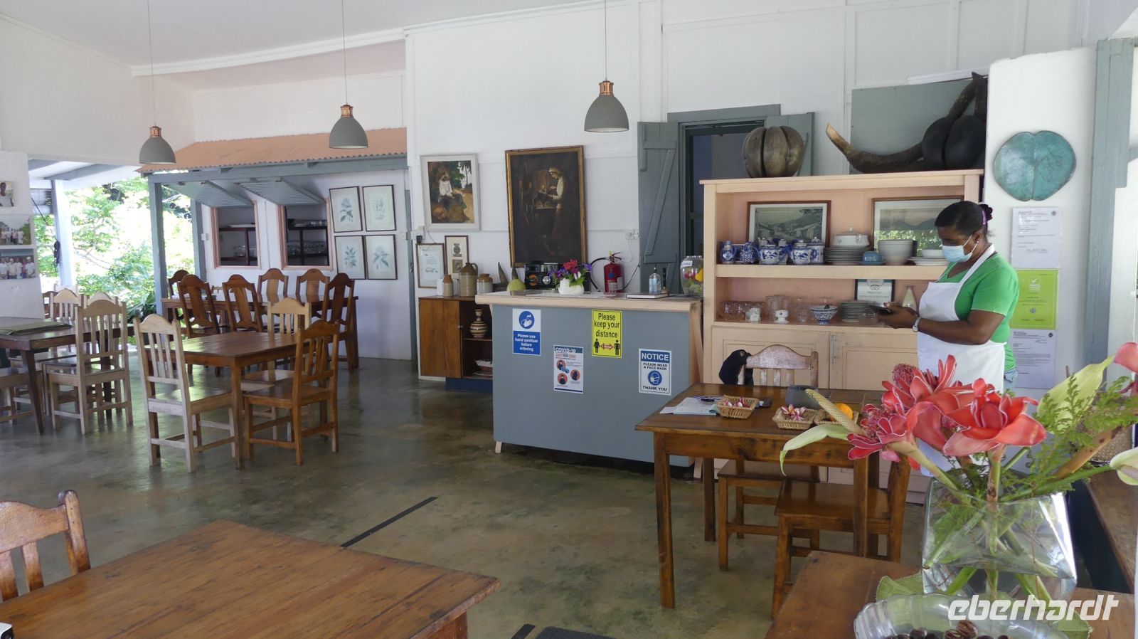 Zur Mittagspause sind wir im Marie Antoinette Restaurant in Victoria. Das längere Warten auf das Essen lohnt sich: es gibt u. a. Papageienfisch, kreolische Salate wie herzhaften Mangosalat und als Nachtisch Karamellpudding oder eine Zubereitung aus Süßkartoffel mit Banane.
