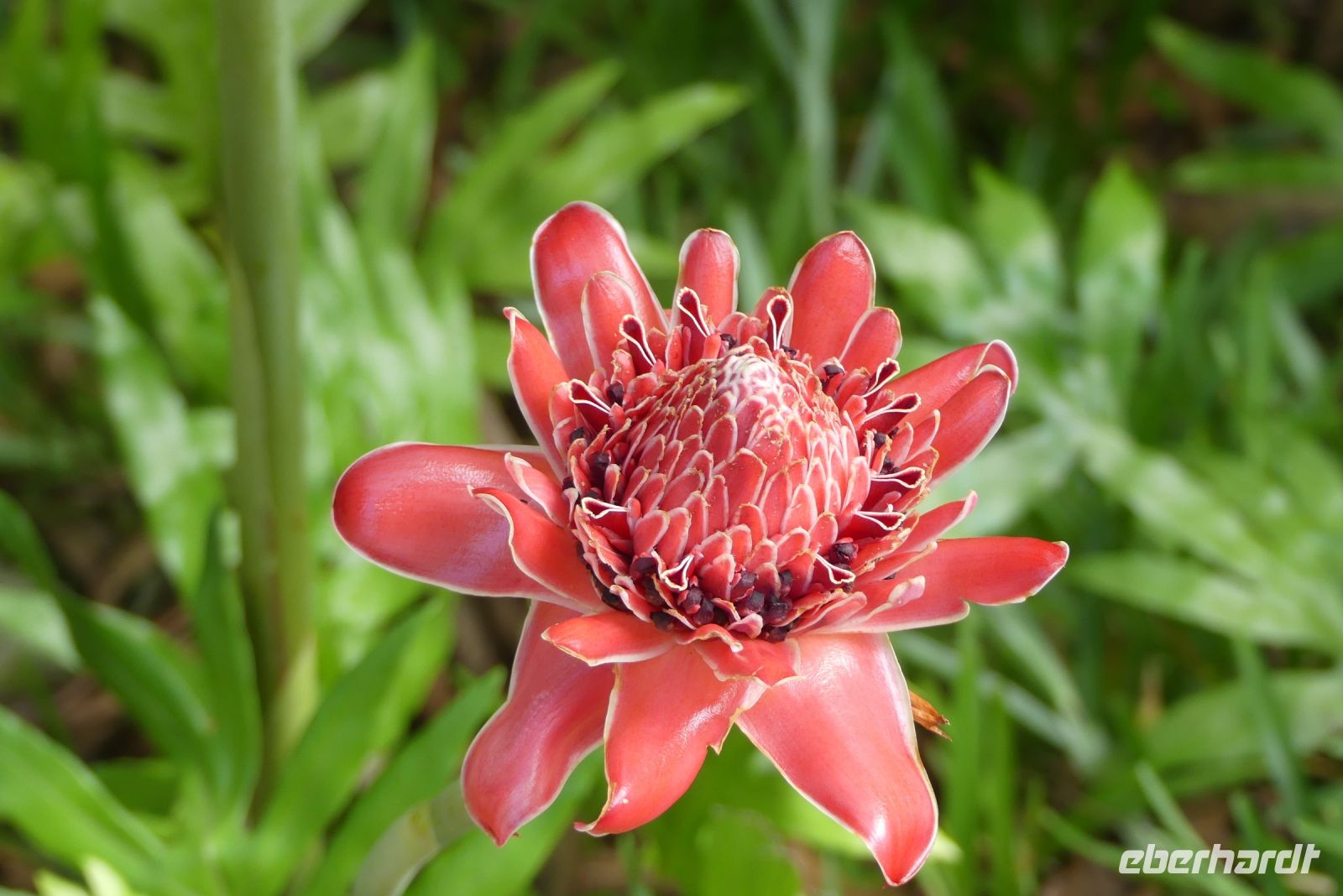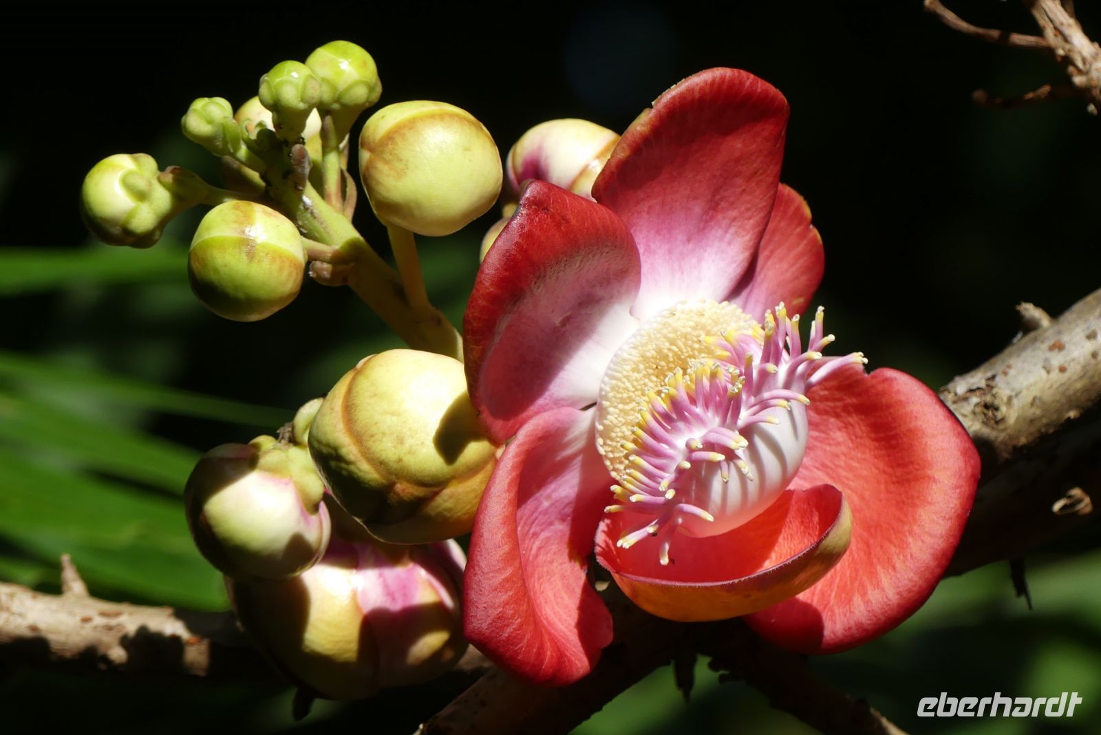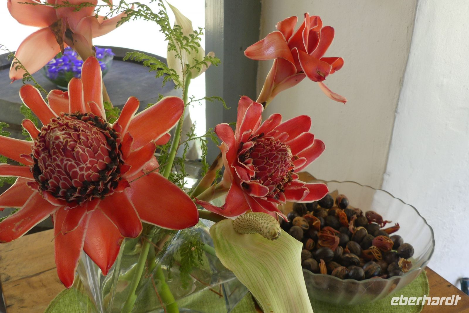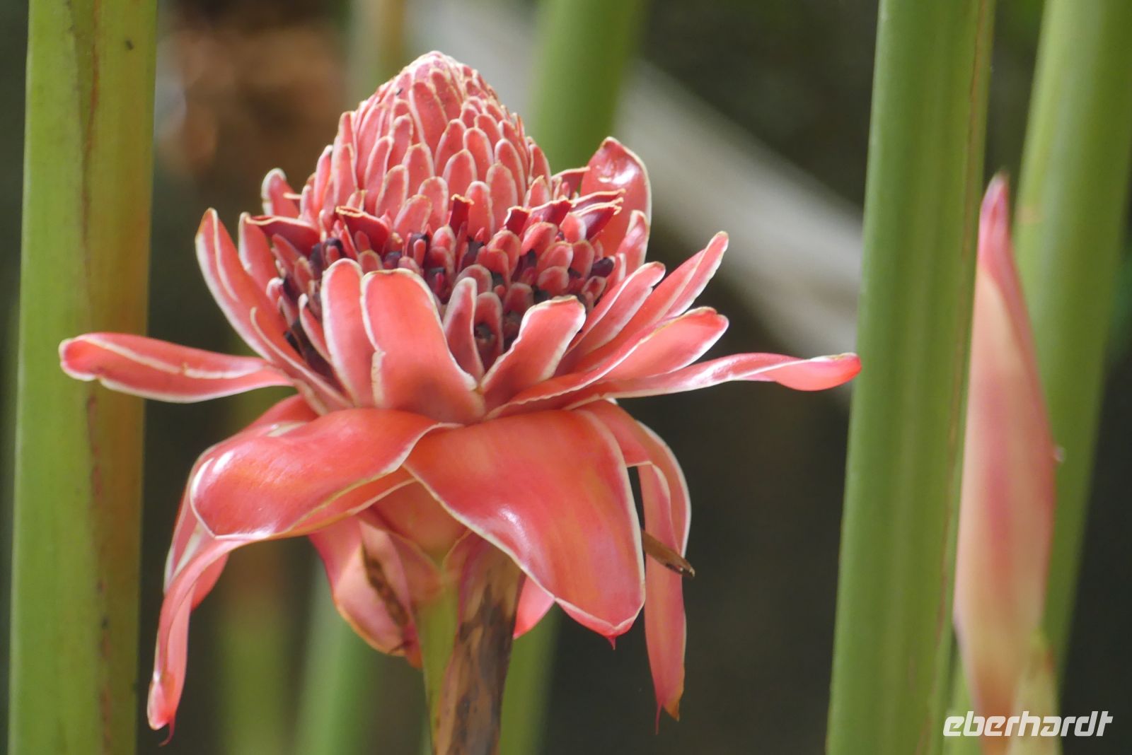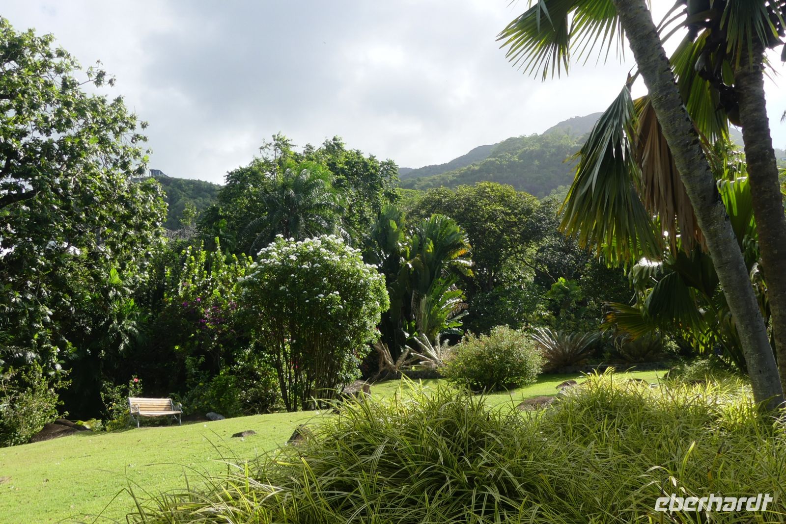 Schließlich besuchen wir den Botanischen Garten in Victoria. Neben einheimischen, oft endemischen Arten, sind auch zahlreiche Pflanzen aus anderen tropischen Ländern vertreten. Hier ein paar Beispiele: Coco de Mer und alle weiteren fünf endemischen Palmenarten, Karambola, Rose of Venezuela, Helikonien, Taschenlampen-Ingwerblume (auch Fackel-Ingwerblume), Kanonenkugelbaum etc.