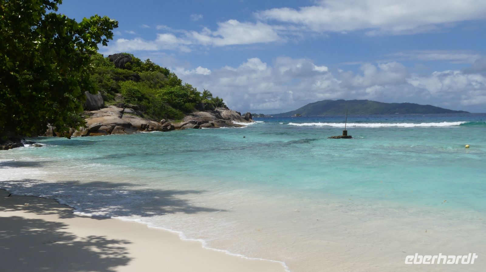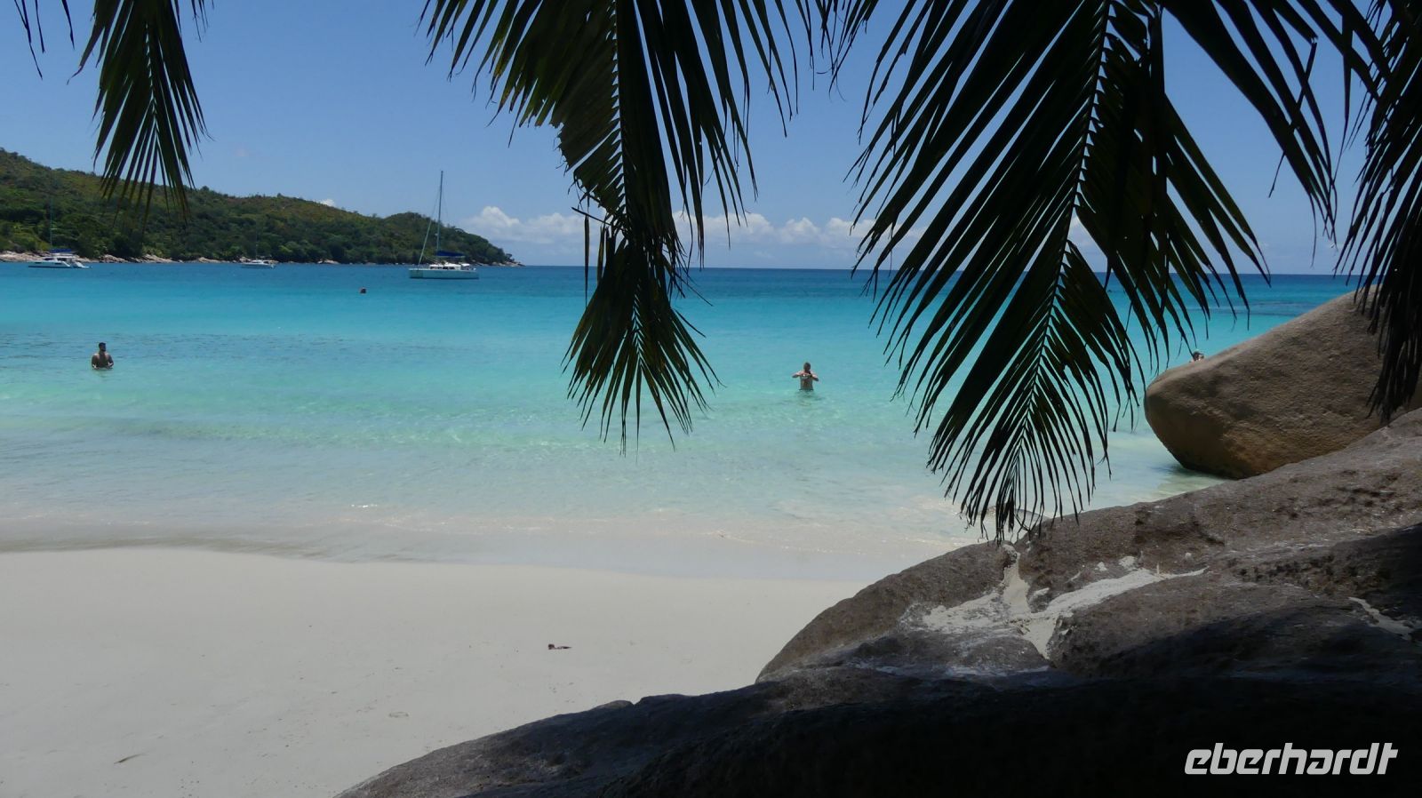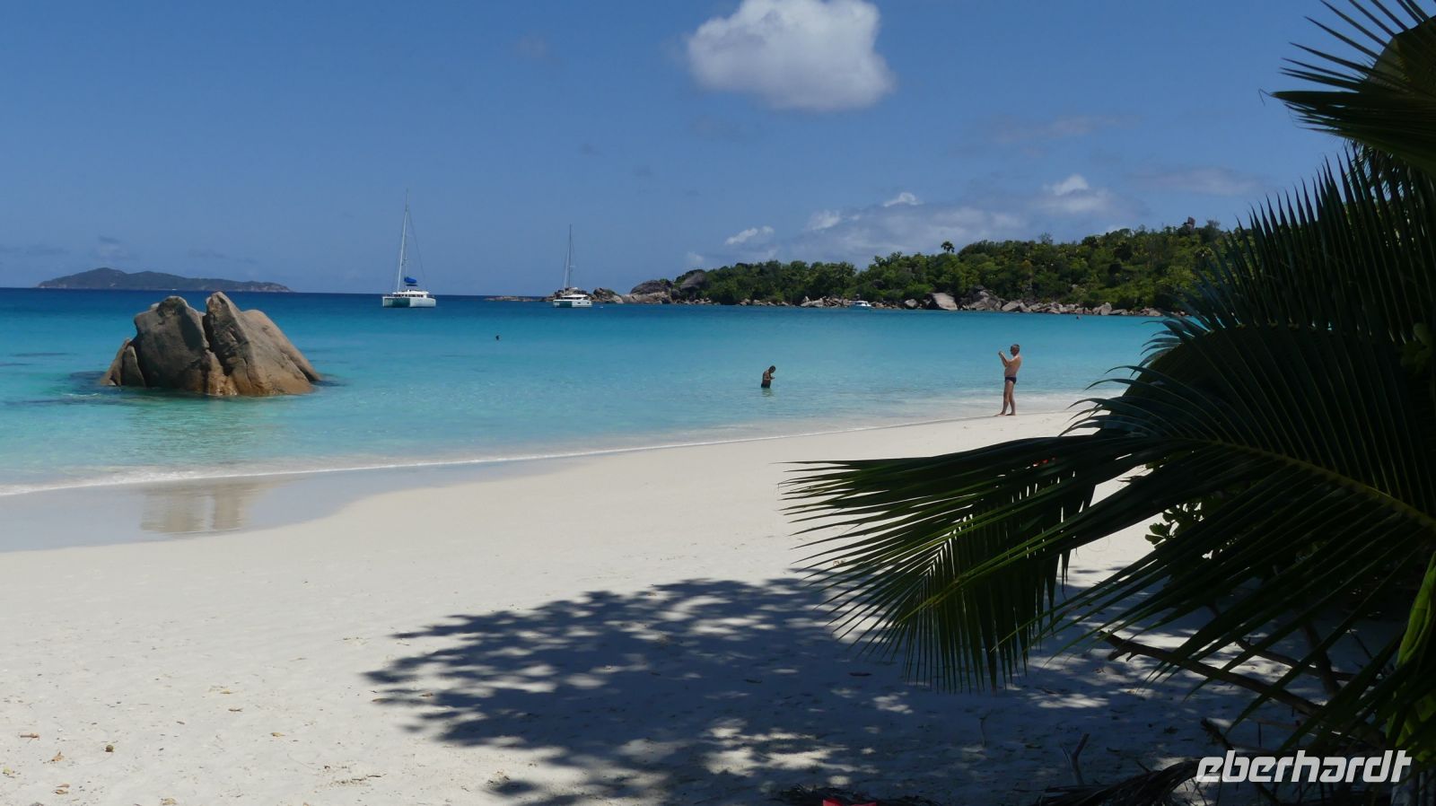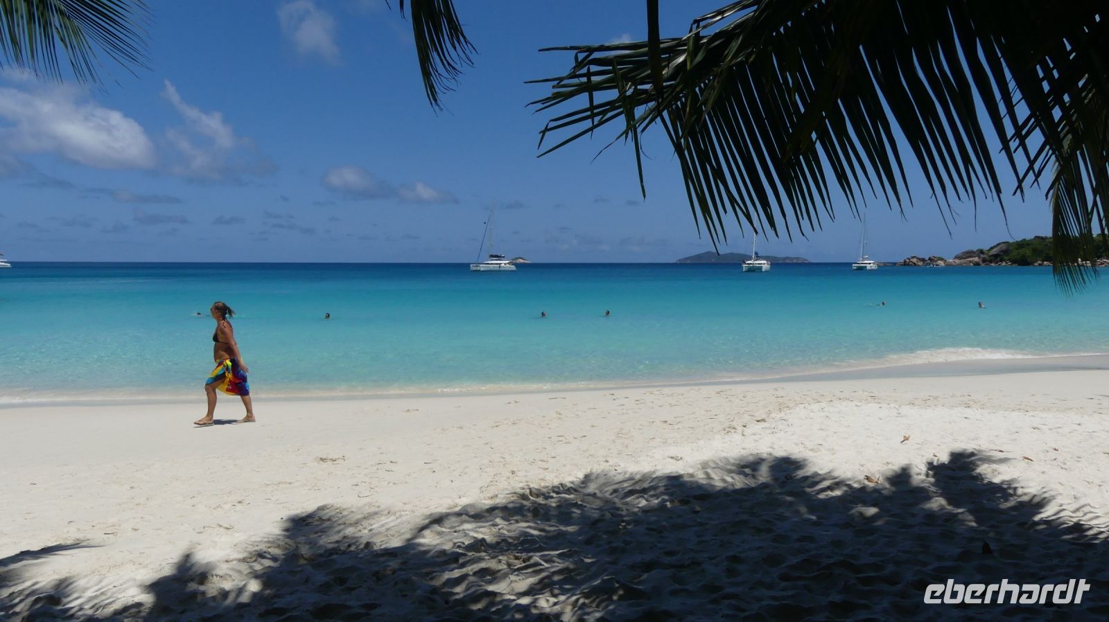 Die Badeverlängerung nutzen wir für zum Teil für weitere Unternehmungen. Da uns der Anse Lazio so gut gefallen hat, buchen wir für den Dienstag Mike´s Kleinbus für einen Tagesausflug zu diesem Traumstrand, Inselrundfahrt inklusive. Das Wetter passt heute perfekt dazu – Sonne und schwacher Wind. Im Rucksack habe ich es etwas zum Lesen dabei. Doch lange Weile kommt nicht auf: Fotografieren, Schnorcheln, Strandspaziergang, Obstimbiss von einem der kleinen Strandstände, nochmal Fotografieren und schon ist es Nachmittag. Einige sehen beim Schnorcheln übrigens Rochen und Meeresschildkröten. Ein toller Tag! Auf der Rückfahrt werden noch die Getränkereserven aufgefüllt und Gewürze gekauft.