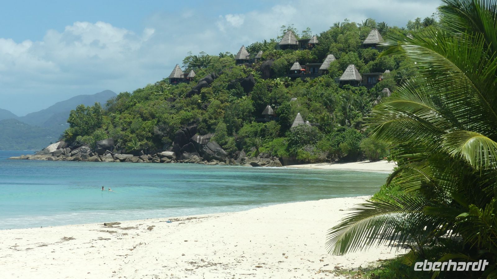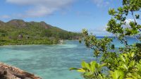 Zur Mittagspause sind wir im Hotel und Restaurant Britania. Hier steht für uns ein kreolisches Buffet bereit, bei dem Fisch natürlich mit Sauce creole nicht fehlen darf. Gestärkt setzen wir unsere Inselrundfahrt fort, kommen entlang der Nordküste schließlich zum berühmten Strand Anse Lazio. Die Farben sind beeindruckend: rote Granitfelsen, weißer Korallensand, die verschieden Blautöne des Meeres und das satte Grün von Kokospalmen – traumhaft schön! Hier verbringen wird den Nachmittag mit Baden, Fotografieren und Schnorcheln. Ich selbst habe beim Schnorcheln das Glück, eine Karettschildkröte nicht nur zu sehen, sondern 10 bis 15 Minuten lang zu begleiten, da sie nicht scheu ist und meine Nähe wohl tolleriert.