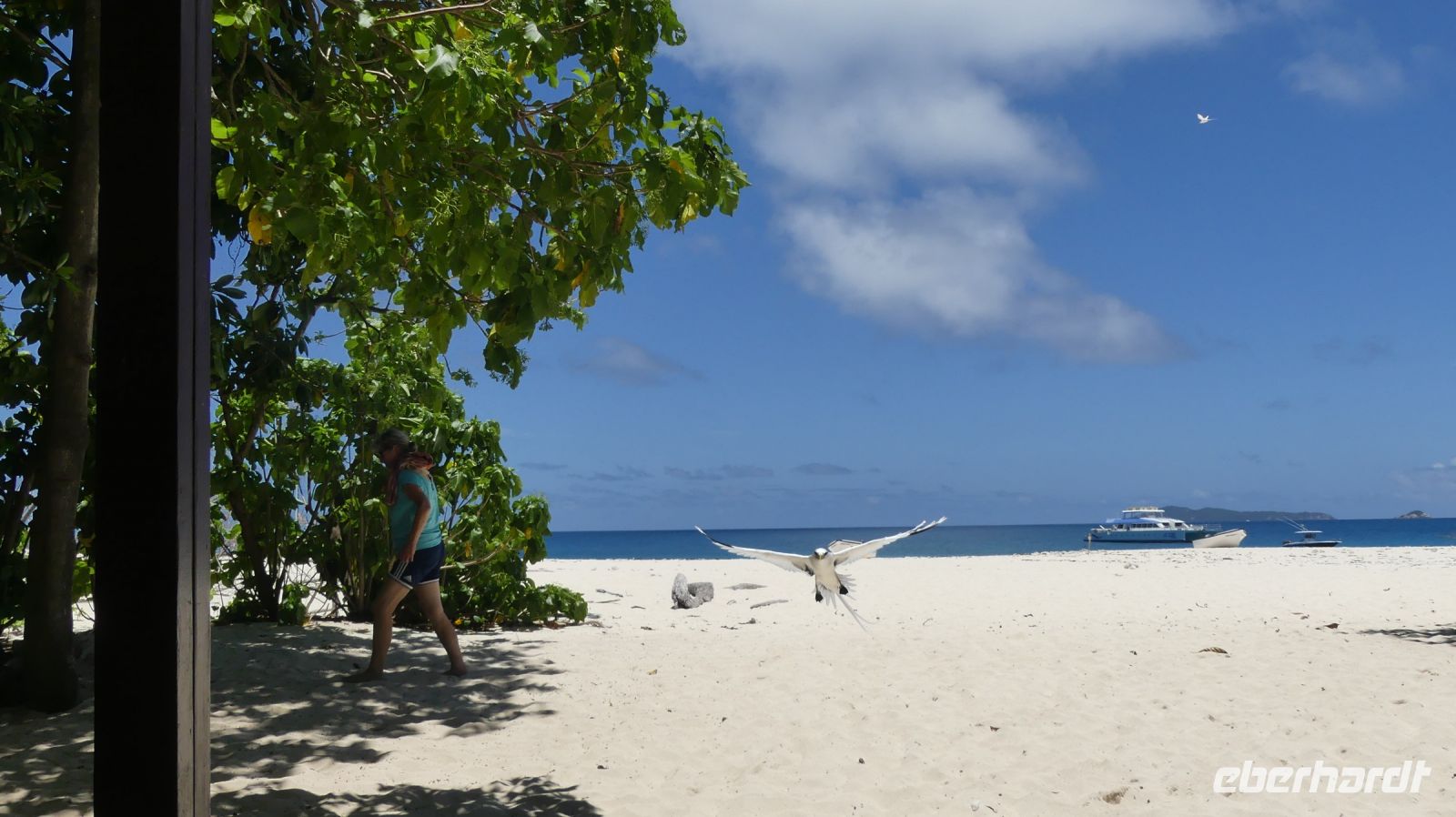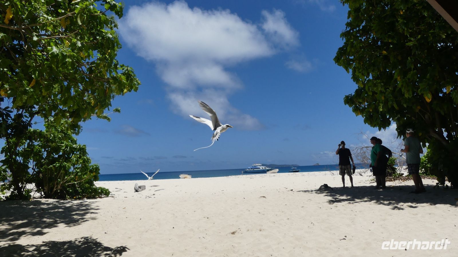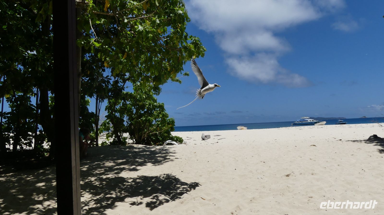 Mit über 50 km/h fahren wir mit dem Schnellboot zur Vogelinsel Cousine. Unterwegs reduzieren wir die Geschwindigkeit, um Traumstrände wie Anse Lazio und Anse Georgette besser sehen zu können. Für die Insel Cousin gibt es strenge Umweltauflagen, weshalb keine größeren Boote an der Insel anlanden dürfen. So steigen wir auf ein kleines Boot, um mit voller Kraft am Strand von Cousin anzulanden. Auf der Insel leben weder Schlangen noch Raub- oder Nagetiere, deshalb kommen verschiedene Vogelarten gern hierher, um ihren Nachwuchs am Boden aufzuziehen. Eine prima Gelegenheit, die Seevögel und ihre Jungtiere, wie die Feenseeschwalbe, den Weißschwanz-Tropikvogel (der mit dem langen weißen Schanz) sowie den Nordi und verschiedene Foddy-Arten ganz aus der Nähe zu beobachten. Auch einigen Landschildkröten begegnen wir. Einen „Räuber“ gibt es aber doch – es sind die Eidechsen, welche es auf Vogeleier abgesehen haben. Und dann gibt es ungebetene Gäste, die zahlreich auf der Insel vertreten sind. Gemeint sind diese gemeinen kleinen Blutsauger, die uns piesacken.