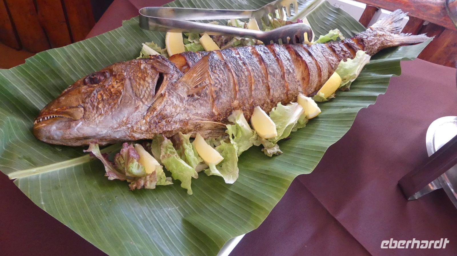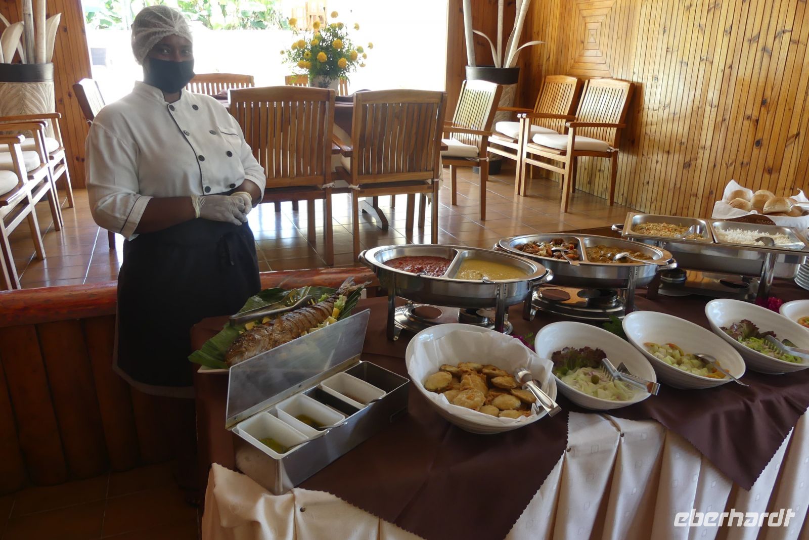 Das offene Restaurant mit Terrasse bietet in nettem Ambiente sowohl zum Frühstück als auch zum Abendessen eine gute Auswahl an Speisen. Und Fisch kombiniert mit einer landestypischen Sauce darf keinen Abend fehlen.