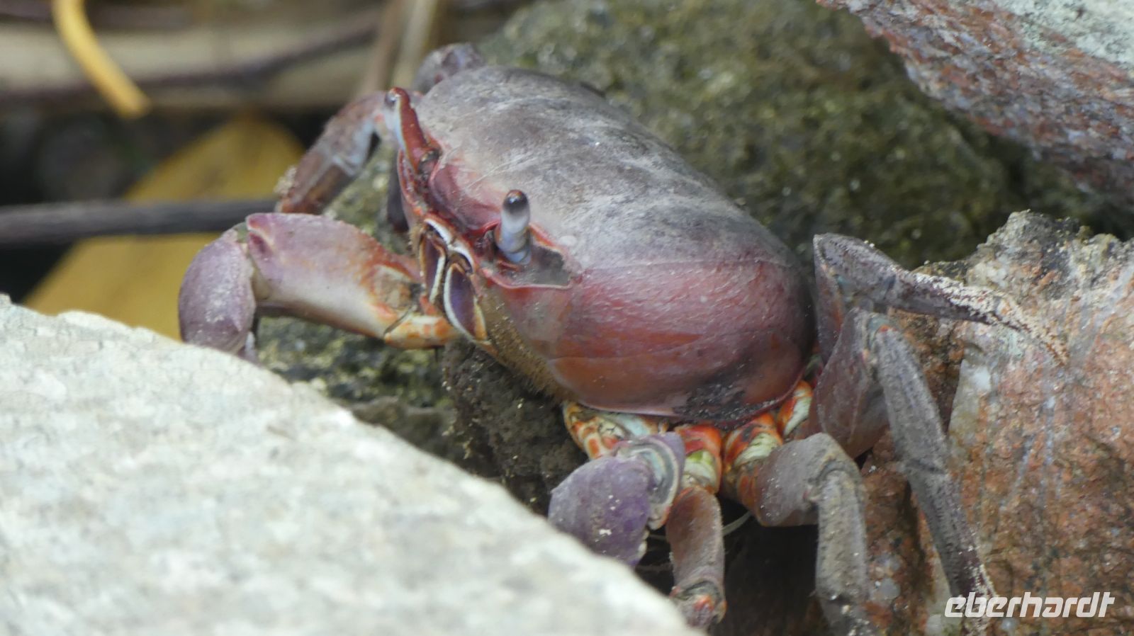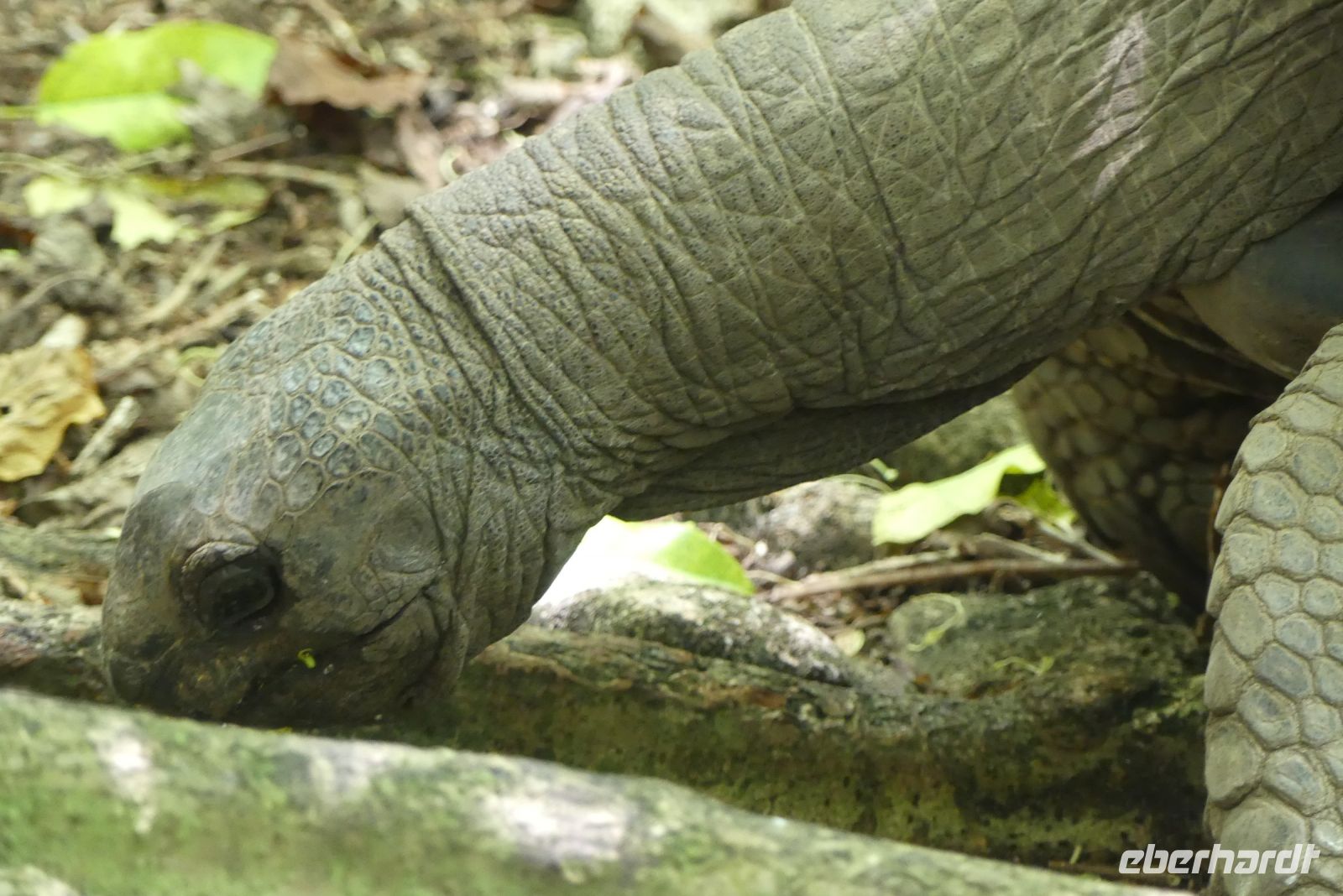 Unser nächstes Ziel ist die Insel Curieuse, nördlich von Praslin. Hier essen wir Mittag, natürlich mit gegrilltem Fisch. Der lange Strand von Curieuse lädt zum Verweilen ein und so bleiben wir noch ein Stündchen zum Baden. Auch auf Curieuse gibt es frei lebende Riesenschildkröten. In etwa einer Stunde (nach dem Zeitgefühl von Cyrill 25 Minuten) wandern wir 1,7 km (nicht 17 km…) zur anderen Inselseite, wo unser Schnellboot auf uns wartet. Unterwegs kommen wir durch abwechslungsreiche Natur mit Mangroven, begegnen Riesenschildkröten, Krabben, Vögeln… und können schöne Ausblicke genießen.