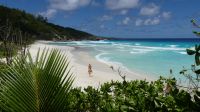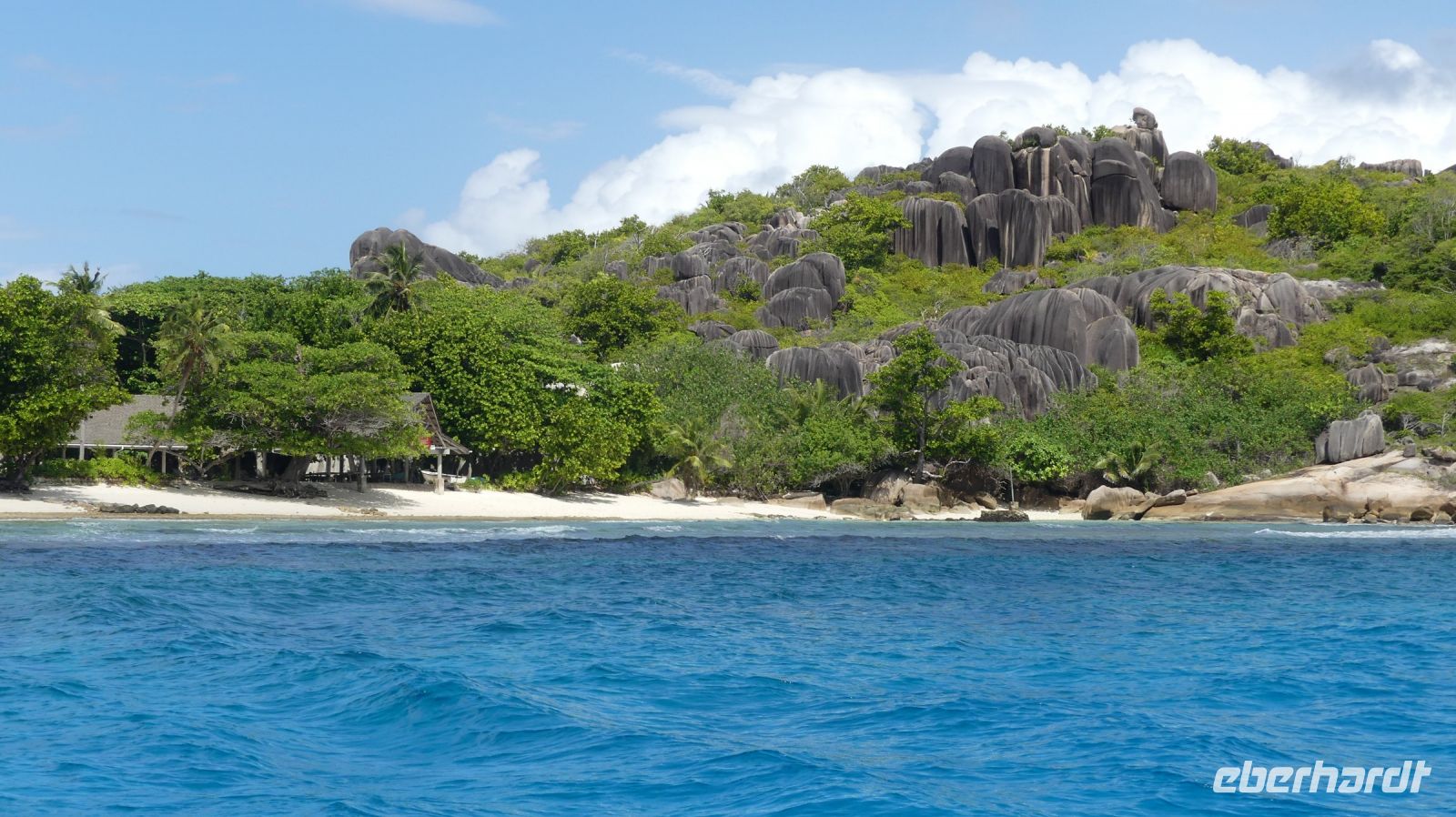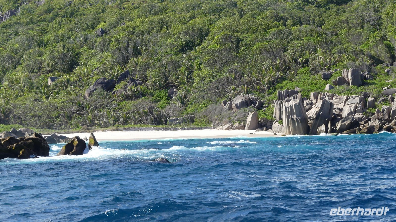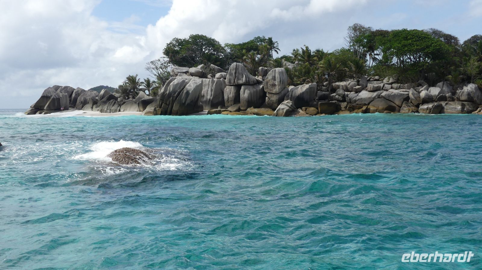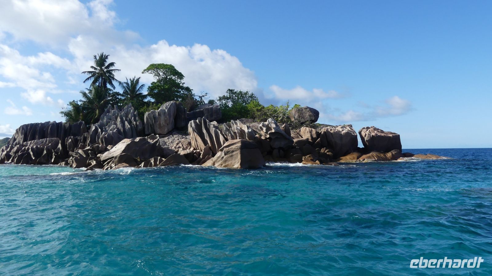 Der Oststrand ist wunderschön eingerahmt von Granitfelsen. Die Farben des türkisblauen Wassers strahlen….Nach dem Mittagessen setzen wir unsere Bootsreise fort und steuern die Insel Ile Coco an. Die Granitfelsen der kleinen Insel haben eigenwillige Formen. Es gibt sogar einen kleinen Strand, an dem gerade Kanufahrer angelandet sind. Wir halten vor Coco zum Schnorcheln. Weiter geht es zur Privatinsel Félicité. Hier haben einige reiche Fußballer ein Domizil. Wir gehen nicht an Land, sondern Schnorcheln vom Boot aus. Dann folgt eine nochmals etwas unruhige Überfahrt zurück nach Praslin.