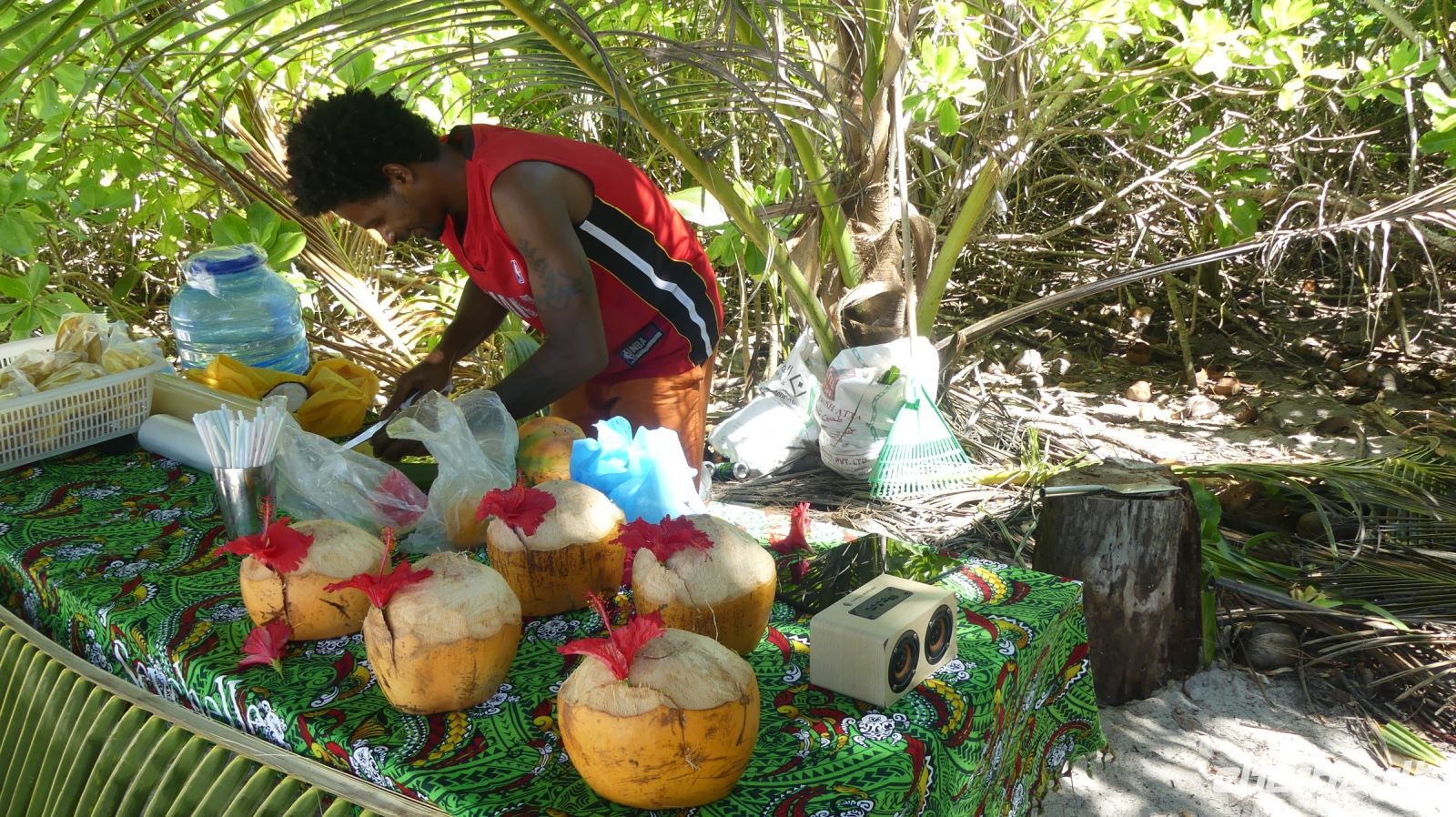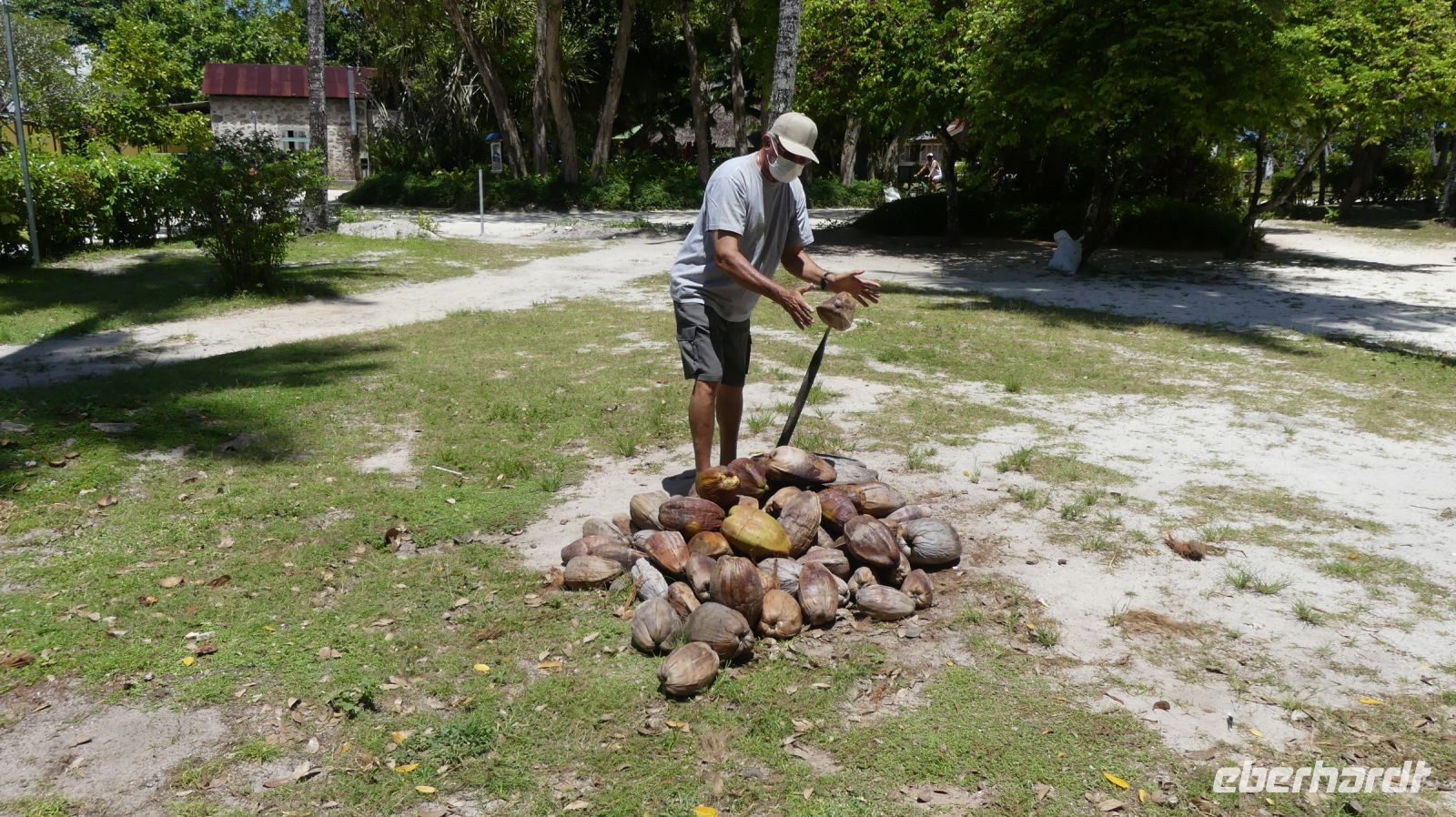 Im Park “L’Union Estate” beschäftigen wir uns zunächst einmal mit der Kokosnuss: Cyril zeigt uns das Schälen und Öffnen der Frucht, Kokosölgewinnung mit der Ochsenmühle, Herstellung von Kopra…. Auch Riesenschildkröten gibt es hier und die einzige Vanille-Plantage der Seychellen.