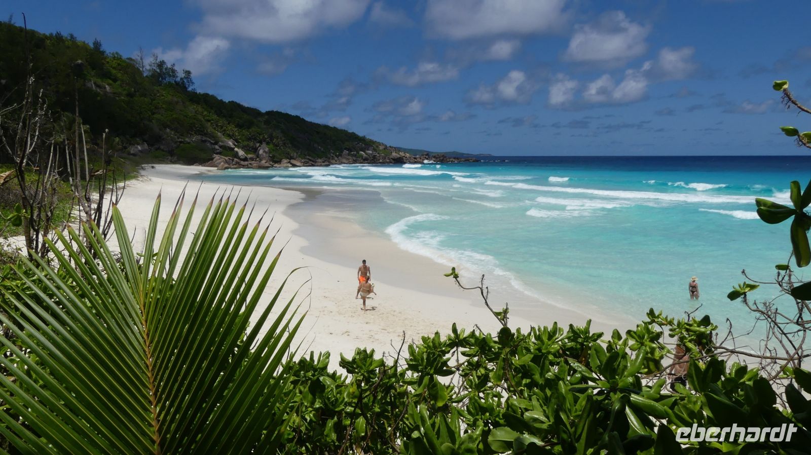 Von der Westküste geht es mit dem offenem Kastenwagen in wenigen Minuten zur Ostküste. Hier haben wir am Traumstrand Grand´ Anse unsere Mittagspause. Eingerahmt von Granitfelsen liegt der weiße Korallensandstrand am klaren türkisfarbenen Meer. Die intensiven Farben faszinieren uns immer wieder aufs Neue. Aber man muss aufpassen: da es kein vorgelagertes Riff gibt, sorgt die Brandung für schwer berechenbare Strömungen, weshalb man nicht weit hinausschwimmen kann.