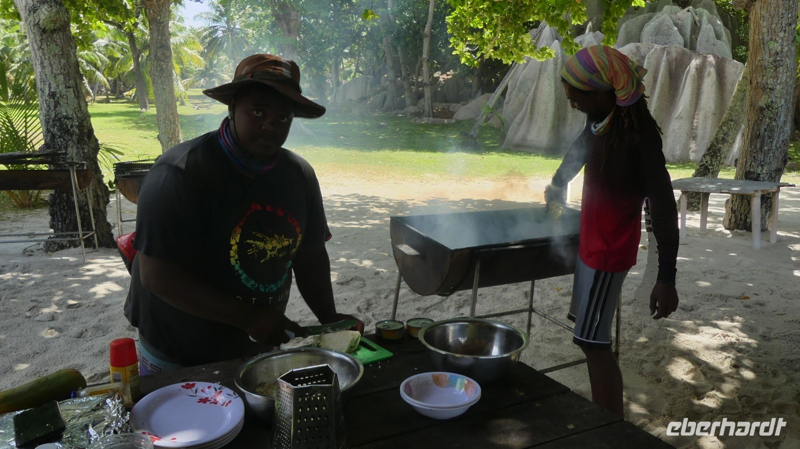Am Mittwoch sind wir zu sechst auf La Digue. Zu Beginn gibt es einen Schreck beim Kauf der Fährtickets: kein Pass, kein Ticket. Zum Glück rettet uns eine Passkopie von B. Am Morgen gab es noch Regenschauer, aber jetzt haben wir Glück, wir werden heute von Regen verschont bleiben. Auf La Digue angekommen, teilen wir uns auf – Fahrrad oder Strand Anse Severe. Mit dem Fahrrad erkunden wir die nördliche Inselhälfte. Nach 200 Meter gibt es einen Platten. Das Fahrrad wird schnell ausgetauscht, weiter geht´s. Die schmale Küstenstraße führt vorbei an verschieden Stränden mit so toll klingenden Namen wie Anse Severe, Anse Patatas, Anse Banana oder Anse Caiman. Am Ende der Straße stellen wir fest, dass selbst zu Fuß kein Weiterkommen möglich ist. Auf der Rückfahrt noch eine kleine Fahrradpanne – Kette runter gesprungen, schon kommt ein Seychello reparieren und wünscht uns noch einen schönen Urlaub. Am Anse Severe rasten wir an einem Strandimbiss – Bier und frisch gepresster Saft. Zufällig findet in der Nähe eine Strandhochzeit statt. Das Hochzeitspaar aus Frankreich verteilt nach der Trauung noch Hochzeitstorte …??