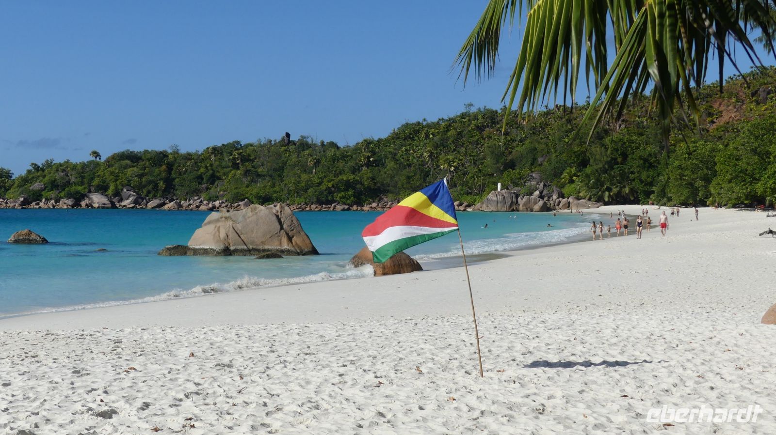 Exklusiv für unsere Gruppe steht uns heute ein Katamaran für den Ausflug nach La Digue zur Verfügung. Das Beiboot des Katamarans holt uns direkt am Hotelstrand ab. Vom Katamaran selbst haben wir mal eine andere Perspektive auf unser Hotel. Begleitet von einer sehr netten Crew, Beachmusik, Südseeklängen und Ben Zuckers „Geile Zeit“ schippern wir fröhlich Richtung La Digue. Hier angekommen, steigen wir auf einen LKW um, dessen offene Ladefläche mit Schattendach und Bänken ausgestattet ist. Busse gibt es auf La Digue nicht. Zunächst befahren wir die nördliche Küstenstraße entlang der Strände Anse Severe, Anse Patatas, Anse Grosse Roche und Anse Banana. Unser nächstes Ziel ist der Park “L’Union Estate” mit dem berühmten Traumstrand Anse Source d’Argent, beliebt bei Brautpaaren aus der ganzen Welt und einer der am meisten fotografierten Strände der Welt.