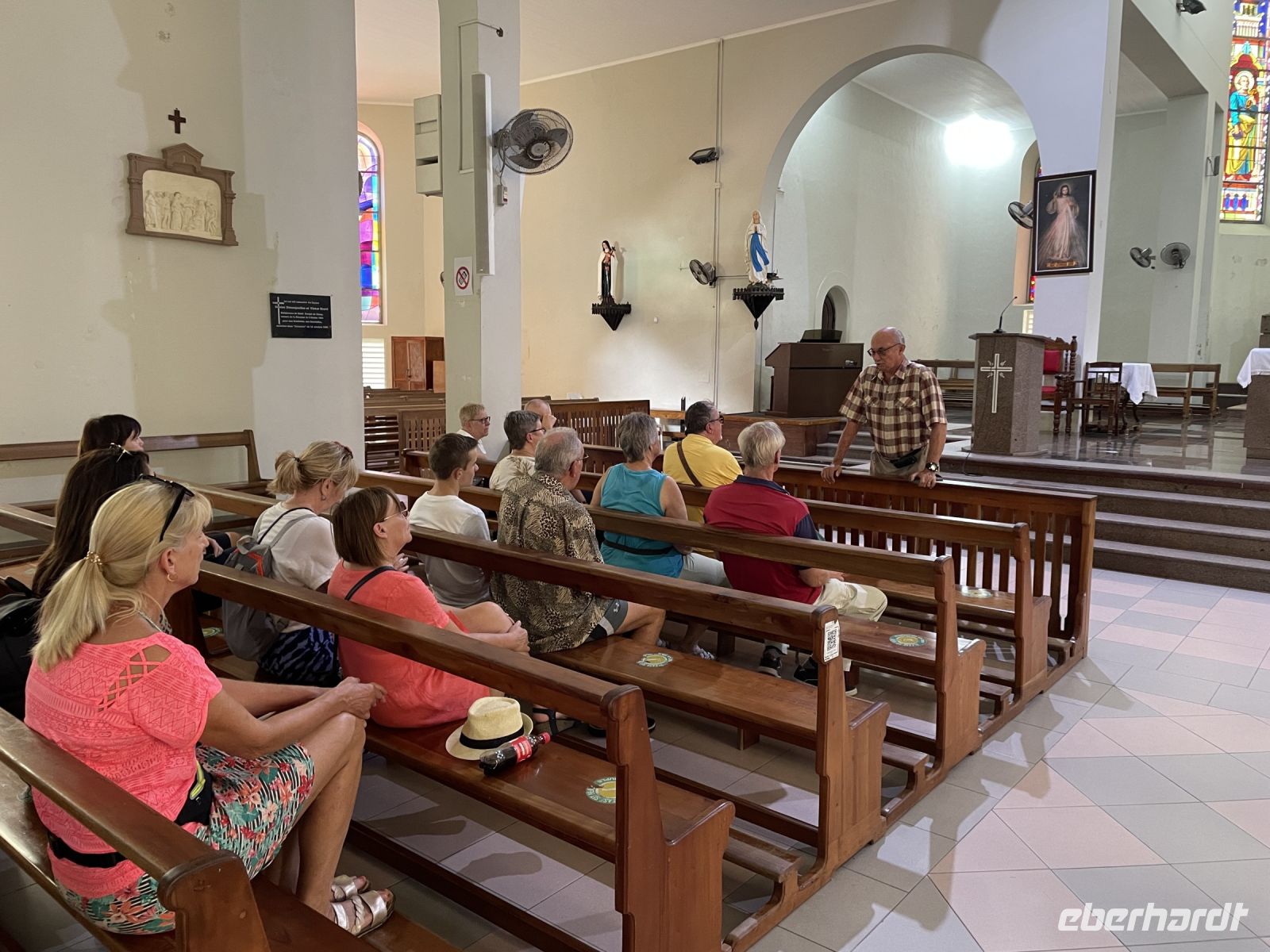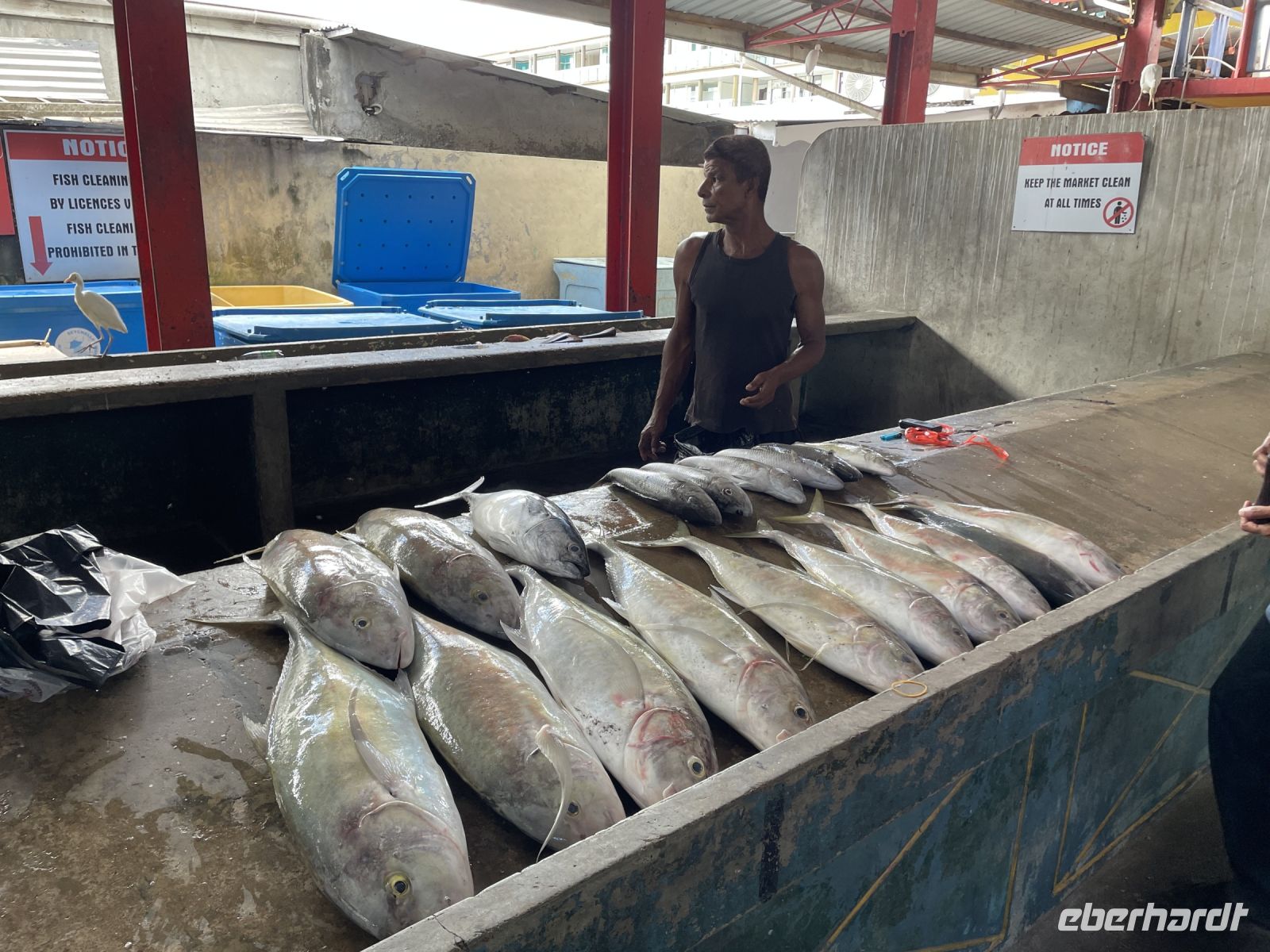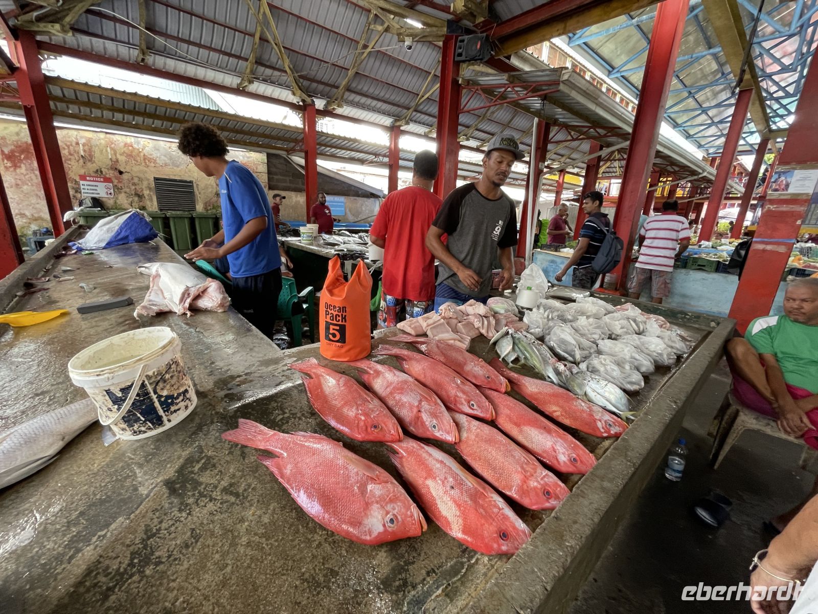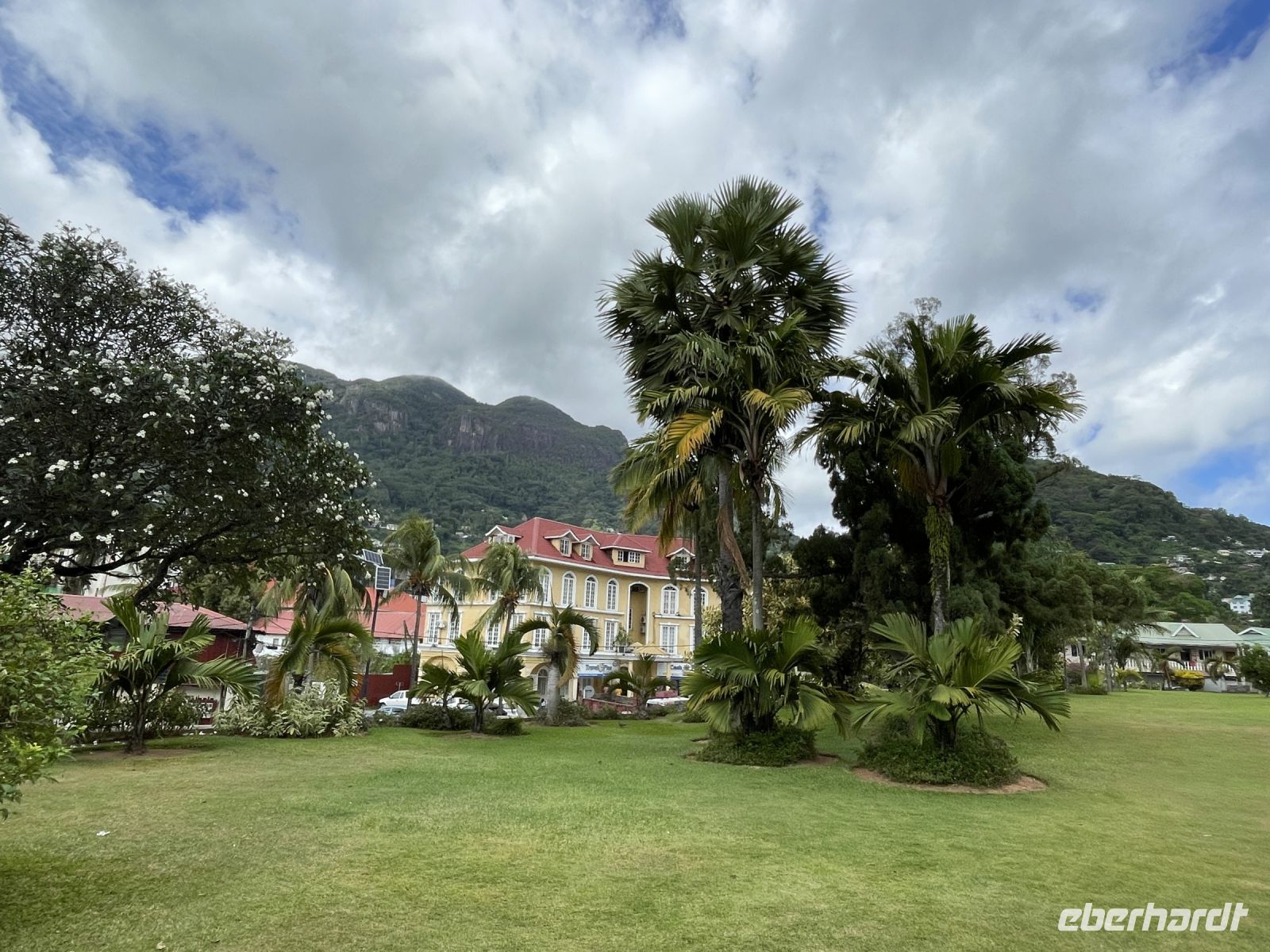 Kurz danach werden wir um 5:45 Uhr herzlich von unserem Reiseleiter Cyril in Empfang genommen. Nachdem wir etwas Bargeld für die nächsten Tage getauscht haben, fahren wir gemeinsam zum Hotel, wo wir die anderen Gäste auf der Reisegruppe antreffen, die bereits 4 Tage vorher angereist sind. Um 8:50Uhr treffen wir uns alle gemeinsam in der Lobby und erkunden zusammen mit Reiseleiter Cyril Teil 1 von Victoria. Unser Rundgang beginnt mit einem Besuch des Hindu-Tempels, wo gerade eine Messe stattfindet. Im Anschluss besuchen wir den öffentlichen Markt, auf dem frischer Fisch, Obst, Gemüse und Souvenirs angeboten werden. Danach steht ein Besuch der Kathedrale auf dem Programm, bevor wir um 12:00 Uhr zum Hotel zurückkehren. Die ersten Zimmer sind bereits bezugsfertig, die restlichen werden bis 13:30 Uhr fertiggestellt. Den Nachmittag gestalten wir individuell – Zeit zum Entspannen, Schlafen oder Baden.