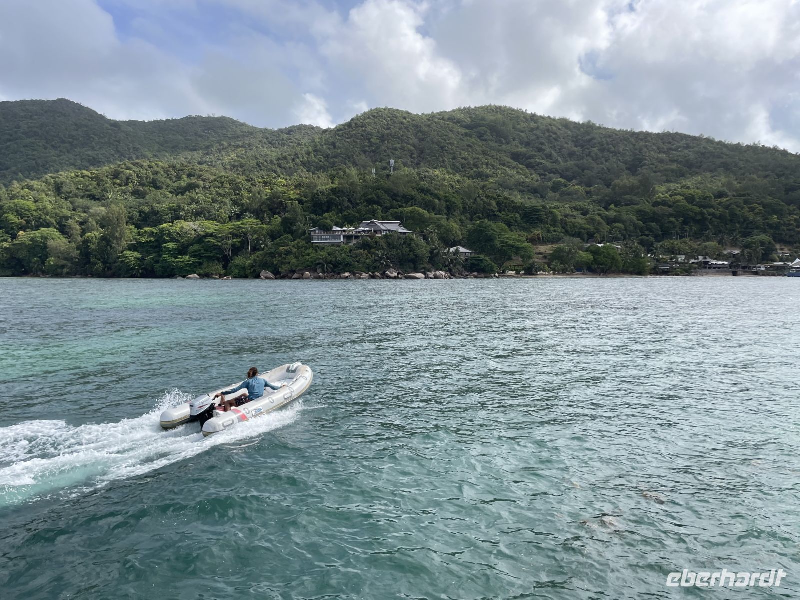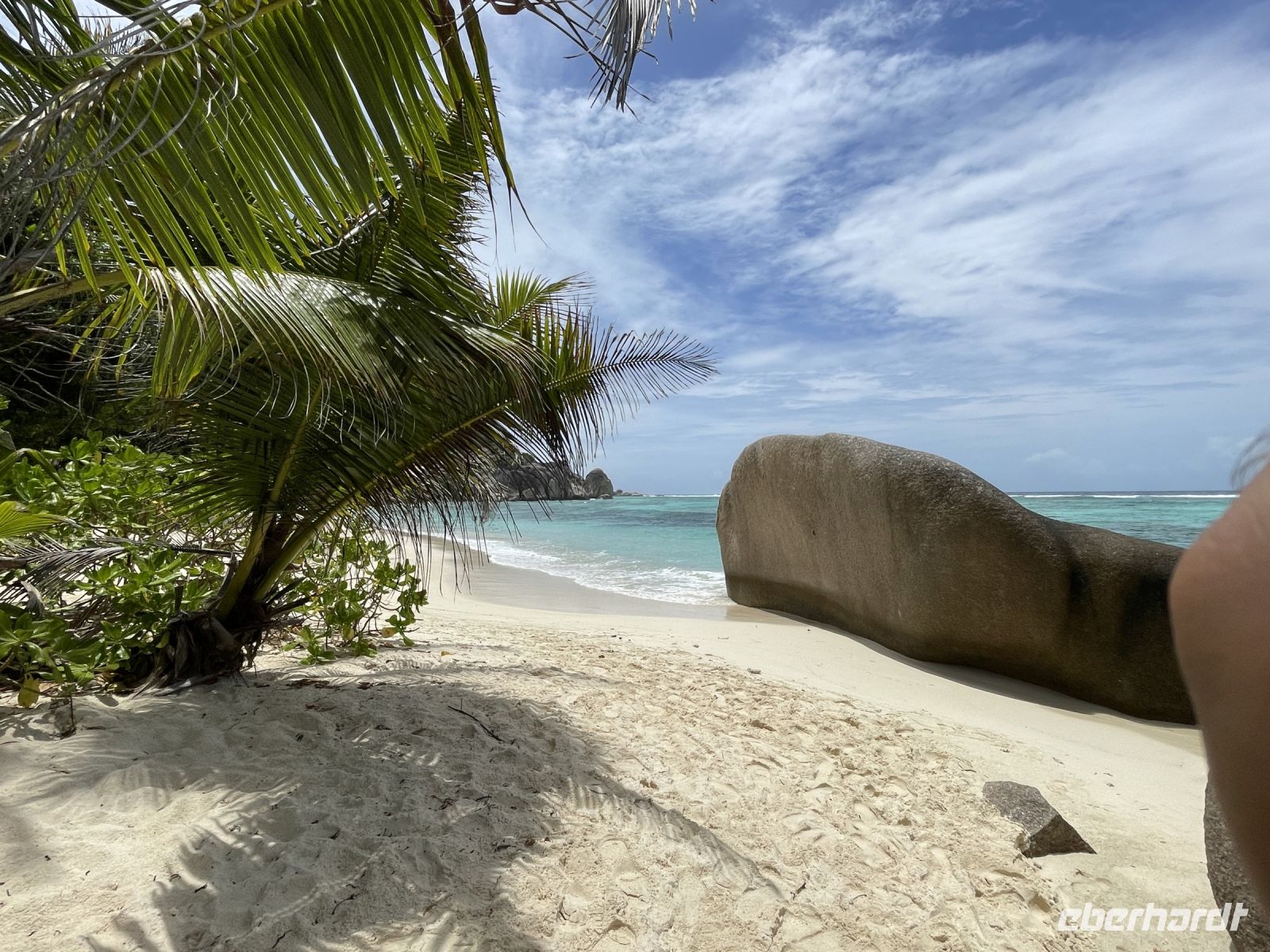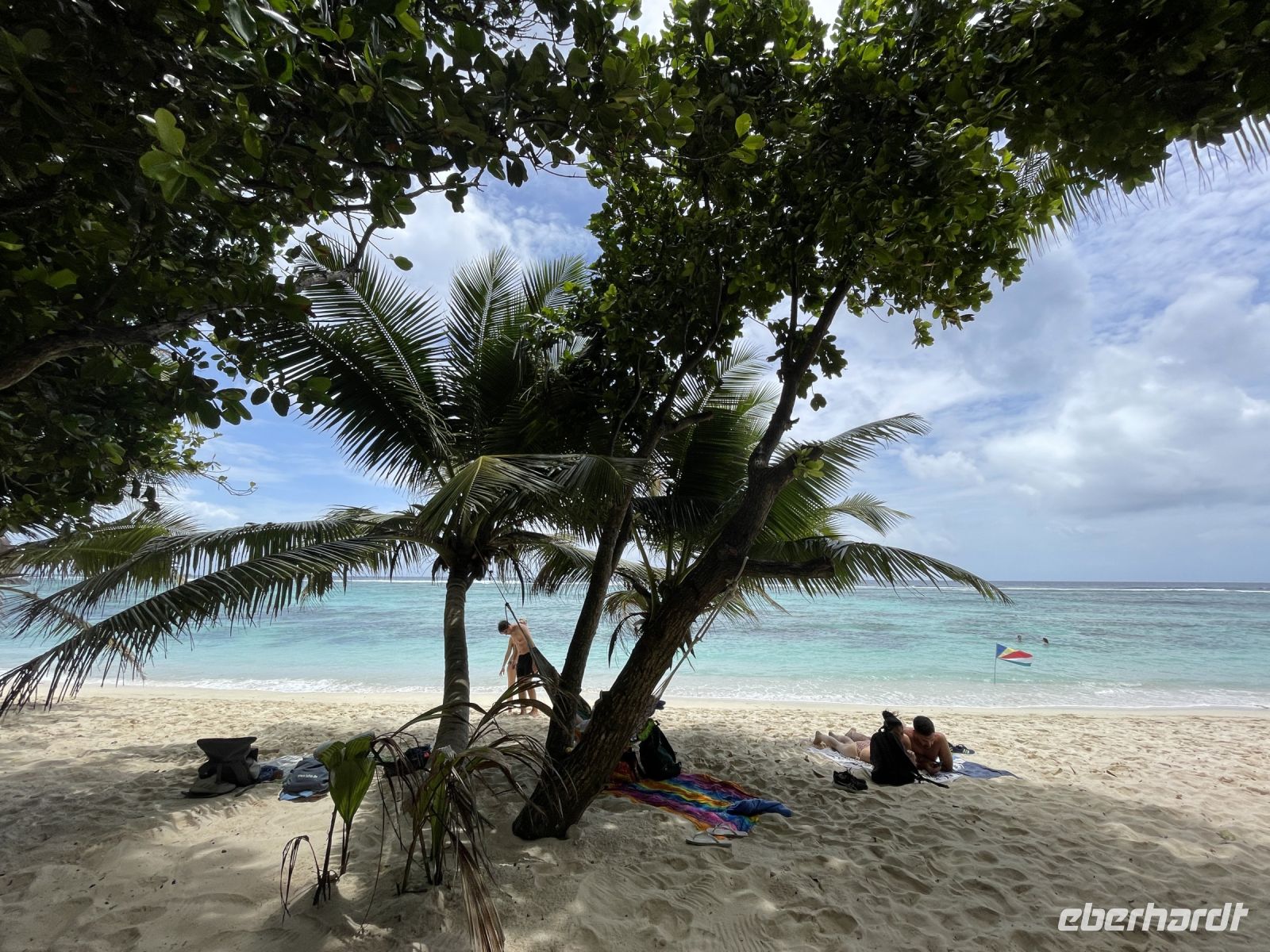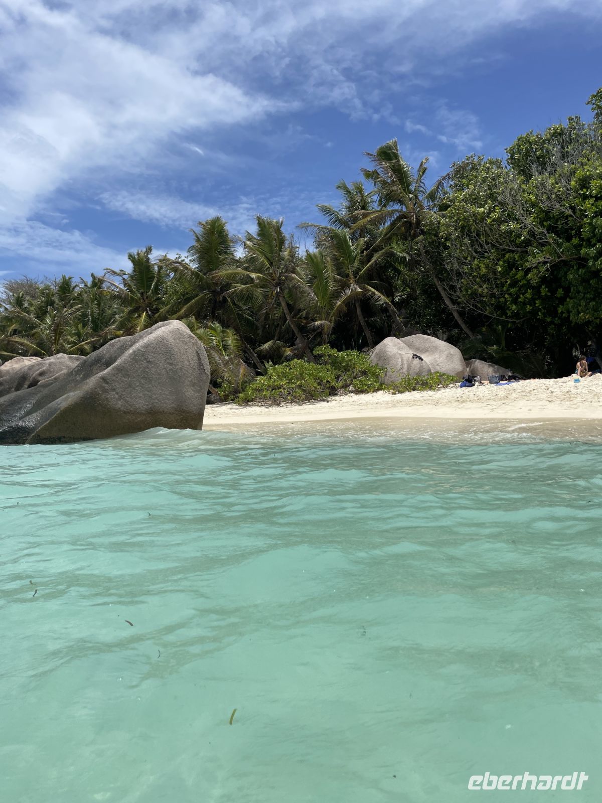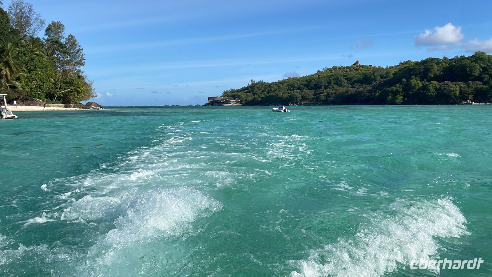 Um 9:00 Uhr starten wir direkt vom Hotel mit einem kleinen Schlauchboot, dass uns zum Katamaran bringt. Obwohl der Tag mit etwas trübem Wetter und leichtem Regen beginnt, klart es auf, während wir etwa 40 Minuten nach La Digue segeln. Bei unserer Ankunft scheint die Sonne, und wir werden von Jérôme abgeholt, der uns gemeinsam mit Cyril auf einem offenen LKW etwa zehn Minuten in den Süden der Insel fährt. Dort unternehmen wir einen Rundgang durch eine Kokosnussplantage, besuchen die Schildkröten und schlendern durch die Vanilleplantage, bevor wir schließlich einen der schönsten Strände der Welt erreichen. Am Strand Source d’Argent angekommen, genießen wir die Zeit zum Baden und Fotos knipsen. Durch die beeindruckenden Granitfelsen ergeben sich traumhafte Fotomotive. In den 90er Jahren wurde hier sogar einmal eine Barcadi-Rum Werbung gedreht, weshalb der Strand an Berühmtheit dazu gewann. Nach dem Badespaß treffen wir uns am Strandausgang und fahren mit dem LKW ca. 10min hinüber zum Grand Anse, wo wir ein leckeres Mittagessen auf uns wartet. Hier gibt es frische gegrillten Fisch. Nach dem Essen nutzen einige noch die Zeit, um in den Wellen zu planschen, jedoch nur bis zum Bauch, da das Schwimmen hier untersagt ist aufgrund der starken Strömung. Um 14:45 Uhr geht es zurück zum Hafen von La Digue. Nach einem kurzen Stopp an einem Schnorchelspot, wo wir etwa 30 Minuten die Unterwasserwelt erkunden, treten wir schließlich den Heimweg an. Wir fahren nicht um die Insel aufgrund der hohen Wellen, sondern nehmen den direkten Kurs Richtung Süden und genießen die Aussicht auf den Source d’Argent Strand, bevor wir gegen 17:00 Uhr unseren Hotelstrand erreichen. Um 19:00 Uhr treffen wir uns wieder zum Abendessen und genießen danach ein gemütliches Beisammensein am Infinity-Pool, wo ich drei Flaschen Weißwein zum Abschluss spendiere.