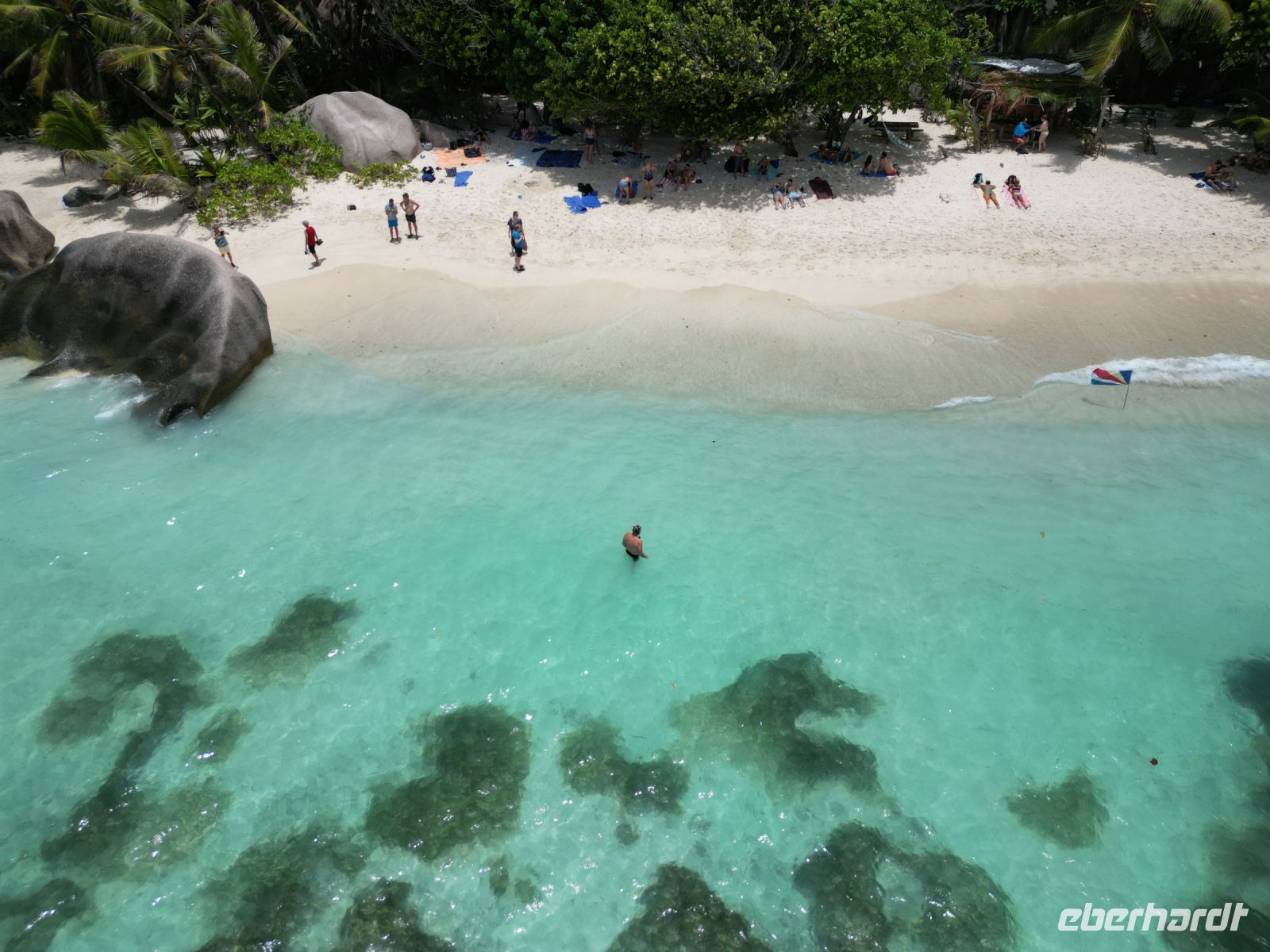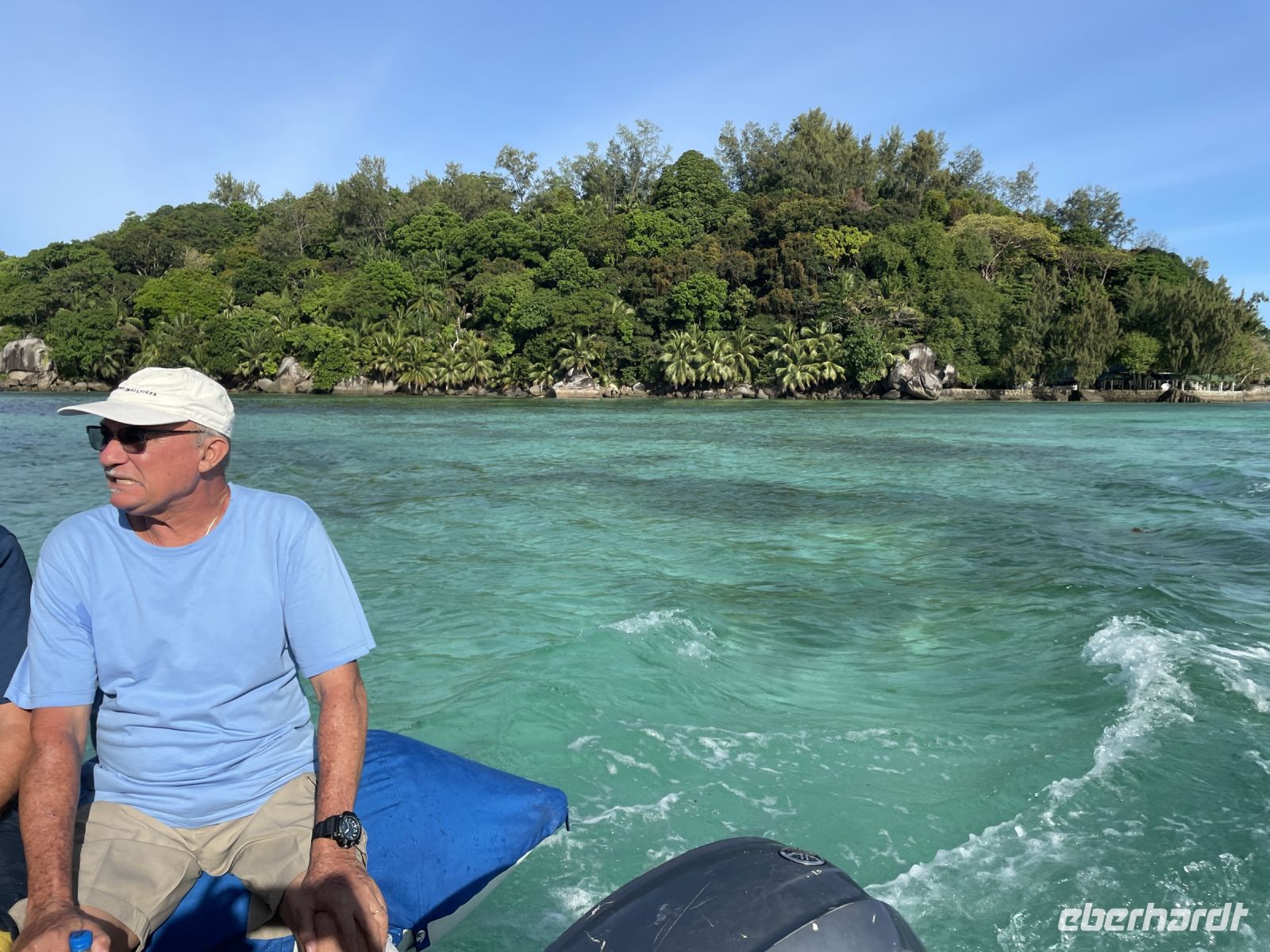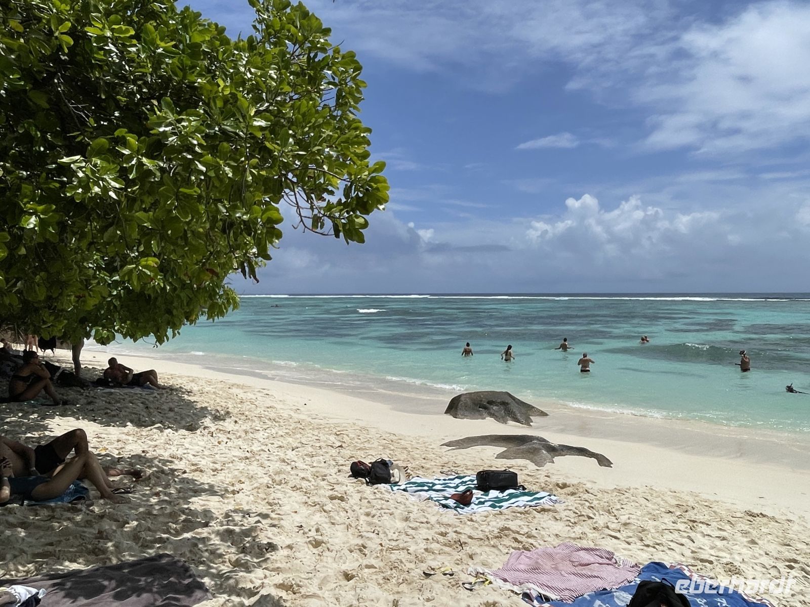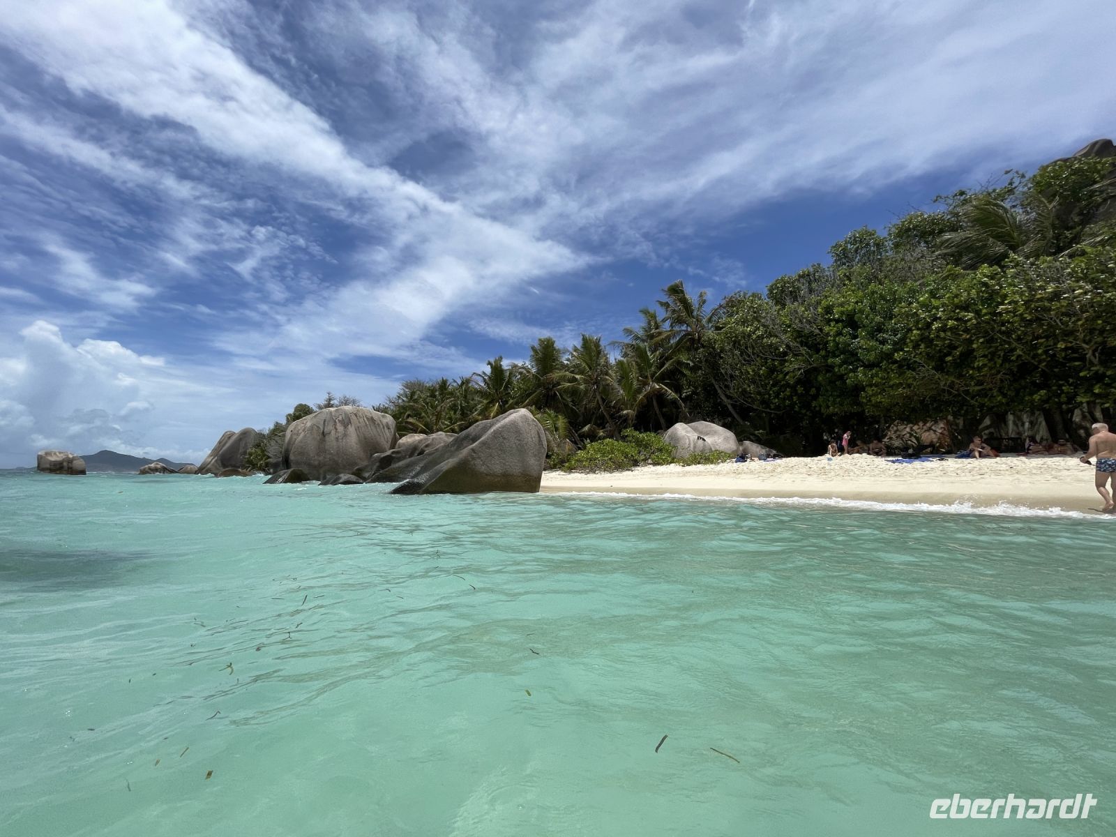 Um 9:00 Uhr starten wir direkt vom Hotel mit einem kleinen Schlauchboot, dass uns zum Katamaran bringt. Obwohl der Tag mit etwas trübem Wetter und leichtem Regen beginnt, klart es auf, während wir etwa 40 Minuten nach La Digue segeln. Bei unserer Ankunft scheint die Sonne, und wir werden von Jérôme abgeholt, der uns gemeinsam mit Cyril auf einem offenen LKW etwa zehn Minuten in den Süden der Insel fährt. Dort unternehmen wir einen Rundgang durch eine Kokosnussplantage, besuchen die Schildkröten und schlendern durch die Vanilleplantage, bevor wir schließlich einen der schönsten Strände der Welt erreichen. Am Strand Source d’Argent angekommen, genießen wir die Zeit zum Baden und Fotos knipsen. Durch die beeindruckenden Granitfelsen ergeben sich traumhafte Fotomotive. In den 90er Jahren wurde hier sogar einmal eine Barcadi-Rum Werbung gedreht, weshalb der Strand an Berühmtheit dazu gewann. Nach dem Badespaß treffen wir uns am Strandausgang und fahren mit dem LKW ca. 10min hinüber zum Grand Anse, wo wir ein leckeres Mittagessen auf uns wartet. Hier gibt es frische gegrillten Fisch. Nach dem Essen nutzen einige noch die Zeit, um in den Wellen zu planschen, jedoch nur bis zum Bauch, da das Schwimmen hier untersagt ist aufgrund der starken Strömung. Um 14:45 Uhr geht es zurück zum Hafen von La Digue. Nach einem kurzen Stopp an einem Schnorchelspot, wo wir etwa 30 Minuten die Unterwasserwelt erkunden, treten wir schließlich den Heimweg an. Wir fahren nicht um die Insel aufgrund der hohen Wellen, sondern nehmen den direkten Kurs Richtung Süden und genießen die Aussicht auf den Source d’Argent Strand, bevor wir gegen 17:00 Uhr unseren Hotelstrand erreichen. Um 19:00 Uhr treffen wir uns wieder zum Abendessen und genießen danach ein gemütliches Beisammensein am Infinity-Pool, wo ich drei Flaschen Weißwein zum Abschluss spendiere.