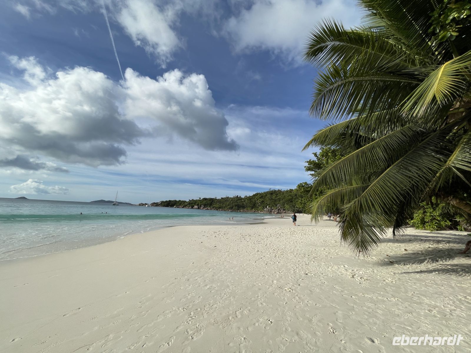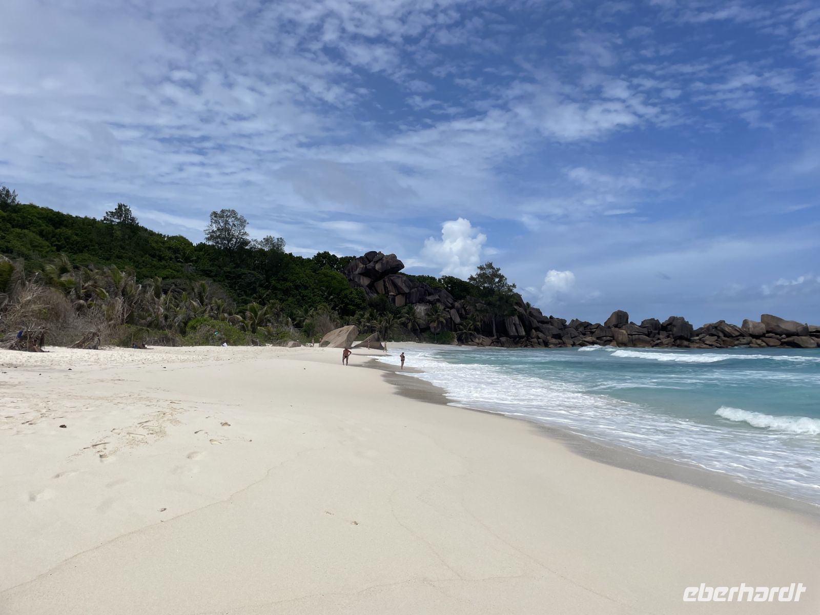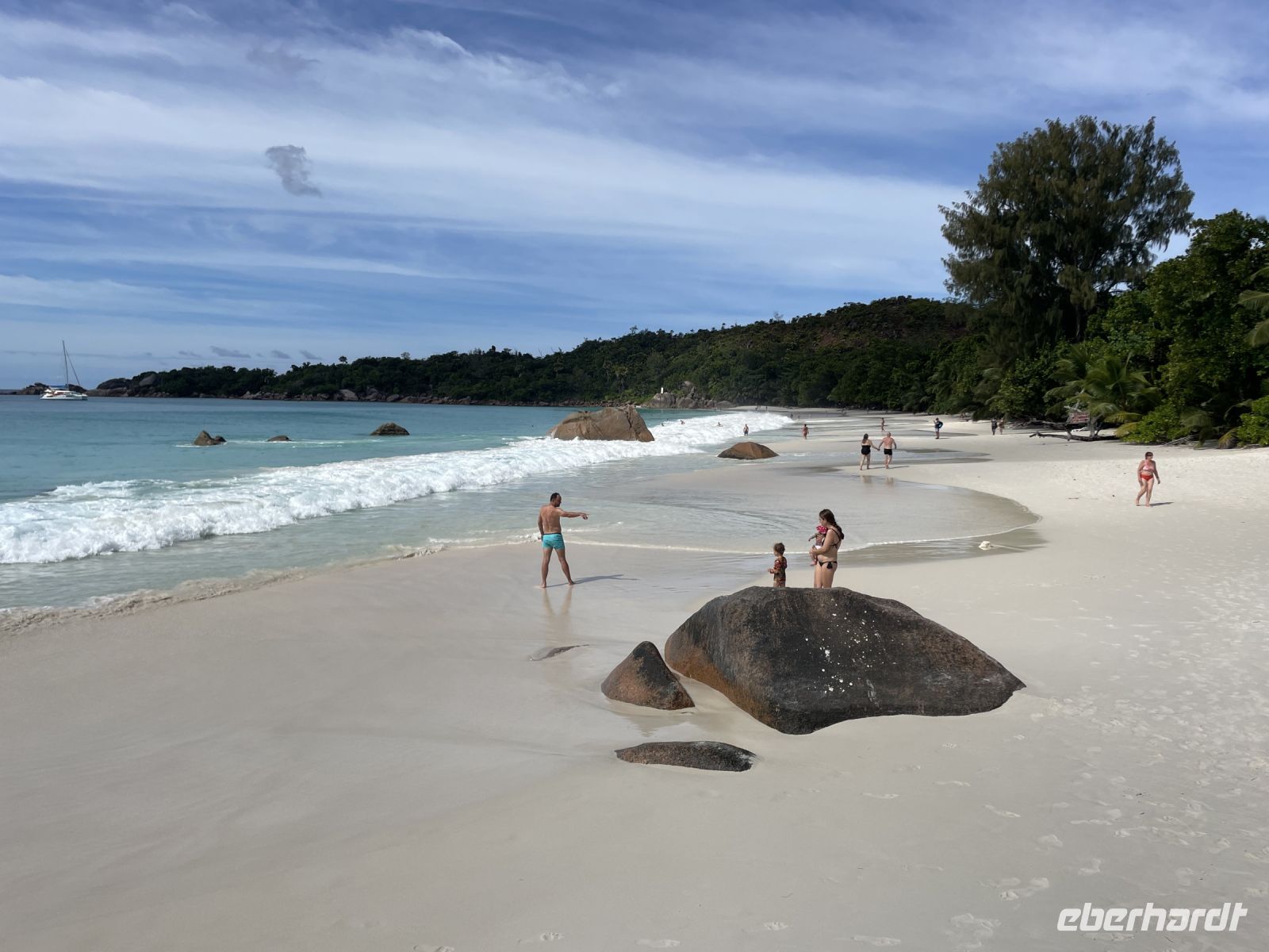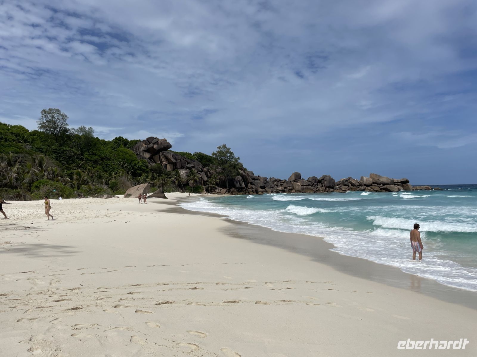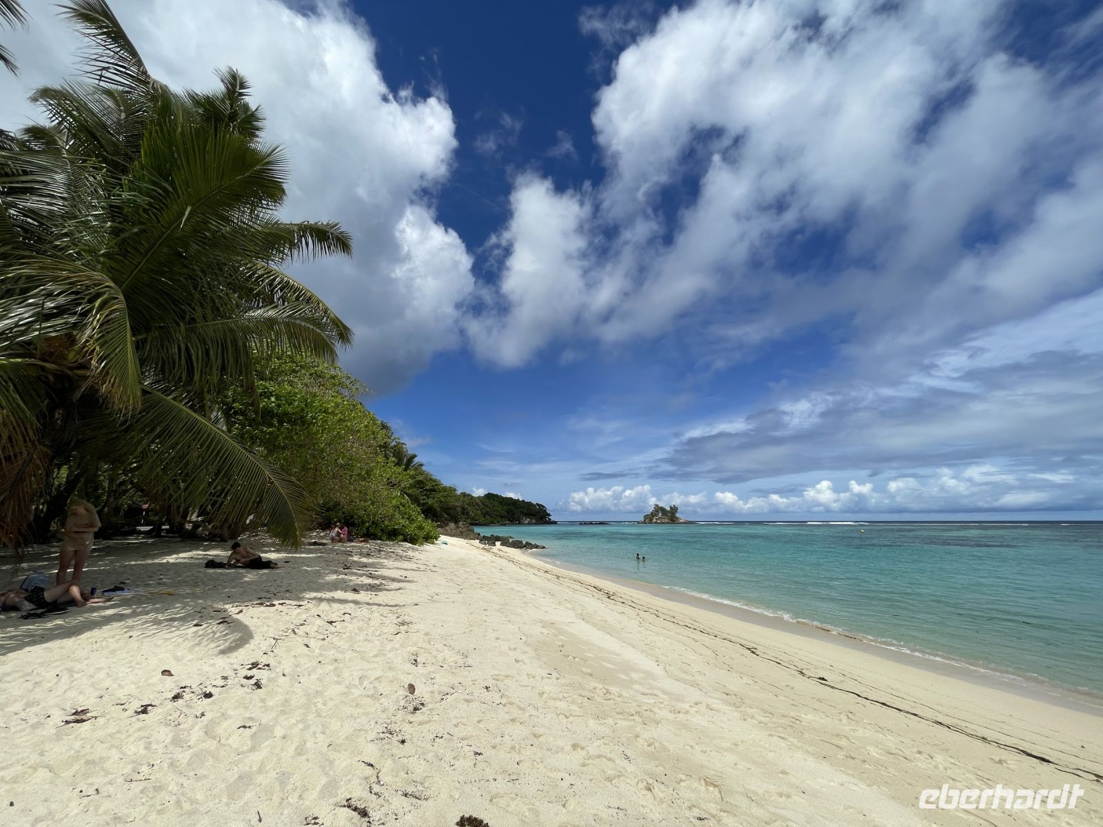Um 9:00 Uhr starten wir direkt vom Hotel mit einem kleinen Schlauchboot, dass uns zum Katamaran bringt. Obwohl der Tag mit etwas trübem Wetter und leichtem Regen beginnt, klart es auf, während wir etwa 40 Minuten nach La Digue segeln. Bei unserer Ankunft scheint die Sonne, und wir werden von Jérôme abgeholt, der uns gemeinsam mit Cyril auf einem offenen LKW etwa zehn Minuten in den Süden der Insel fährt. Dort unternehmen wir einen Rundgang durch eine Kokosnussplantage, besuchen die Schildkröten und schlendern durch die Vanilleplantage, bevor wir schließlich einen der schönsten Strände der Welt erreichen. Am Strand Source d’Argent angekommen, genießen wir die Zeit zum Baden und Fotos knipsen. Durch die beeindruckenden Granitfelsen ergeben sich traumhafte Fotomotive. In den 90er Jahren wurde hier sogar einmal eine Barcadi-Rum Werbung gedreht, weshalb der Strand an Berühmtheit dazu gewann. Nach dem Badespaß treffen wir uns am Strandausgang und fahren mit dem LKW ca. 10min hinüber zum Grand Anse, wo wir ein leckeres Mittagessen auf uns wartet. Hier gibt es frische gegrillten Fisch. Nach dem Essen nutzen einige noch die Zeit, um in den Wellen zu planschen, jedoch nur bis zum Bauch, da das Schwimmen hier untersagt ist aufgrund der starken Strömung. Um 14:45 Uhr geht es zurück zum Hafen von La Digue. Nach einem kurzen Stopp an einem Schnorchelspot, wo wir etwa 30 Minuten die Unterwasserwelt erkunden, treten wir schließlich den Heimweg an. Wir fahren nicht um die Insel aufgrund der hohen Wellen, sondern nehmen den direkten Kurs Richtung Süden und genießen die Aussicht auf den Source d’Argent Strand, bevor wir gegen 17:00 Uhr unseren Hotelstrand erreichen. Um 19:00 Uhr treffen wir uns wieder zum Abendessen und genießen danach ein gemütliches Beisammensein am Infinity-Pool, wo ich drei Flaschen Weißwein zum Abschluss spendiere.