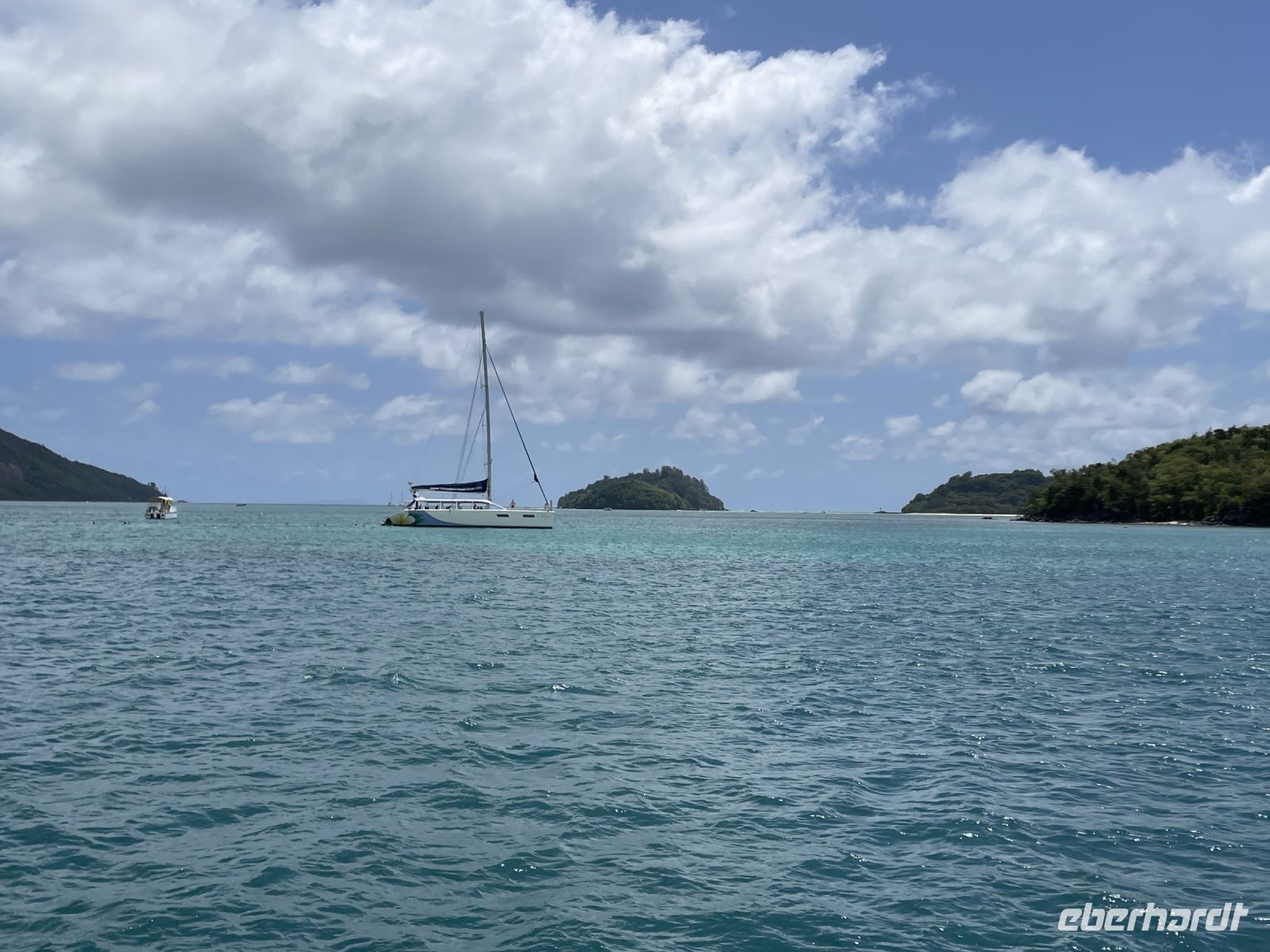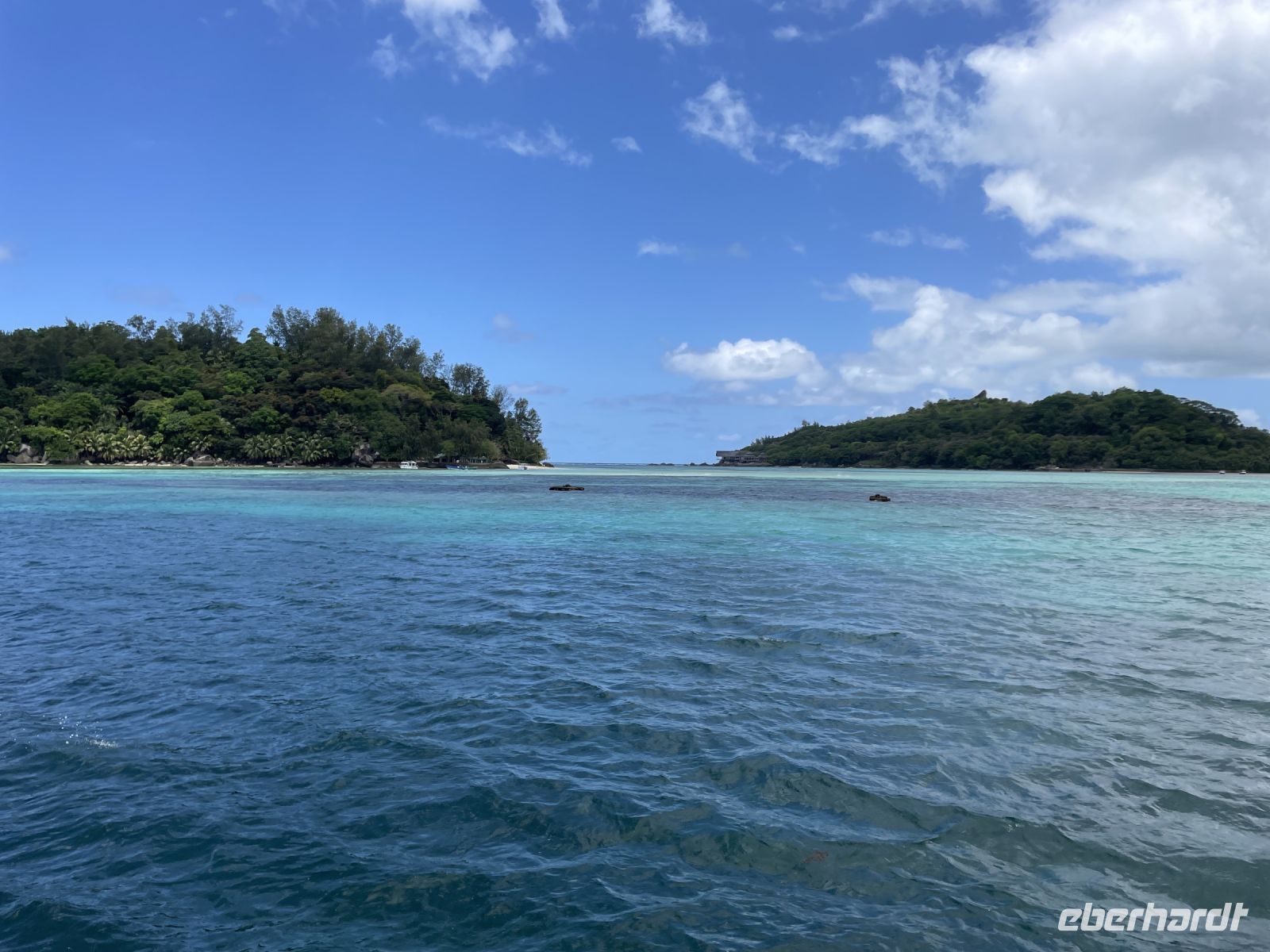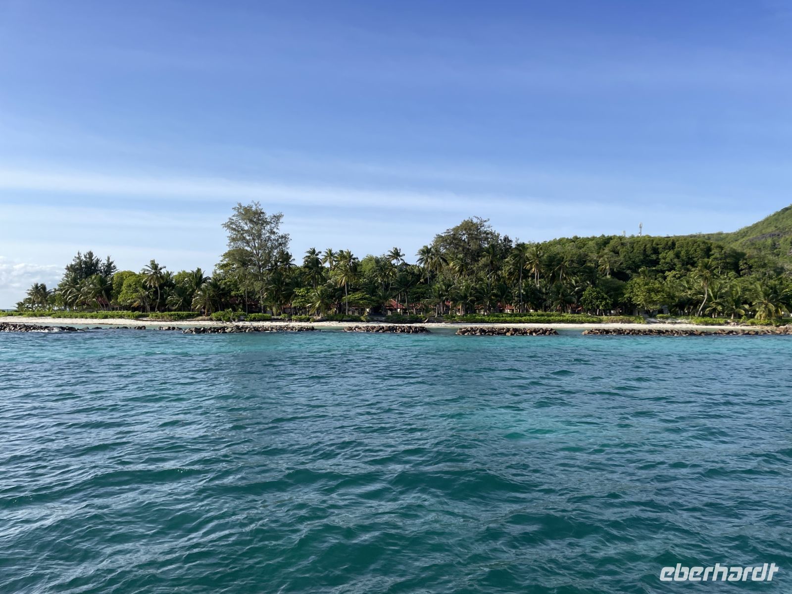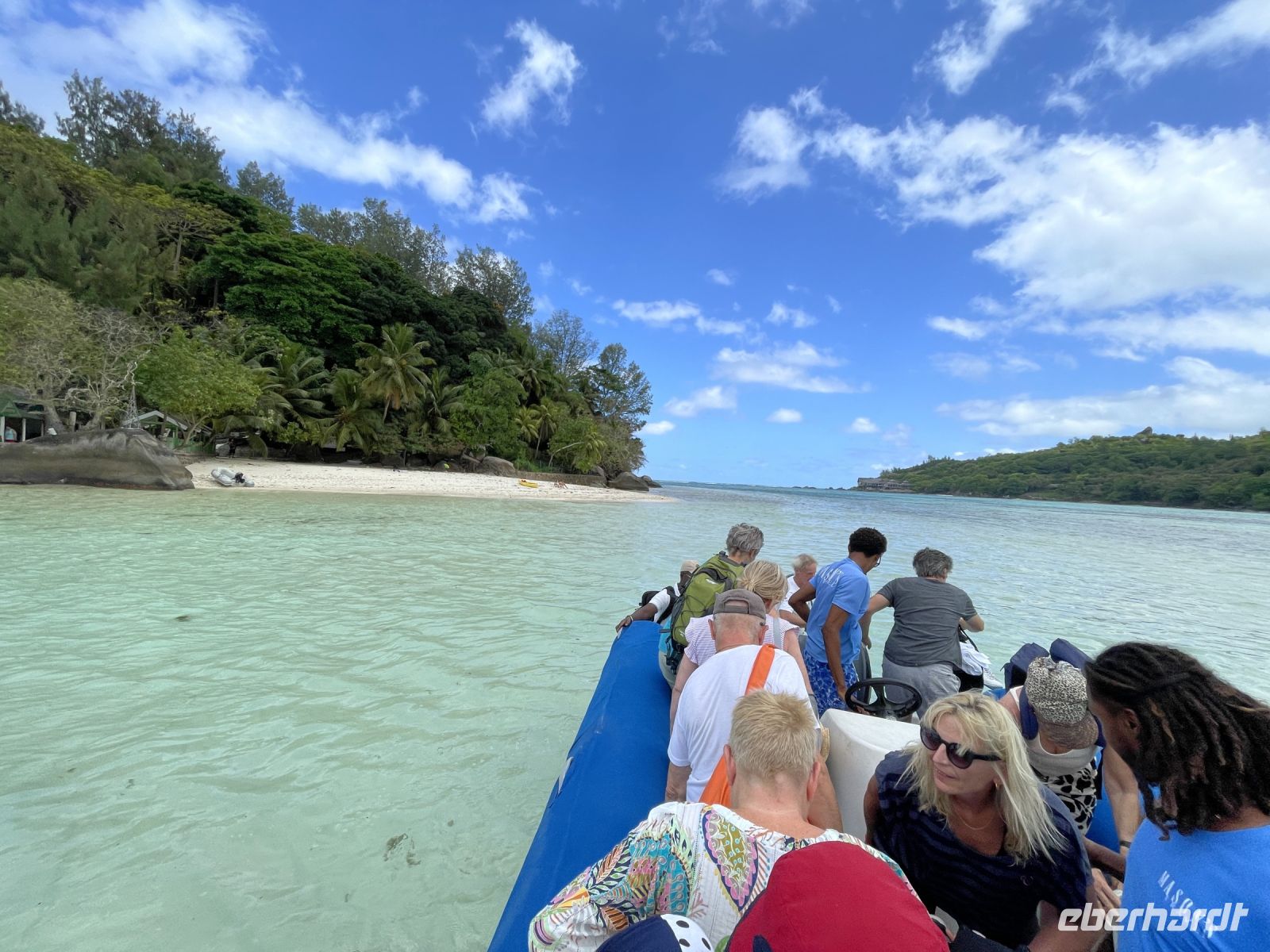Um 9:15 Uhr starten wir vom Hotel in Richtung Fährhafen. Gemeinsam gehen wir an Bord unseres Ausflugskatamarans und nach einer kurzen Sicherheitseinweisung legt das Boot ab. Nach einer Dreiviertelstunde Fahrtzeit erreichen wir den Sainte Anne Marine National Park. Ein Teil der Gäste betritt als erstes das Glasbodenboot und der andere Teil schippert mit dem Katamaran entlang der Inseln. Danach sind wir dran und steigen ins Glasbodenboot hinab, wo wir viele bunte Fische und Korallen sehen können. Am frühen Nachmittag erreichen wir Moyenne Island, wo wir unseren kleinen Rundgang beginnen. Das erste große Highlight lässt nicht lange auf sich warten. Wir sehen die ersten Riesenschildkröten, die sich gerne füttern und streicheln lassen – eine ideale Gelegenheit für unvergessliche Fotos. Der Weg führt uns weiter bergauf, wo Cyril uns spannendes über die Insel und deren ehemaligen Besitzer Brandon erzählt. Am höchsten Punkt sehen wir das Grab Brandons und das zweier unbekannter Piraten. Außerdem sei auf der Insel ein Piratenschatz versteckt, der immer noch nicht gefunden wurde. Wir haben ihn leider auch nicht gefunden und spazieren daher wieder zurück. Der Rundgang endet am Strand, wo sich auch ein Restaurant befindet. Hier haben wir noch Zeit zum Baden, Schnorcheln oder um ein Bierchen zu trinken. Um 16:00 Uhr fahren wir mit dem Schlauchboot zurück zum Katamaran. Auf der Rückfahrt gibt es leckere Cocktails und eine Tanzeinlage von der Bootscrew. Dem Sonnuntergang entgegen, geht es nun zurück zum Hafen von Mahé. Dort angekommen bringt uns Reiseleiter Cyril wieder zum Hotel und zum Abendessen treffen wir uns alle im Restaurant wieder. Nach dem schmackhaften Abendessen, sitzen wir gemütlich in der Lobby zusammen und lassen den wunderschönen Tag bei einem Gleis Wein ausklingen.