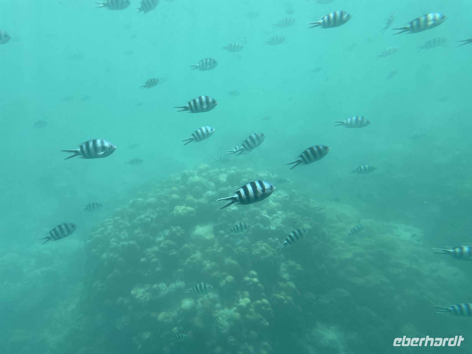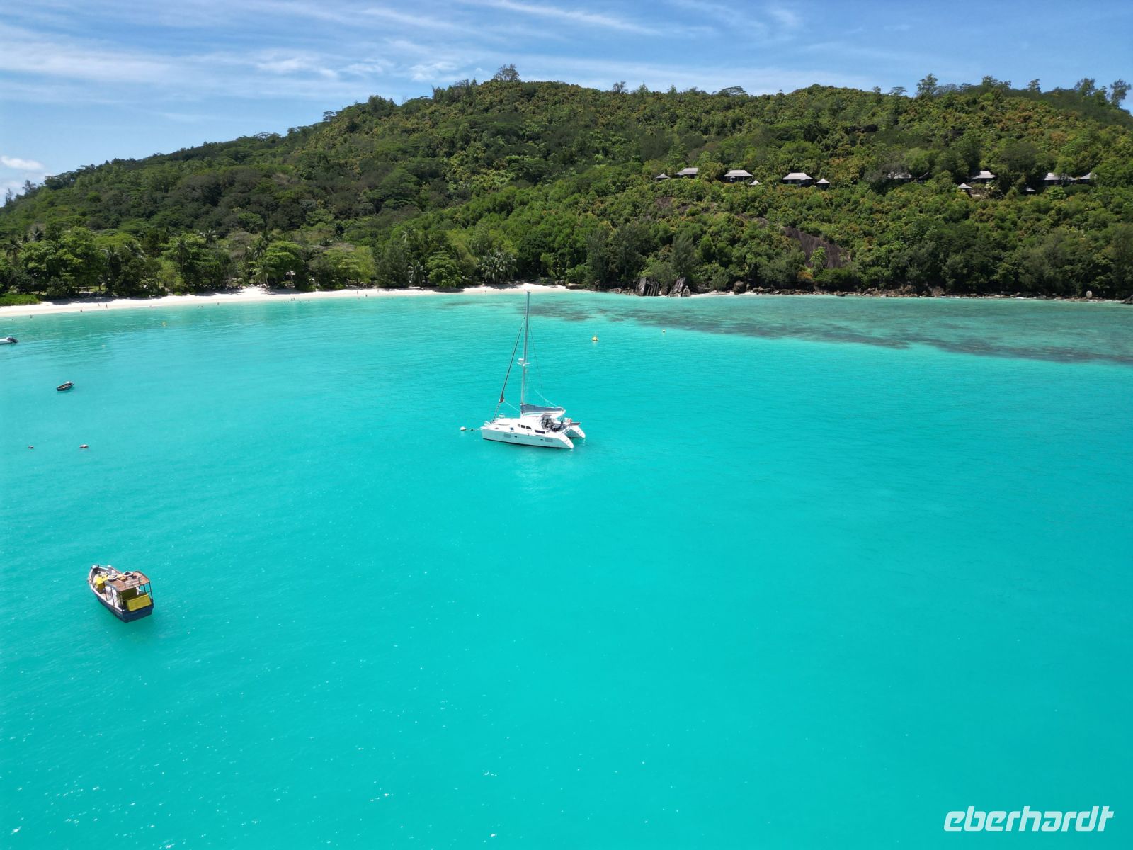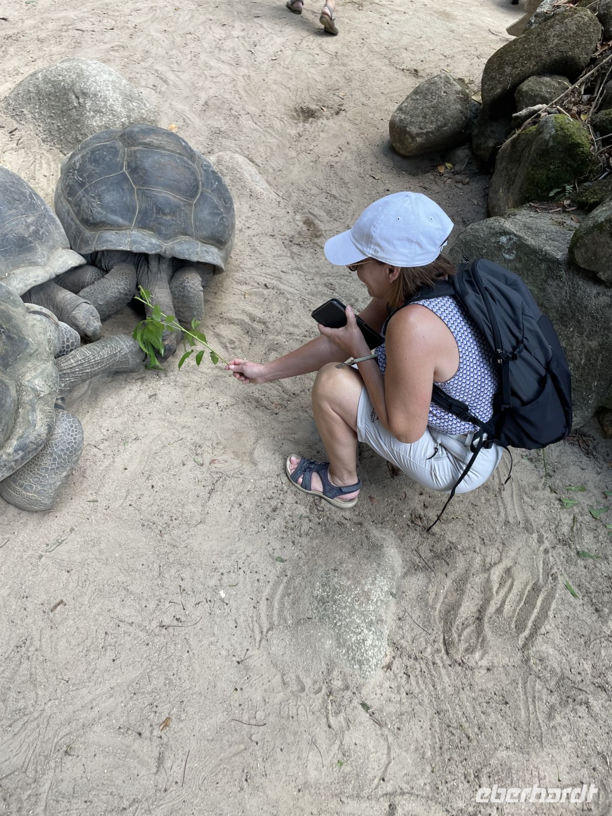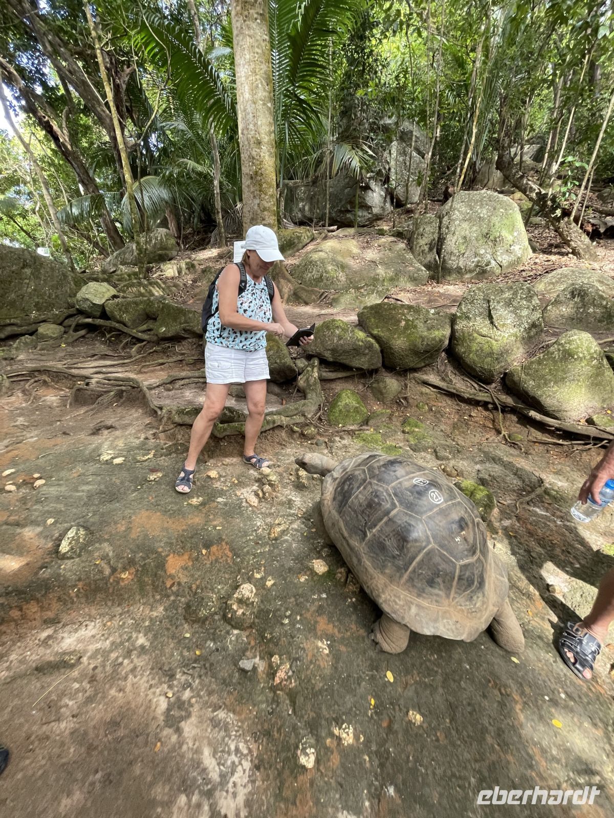 Um 9:15 Uhr starten wir vom Hotel in Richtung Fährhafen. Gemeinsam gehen wir an Bord unseres Ausflugskatamarans und nach einer kurzen Sicherheitseinweisung legt das Boot ab. Nach einer Dreiviertelstunde Fahrtzeit erreichen wir den Sainte Anne Marine National Park. Ein Teil der Gäste betritt als erstes das Glasbodenboot und der andere Teil schippert mit dem Katamaran entlang der Inseln. Danach sind wir dran und steigen ins Glasbodenboot hinab, wo wir viele bunte Fische und Korallen sehen können. Am frühen Nachmittag erreichen wir Moyenne Island, wo wir unseren kleinen Rundgang beginnen. Das erste große Highlight lässt nicht lange auf sich warten. Wir sehen die ersten Riesenschildkröten, die sich gerne füttern und streicheln lassen – eine ideale Gelegenheit für unvergessliche Fotos. Der Weg führt uns weiter bergauf, wo Cyril uns spannendes über die Insel und deren ehemaligen Besitzer Brandon erzählt. Am höchsten Punkt sehen wir das Grab Brandons und das zweier unbekannter Piraten. Außerdem sei auf der Insel ein Piratenschatz versteckt, der immer noch nicht gefunden wurde. Wir haben ihn leider auch nicht gefunden und spazieren daher wieder zurück. Der Rundgang endet am Strand, wo sich auch ein Restaurant befindet. Hier haben wir noch Zeit zum Baden, Schnorcheln oder um ein Bierchen zu trinken. Um 16:00 Uhr fahren wir mit dem Schlauchboot zurück zum Katamaran. Auf der Rückfahrt gibt es leckere Cocktails und eine Tanzeinlage von der Bootscrew. Dem Sonnuntergang entgegen, geht es nun zurück zum Hafen von Mahé. Dort angekommen bringt uns Reiseleiter Cyril wieder zum Hotel und zum Abendessen treffen wir uns alle im Restaurant wieder. Nach dem schmackhaften Abendessen, sitzen wir gemütlich in der Lobby zusammen und lassen den wunderschönen Tag bei einem Gleis Wein ausklingen.