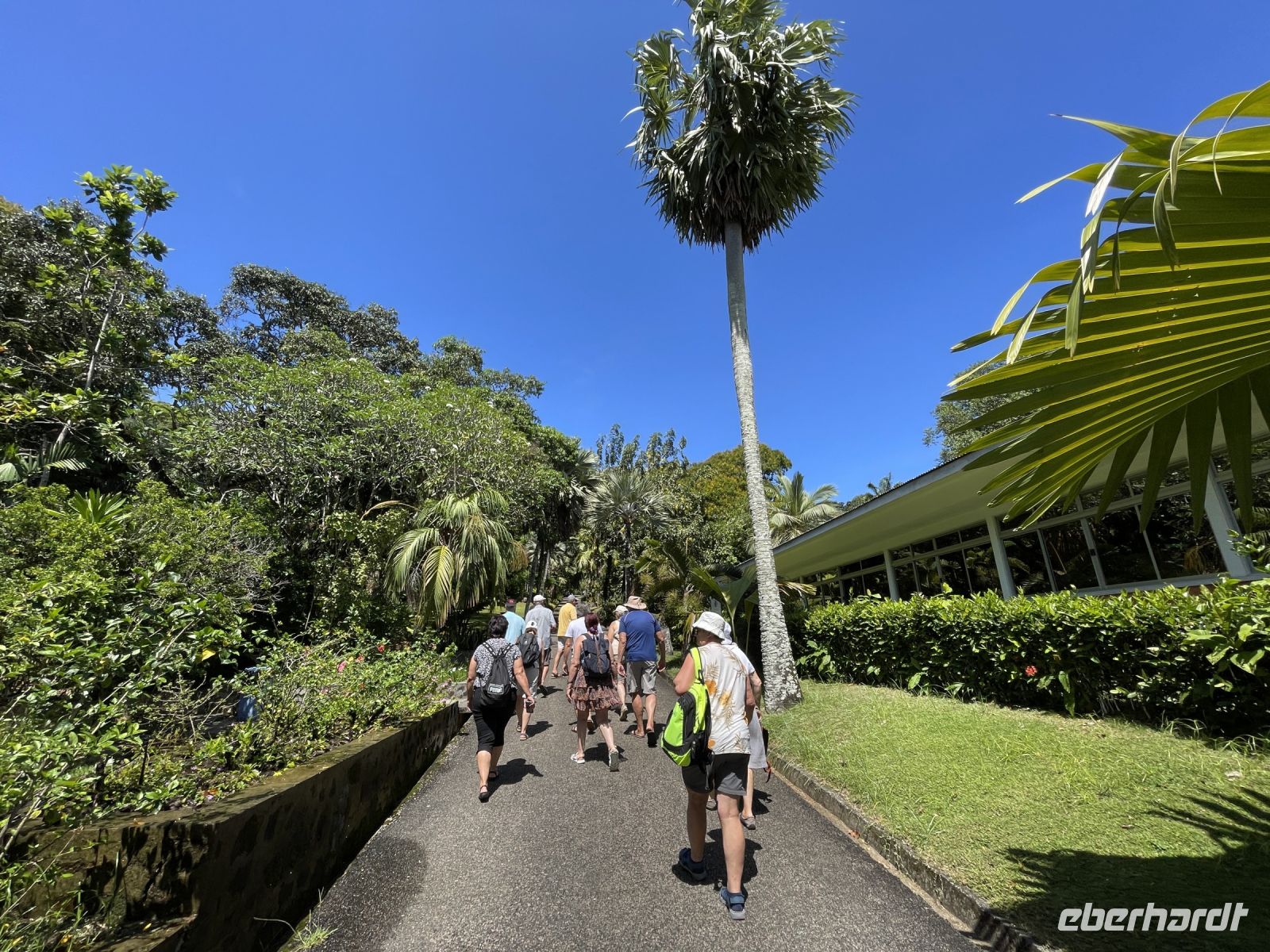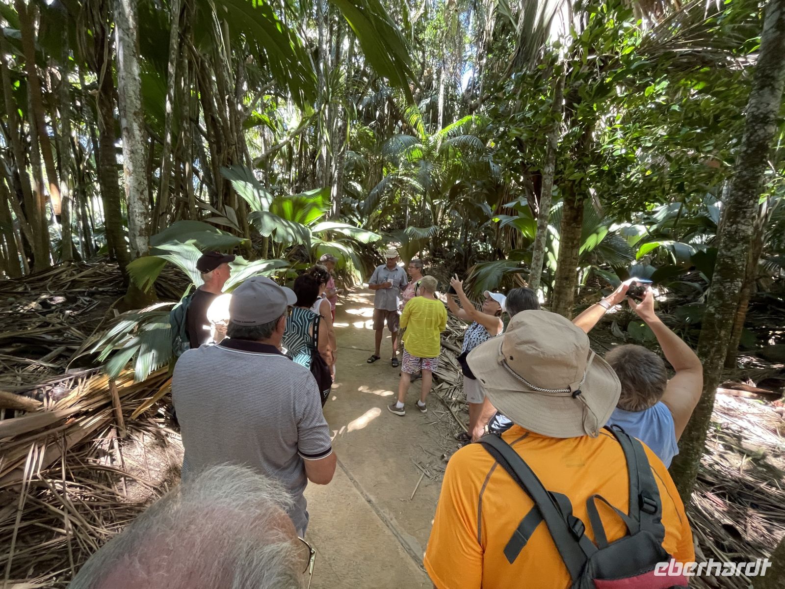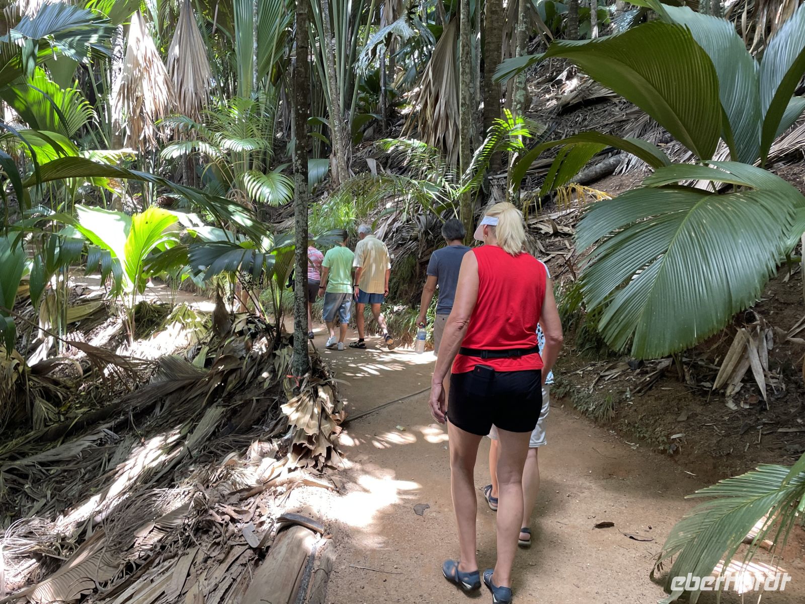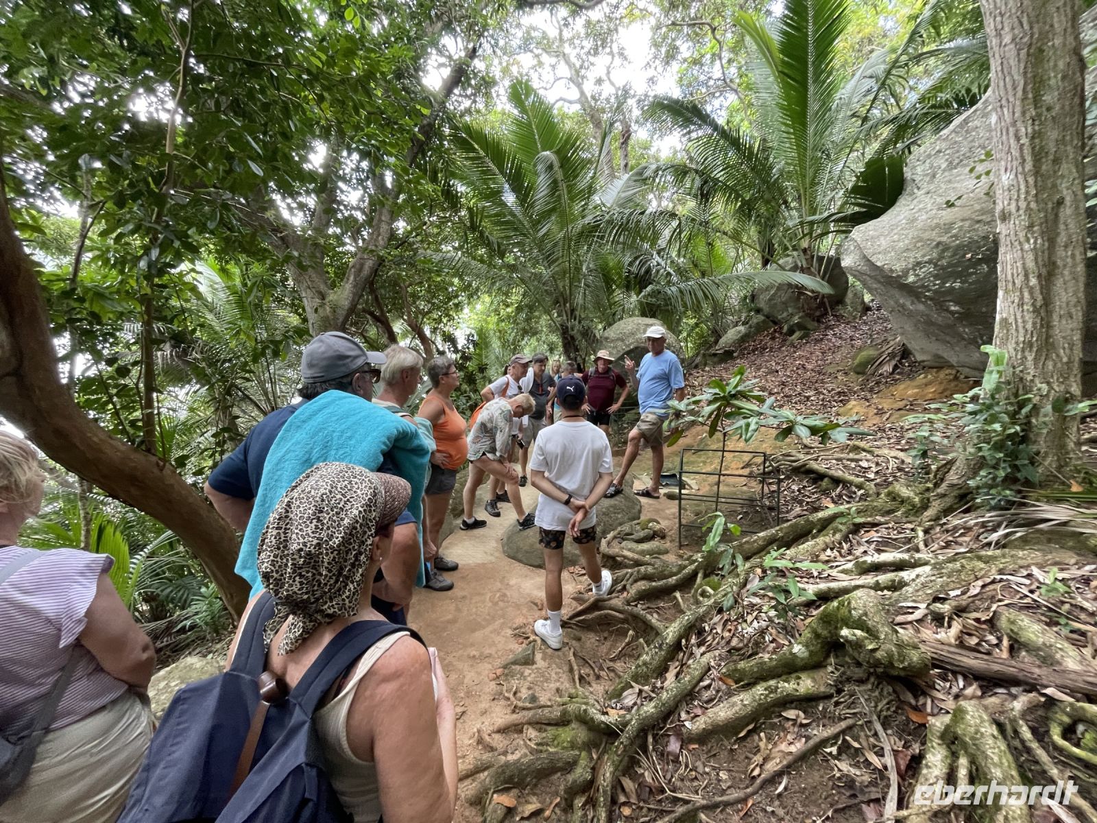 Heute besuchen wir den Nationalpark Vallée de Mai. Auf dem Weg halten wir kurz an einem Supermarkt, um uns mit Getränken einzudecken. Um 10:15 Uhr erreichen wir den Eingang des Nationalparks. Während Cyril die Tickets organisiert, nutzen wir die Toiletten und machen uns bereit für das Naturerlebnis. Gemeinsam unternehmen wir einen ausführlichen Rundgang wo Cyril alles Wichtige über die größte Nussart der Welt erklärt – die Coco de Mer. Zum Abschluss dürfen wir natürlich die weibliche Nuss und die passende männliche Komponente in der Hand halten. Anschließend statten wir dem Tourishop noch einen Besuch ab und setzen unsere Reise fort in Richtung Norden von Praslin. Wir fahren vorbei am kleinen Insel-Flughafen von und einem 18-Loch-Golfplatz, wo einige von uns noch schnell ein paar Fotos schießen von der wunderschönen Parkanlage. Um 12:20 Uhr erreichen wir das Oasis Hotel und genießen dort ein köstliches kreolisches Mittagsbuffet. Danach fahren wir weiter zum Strand von Anse Lazio, wo wir reichliche 2 Stunden Zeit haben zum Baden und entspannen. Auf der Rückfahrt halten wir erneut kurz am Supermarkt, bevor wir kurze Zeit später wieder im Hotel ankommen. Der Rest des Nachmittags steht zur freien Verfügung. Um 19:00 Uhr treffen wir uns zum Abendessen und lassen den Tag gemütlich ausklingen.