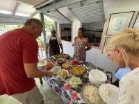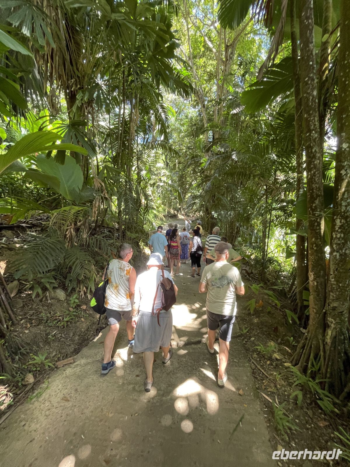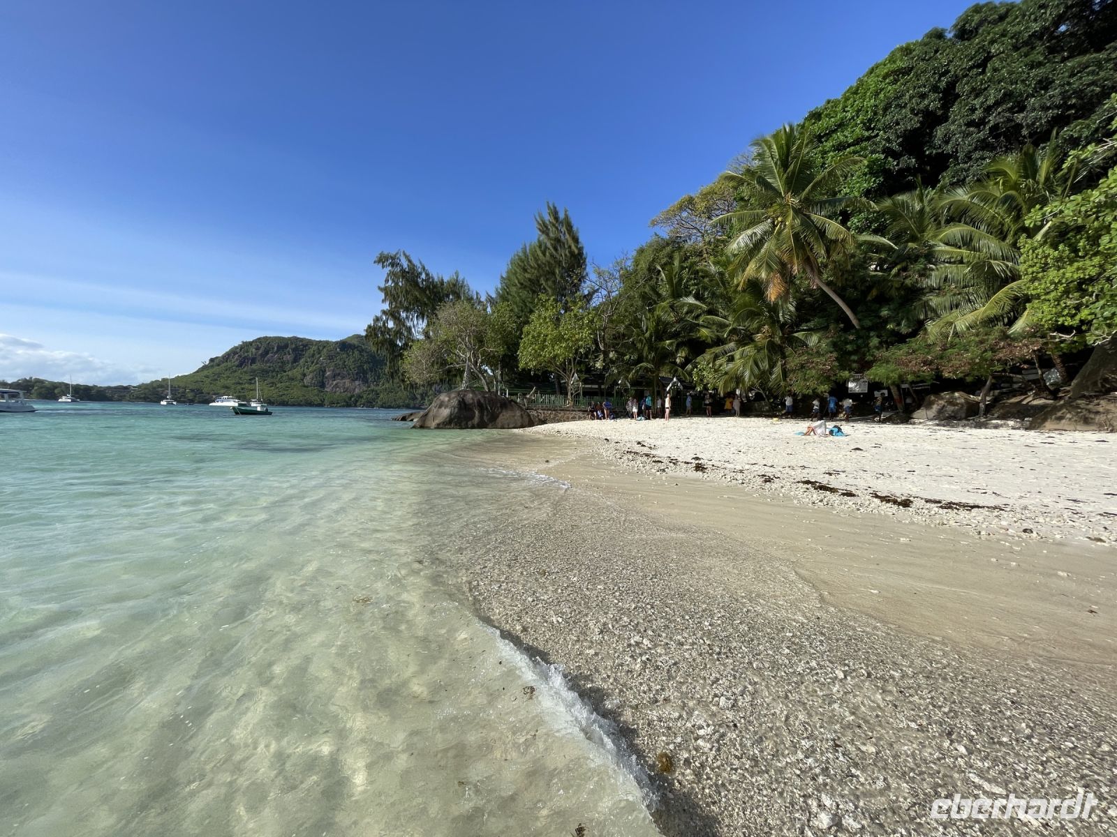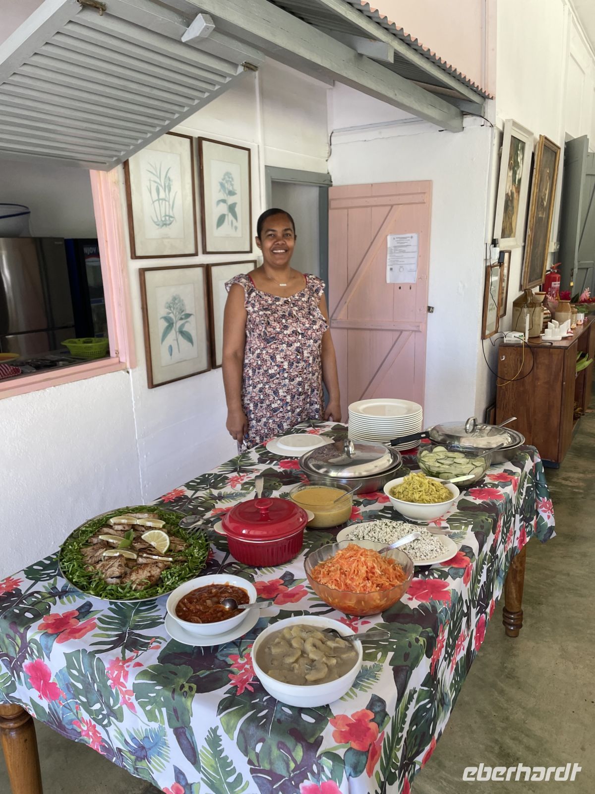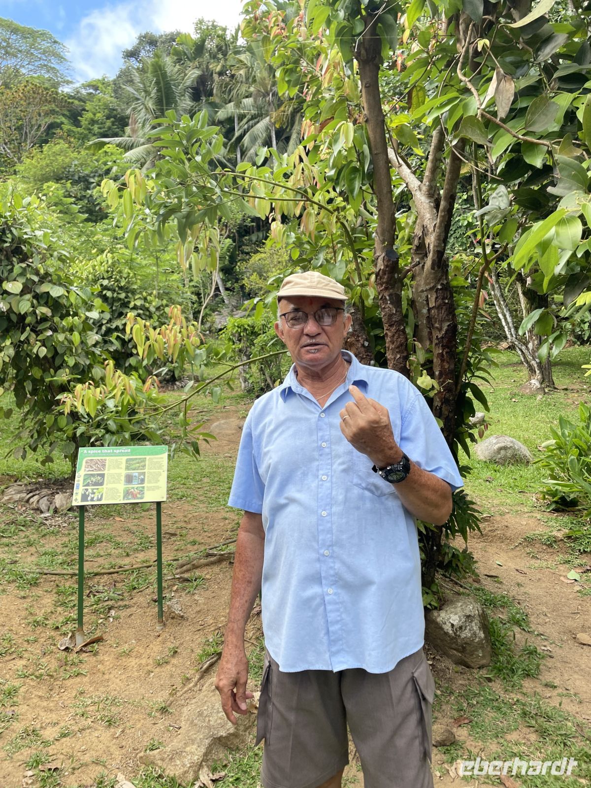 Nun heißt es schon wieder Abschied nehmen von Mahé. Daher checken wir früh nach dem Frühstück aus und begleichen unsere Zimmerrechnungen. Jeder Gast hat die Möglichkeit, das Gepäck entweder selbst zur Rezeption zu bringen oder den Transportservice in Anspruch zu nehmen. Um 9:50 Uhr bitten wir alle, ihr Gepäck in der Lobby noch einmal zu identifizieren, bevor es in ein separates Fahrzeug geladen und zum Hafen gebracht wird. Da unsere Fähre erst Nachmittag zur nächsten Insel fährt, haben wir noch genügend Zeit um den südlichen Teil von Mahé zu erkunden. Unser erster Stopp ist der malerische Strand Anse Royal. Danach geht es weiter zum Gewürzgarten, wo wir mit Reiseleiter Cyril einen einstündigen Rundgang unternehmen. Dabei erfahren wir spannendes über die kreolische Gewürz- und Pflanzenwelt. Gegen 12:30 Uhr genießen wir dort ein köstliches kreolisches Buffet zum Mittagessen. Auch hier schmeckt es wieder hervorragend, denn die kreolische Küche kombiniert exotische Gerichte aus Indien, dem Orient aber auch europäischer/französischer Kochkultur. Meistens gesund und vor allem lecker. :-)