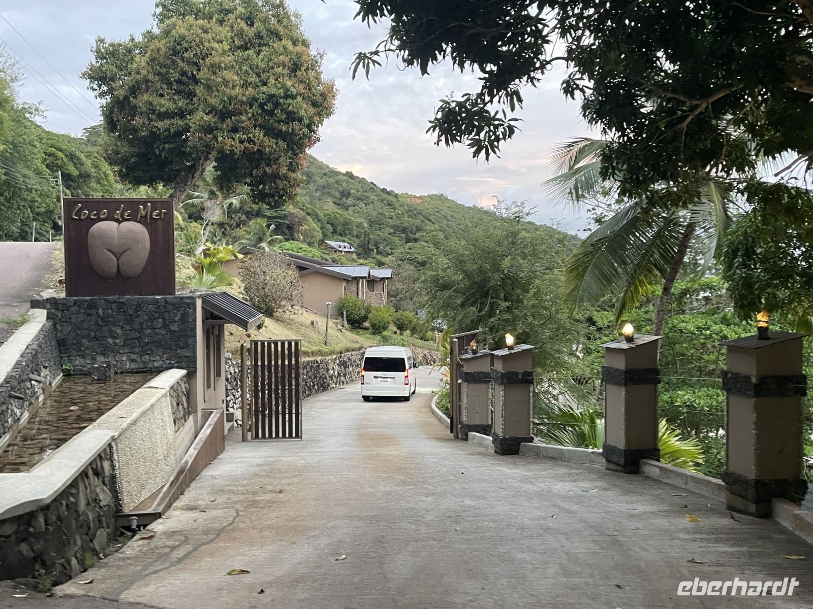 Um 14:00 Uhr treten wir die Rückfahrt nach Victoria an, mit einem letzten Halt an einem Aussichtspunkt, der uns einen wunderbaren Blick auf die Insel bietet. Um 15:15 Uhr erreichen wir den Fährhafen und holen unsere Koffer sowie die Boardingpässe im Büro unserer örtlichen Reiseagentur ab. Die Pässe und das Gepäck geben wir anschließend bei der Fährgesellschaft Cat Cocos ab. Das Boarding beginnt um 16:00 Uhr, und die Fähre legt pünktlich um 16:30 Uhr nach Praslin ab. Dank des ruhigen Seegangs erreichen wir unser Ziel pünktlich um 17:30 Uhr. Cyril und ich kümmern uns um das Gepäck und bringen es zu unseren wartenden Gästen. Danach fahren wir mit zwei Transportern zum Hotel, welches wir nach etwa 20 Minuten erreichen. Um 18:30 Uhr kommen wir im Hotel Coco de Mer an, wo uns ein Begrüßungsgetränk serviert wird. Nach dem Check-in und einer kurzen Einführung in die Hotelannehmlichkeiten verteile ich die Zimmerschlüssel.