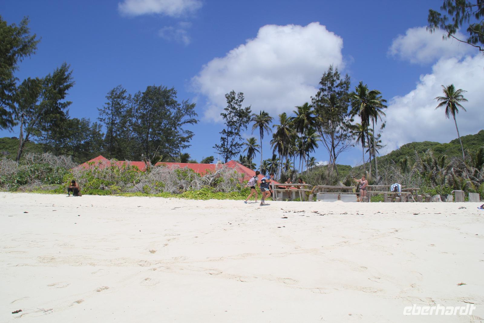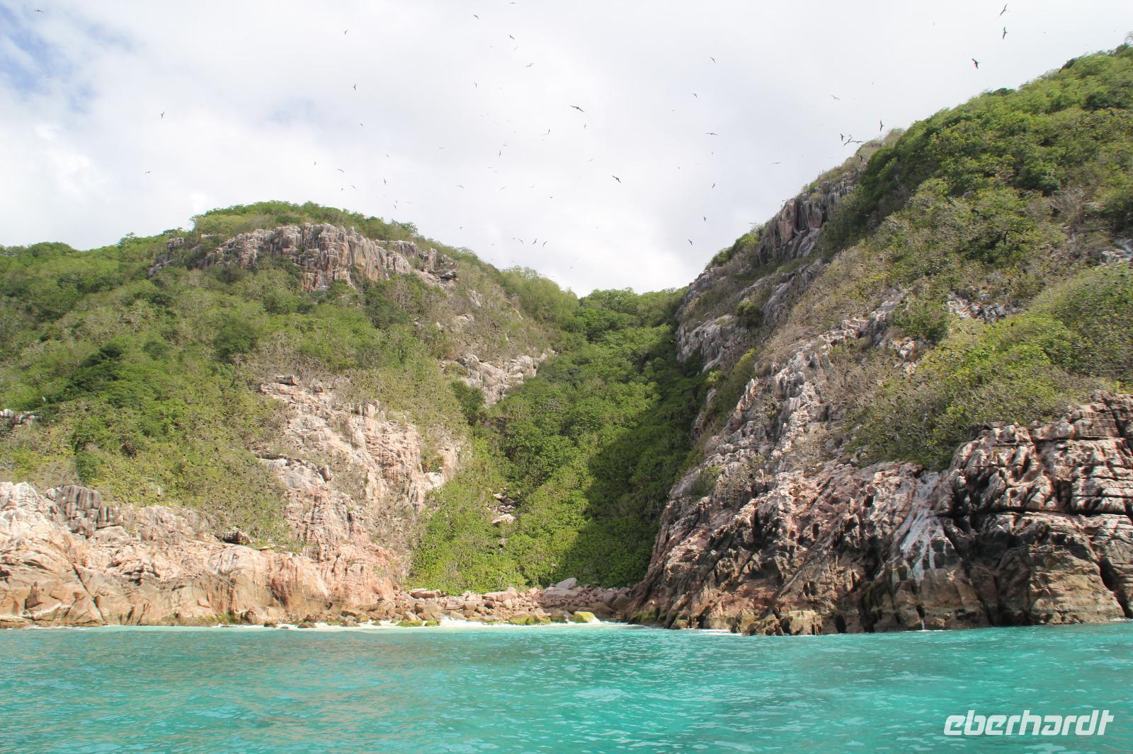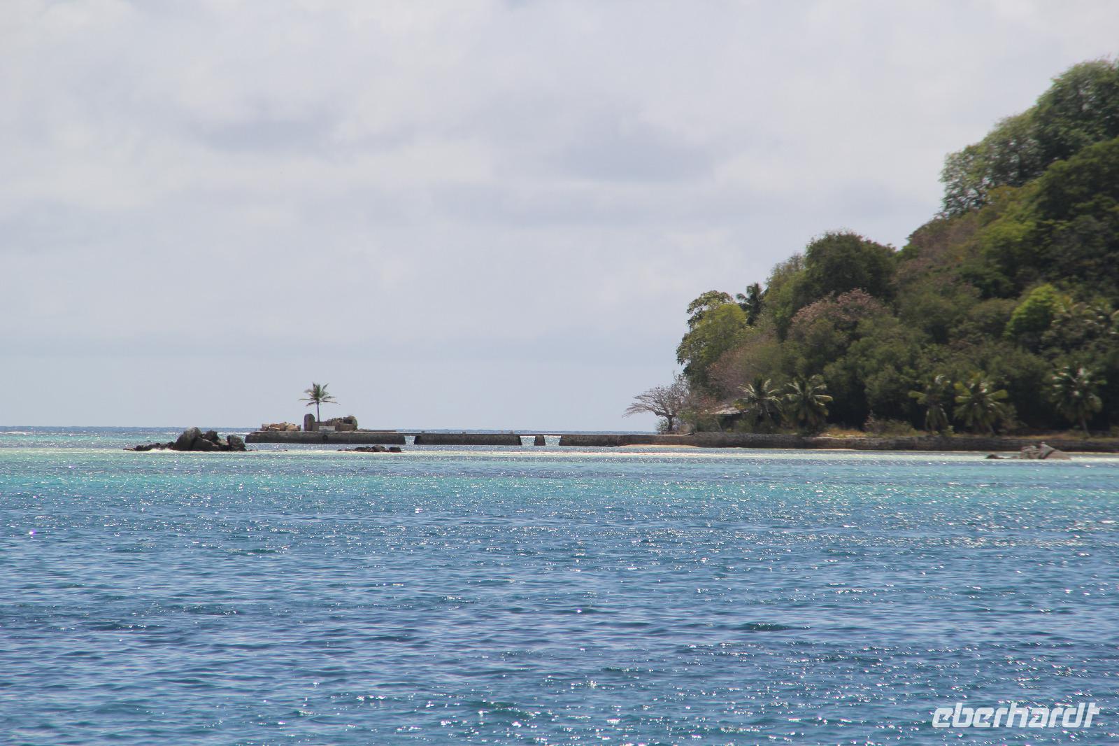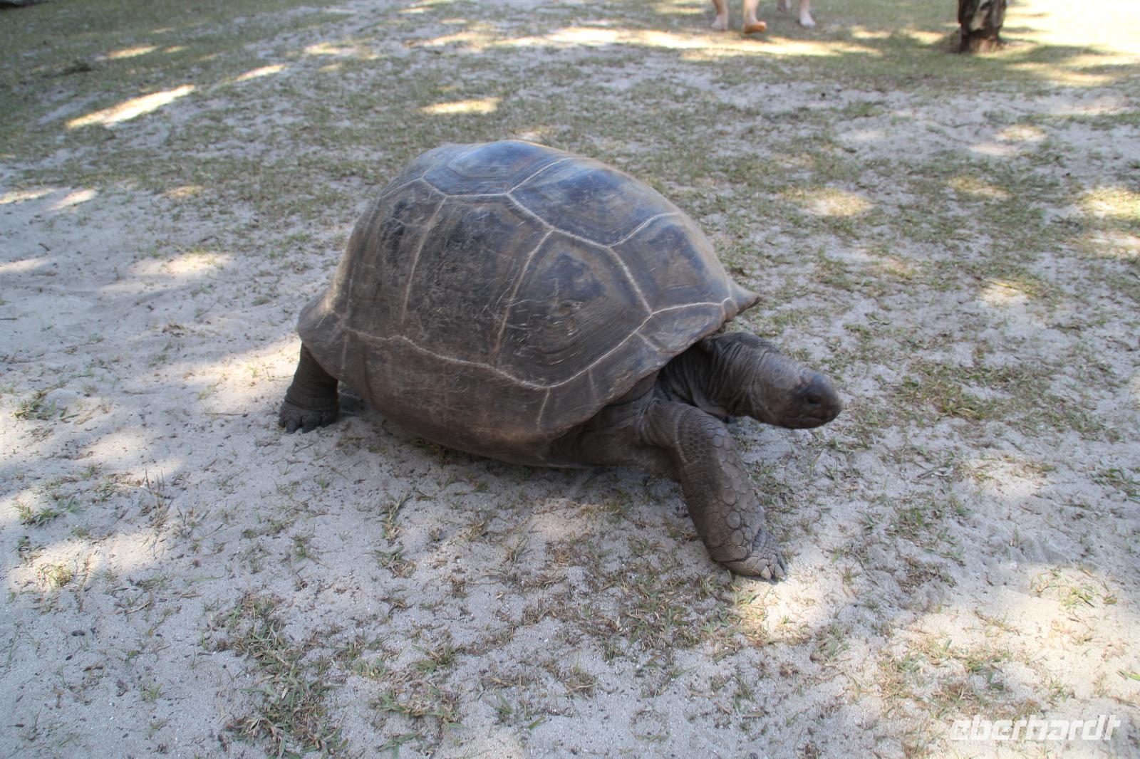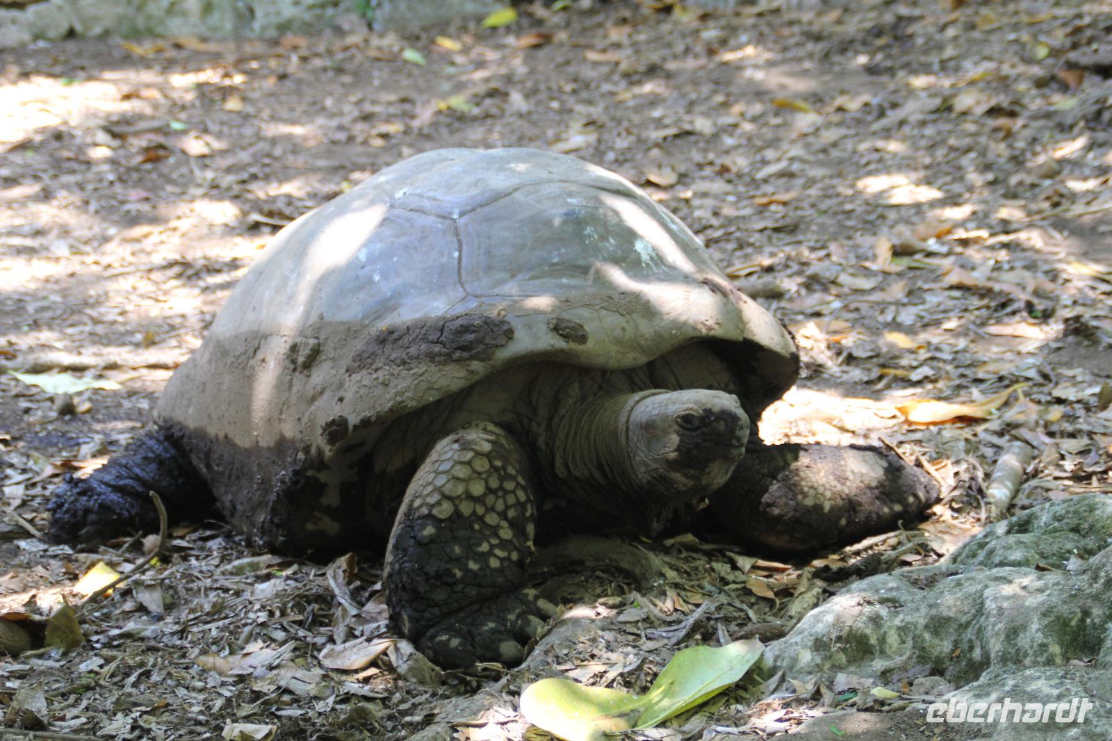 Während des Spaziergangs sahen wir u.a. erste große Landschildkröten, kleine flinke rote Vögel und Tauben. Nach etwas 20min. erreichten wir die Piratengräber der Insel, wo noch immer ein Geist sein Unwesen treibt. Danach spazierten wir den gleichen Weg zurück und genossen die restliche Zeit an dem kleinen Sandstrand der Insel.
