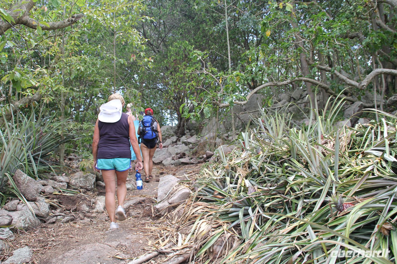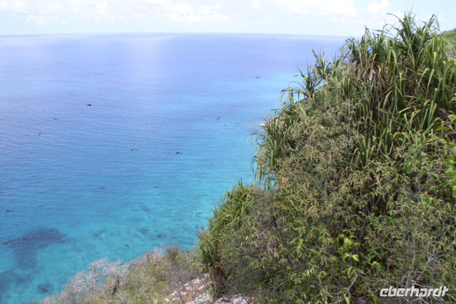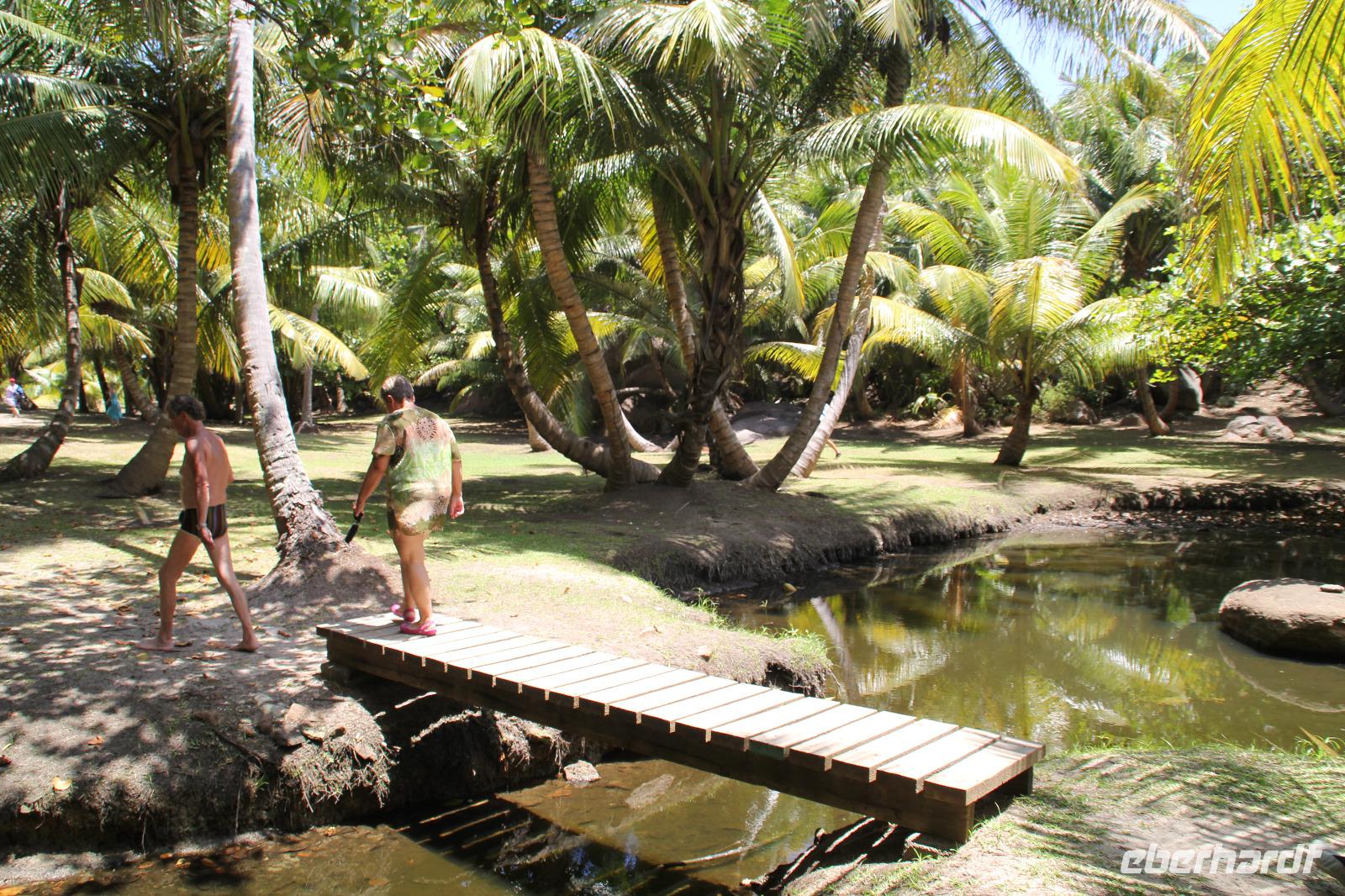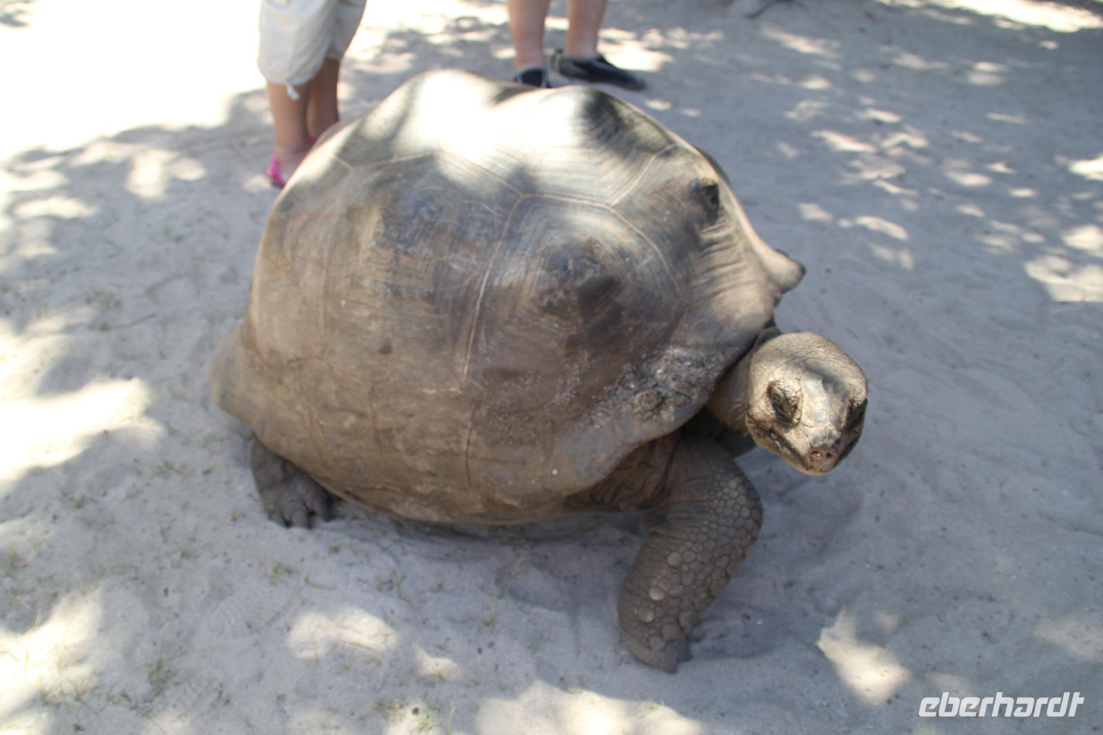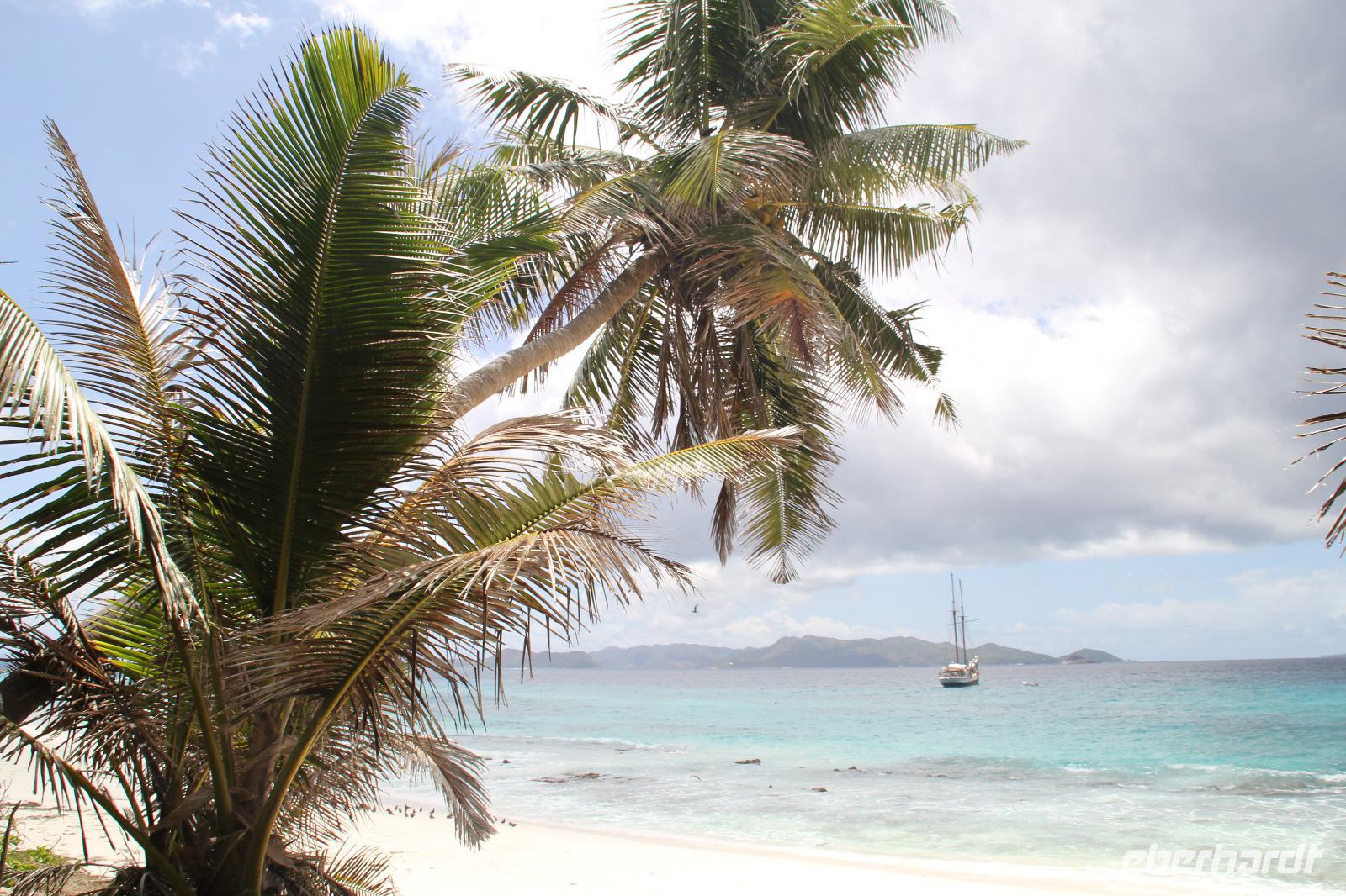 Während des Spaziergangs sahen wir u.a. erste große Landschildkröten, kleine flinke rote Vögel und Tauben. Nach etwas 20min. erreichten wir die Piratengräber der Insel, wo noch immer ein Geist sein Unwesen treibt. Danach spazierten wir den gleichen Weg zurück und genossen die restliche Zeit an dem kleinen Sandstrand der Insel.