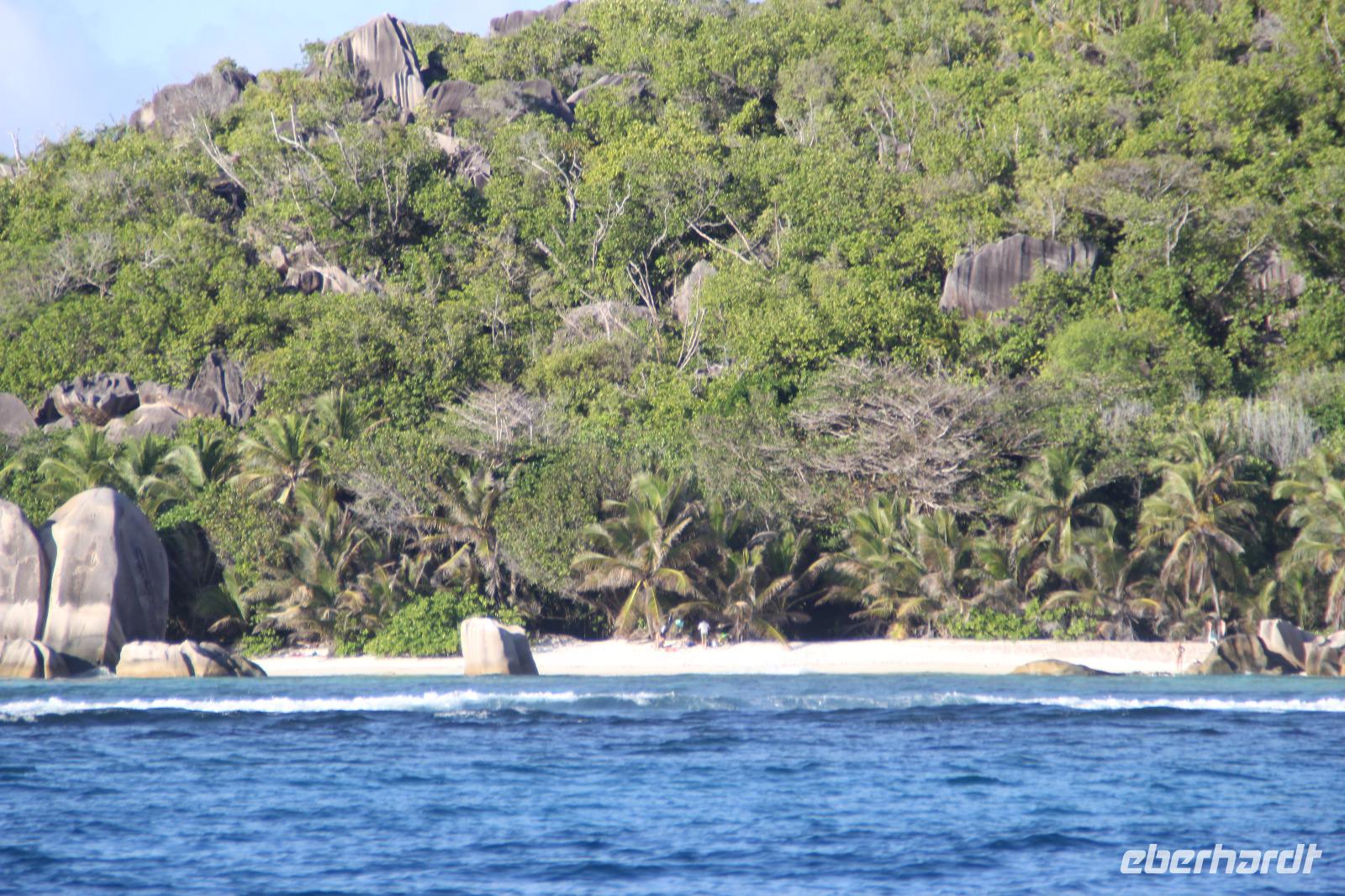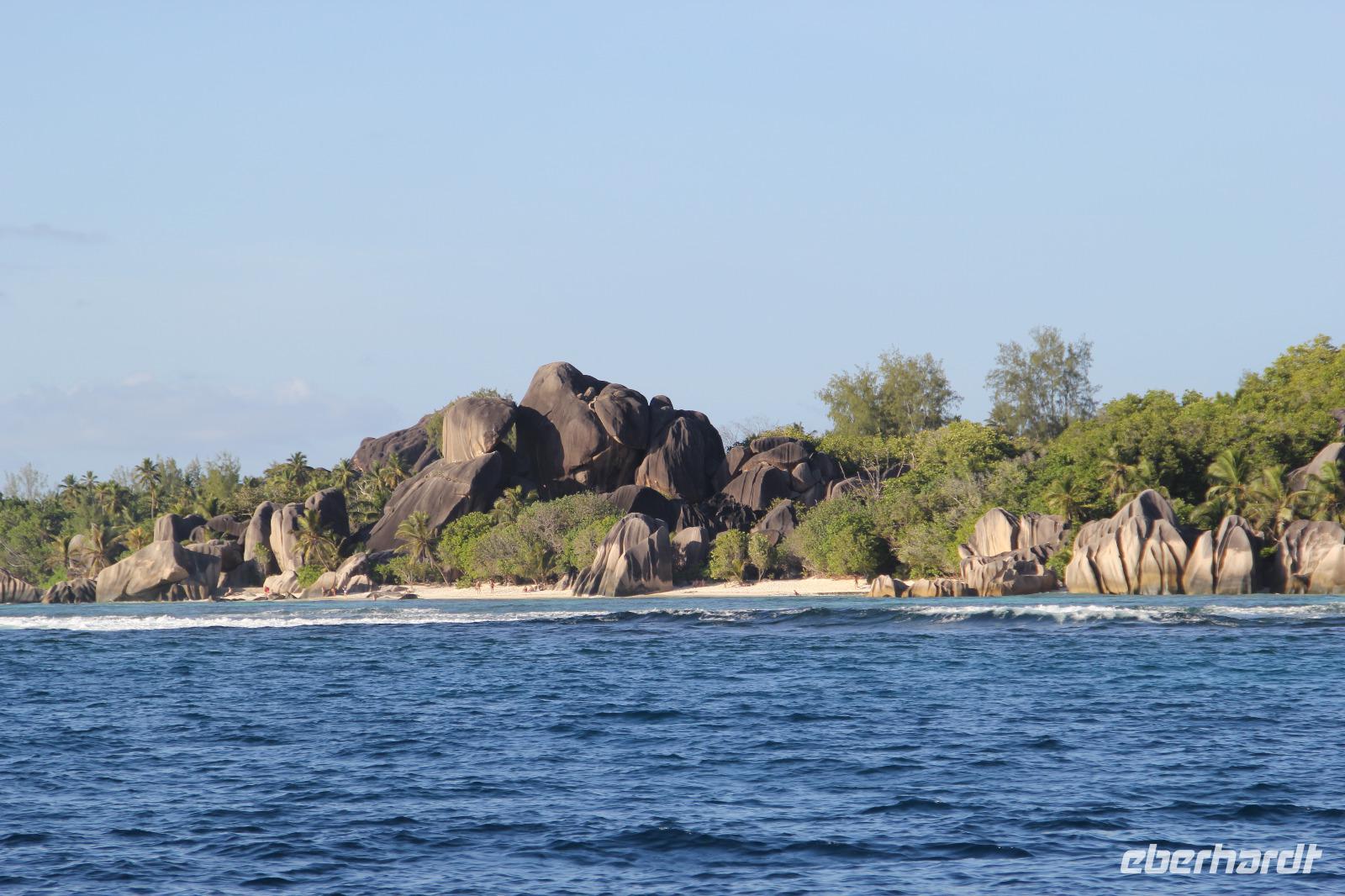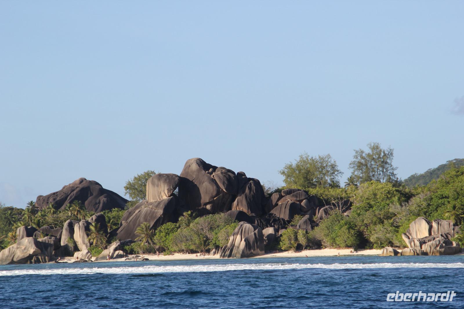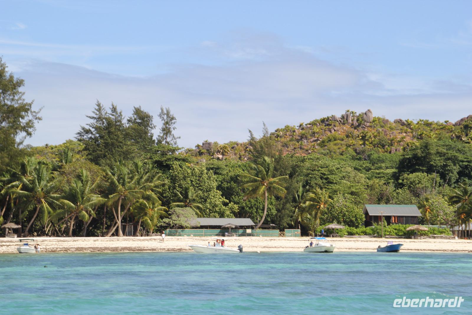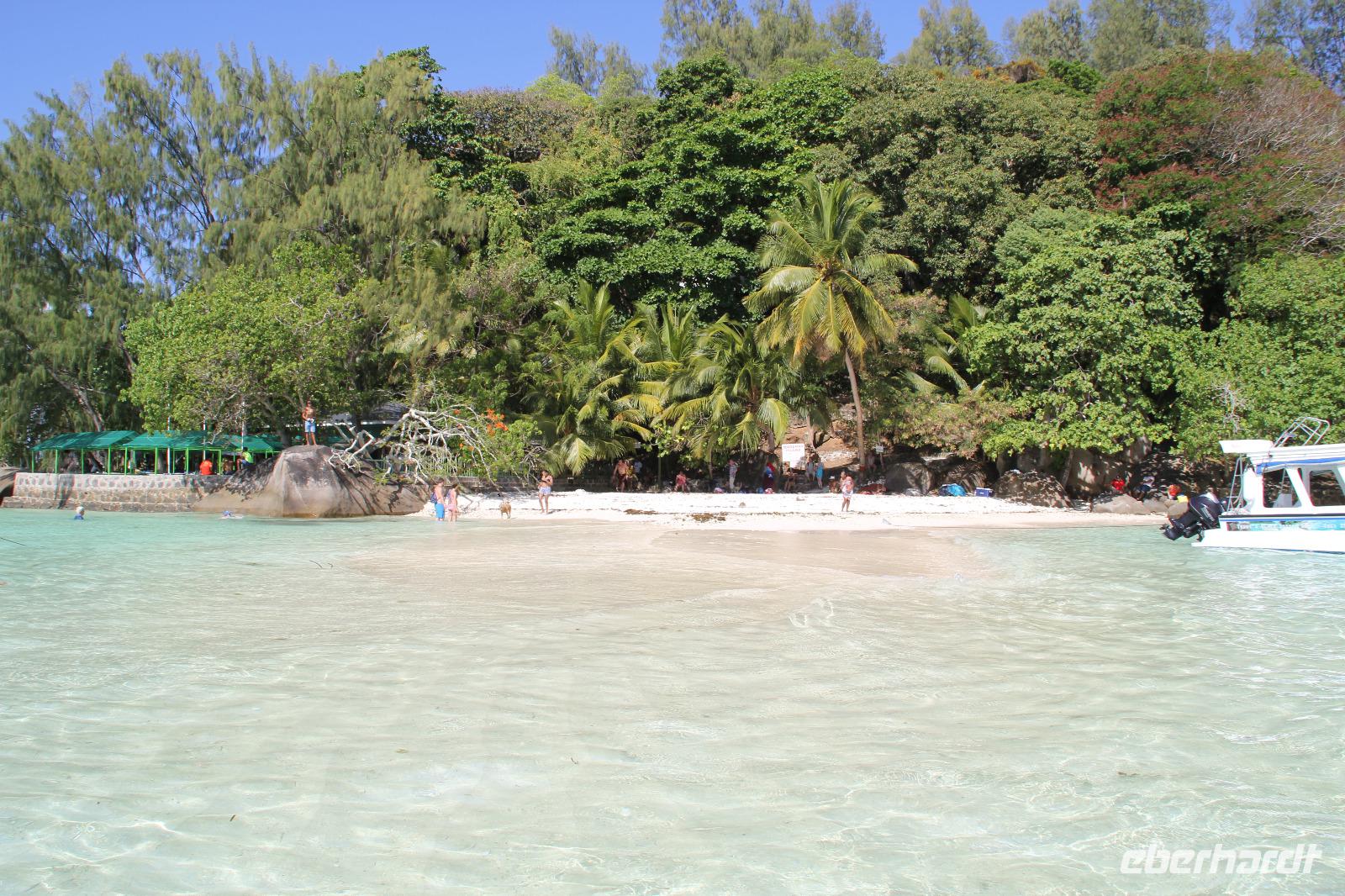 Laut National Geographic befinden sich auf der Insel allgemein mit die schönsten Strände der Welt. Die vom Wasser abgeschliffenen Granitfelsen am weißen Traumstrand vor türkisblauem Meer sprechen deutlich dafür. Hier hat man u.a. in den 90er Jahren eine Bacardi Werbung gedreht. Wir hatten ca. anderthalb Stunden Zeit zum Baden und relaxen, bevor wir am Nachmittag wieder unseren Katamaran bestiegen und noch einmal um die ganze Insel fuhren. Zuvor kauften wir noch ein paar Souvenirs im Zentrum der Insel, wo es auch Banken und eine Post gibt. Kurze Zeit später fuhren wir für ca. 45min. einmal um die ganze Insel herum. Zum Sonnenuntergang erreichten wir wieder die Insel Praslin und unser Hotel. Wieder einmal war es ein wunderschöner Tag im Paradies.