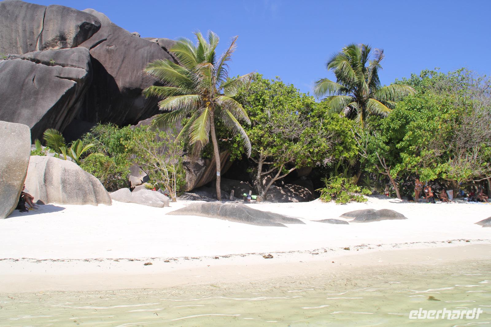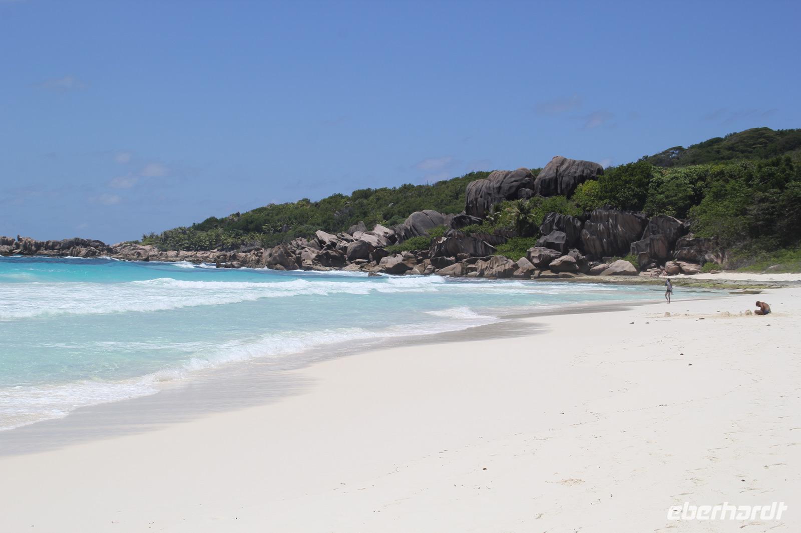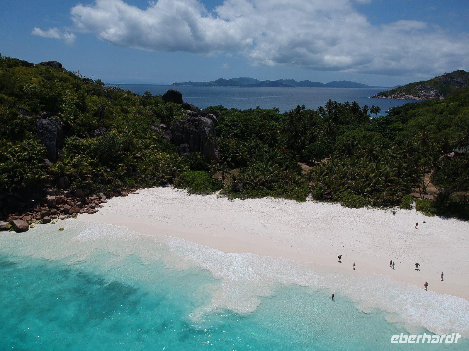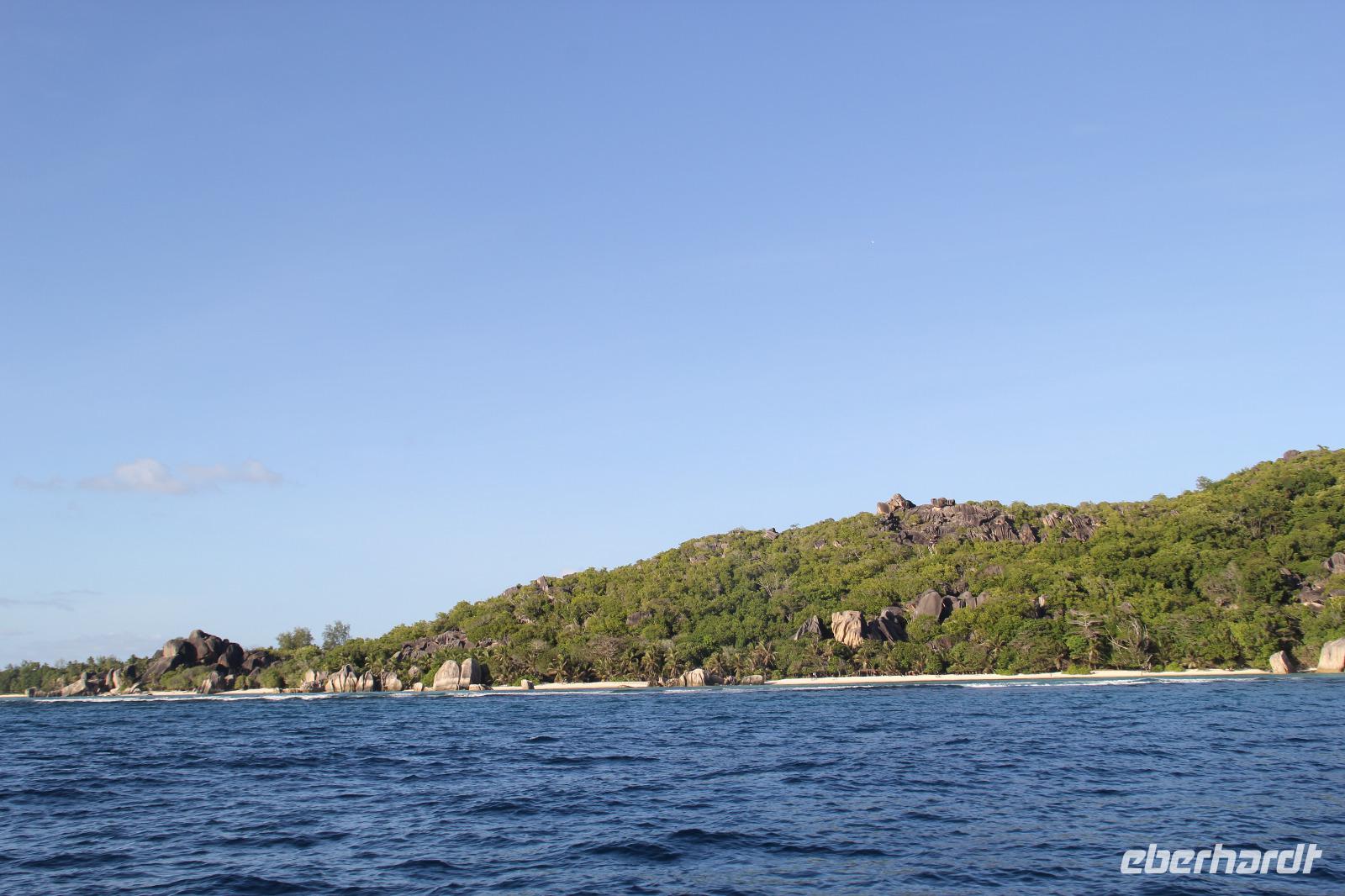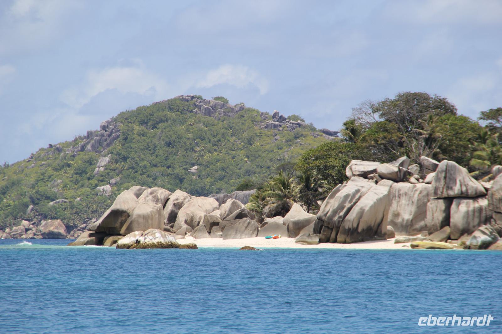 Laut National Geographic befinden sich auf der Insel allgemein mit die schönsten Strände der Welt. Die vom Wasser abgeschliffenen Granitfelsen am weißen Traumstrand vor türkisblauem Meer sprechen deutlich dafür. Hier hat man u.a. in den 90er Jahren eine Bacardi Werbung gedreht. Wir hatten ca. anderthalb Stunden Zeit zum Baden und relaxen, bevor wir am Nachmittag wieder unseren Katamaran bestiegen und noch einmal um die ganze Insel fuhren. Zuvor kauften wir noch ein paar Souvenirs im Zentrum der Insel, wo es auch Banken und eine Post gibt. Kurze Zeit später fuhren wir für ca. 45min. einmal um die ganze Insel herum. Zum Sonnenuntergang erreichten wir wieder die Insel Praslin und unser Hotel. Wieder einmal war es ein wunderschöner Tag im Paradies.