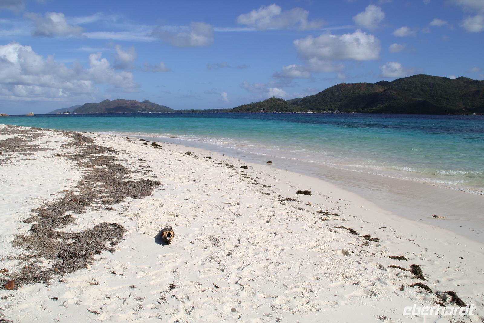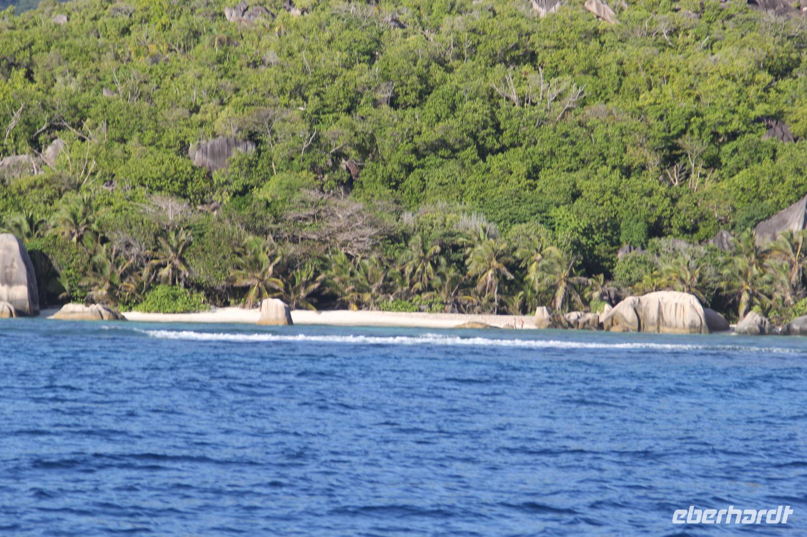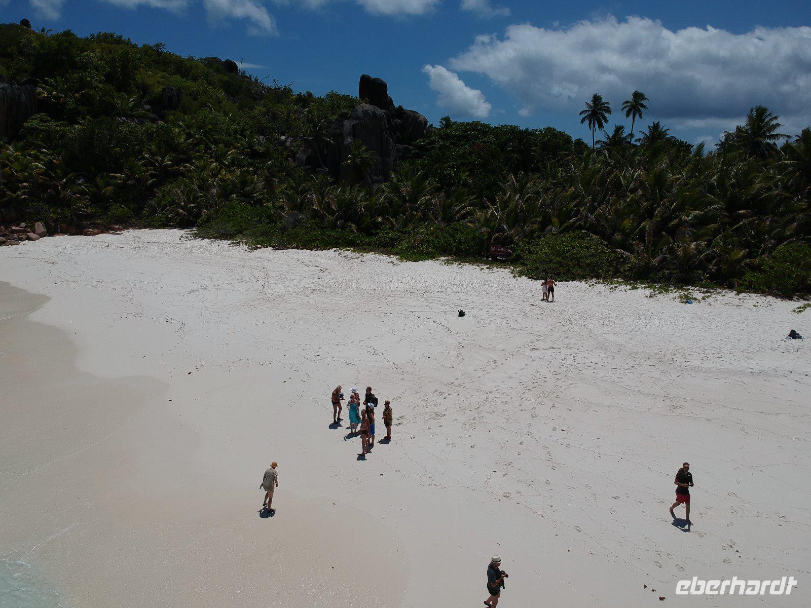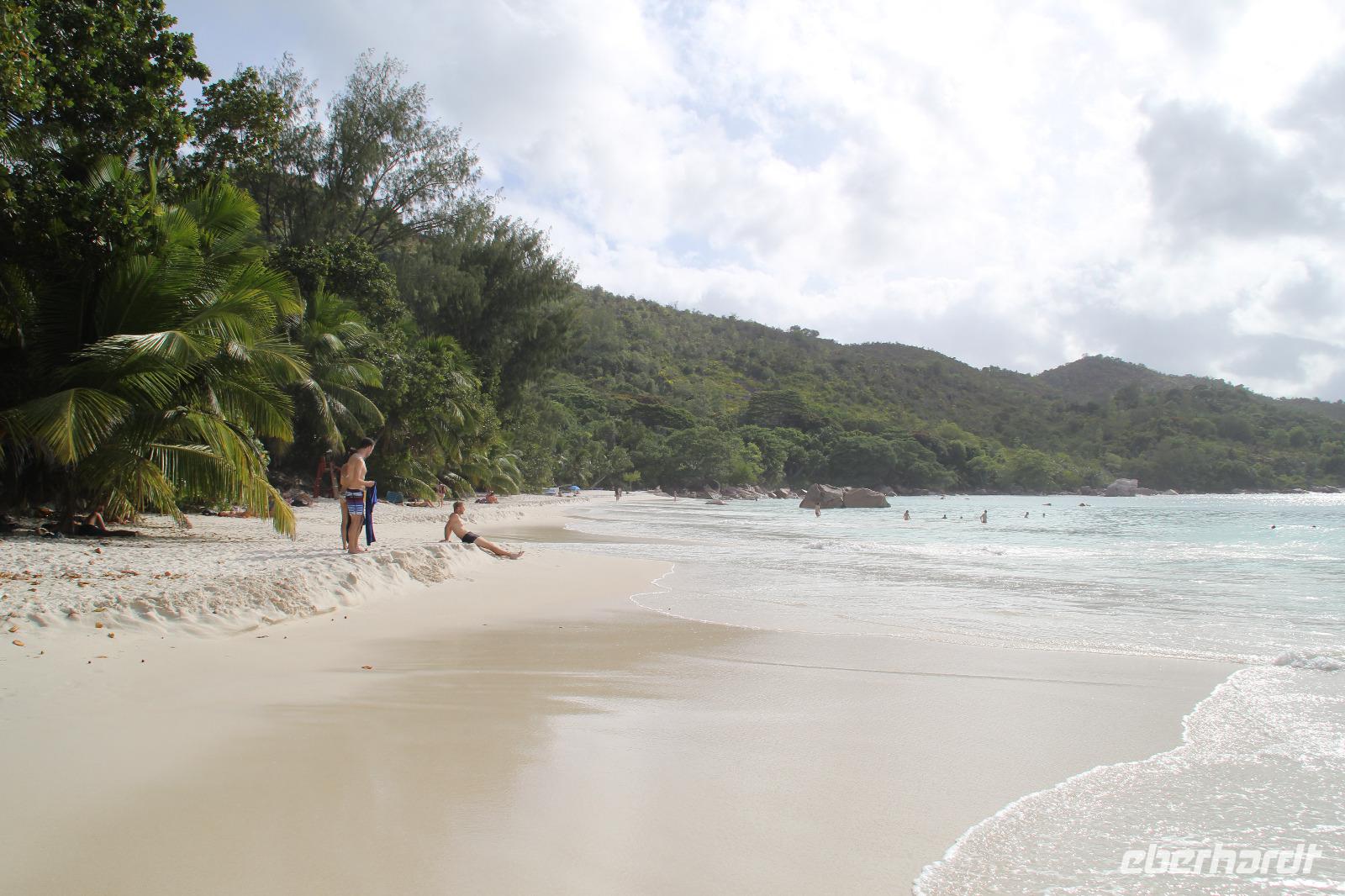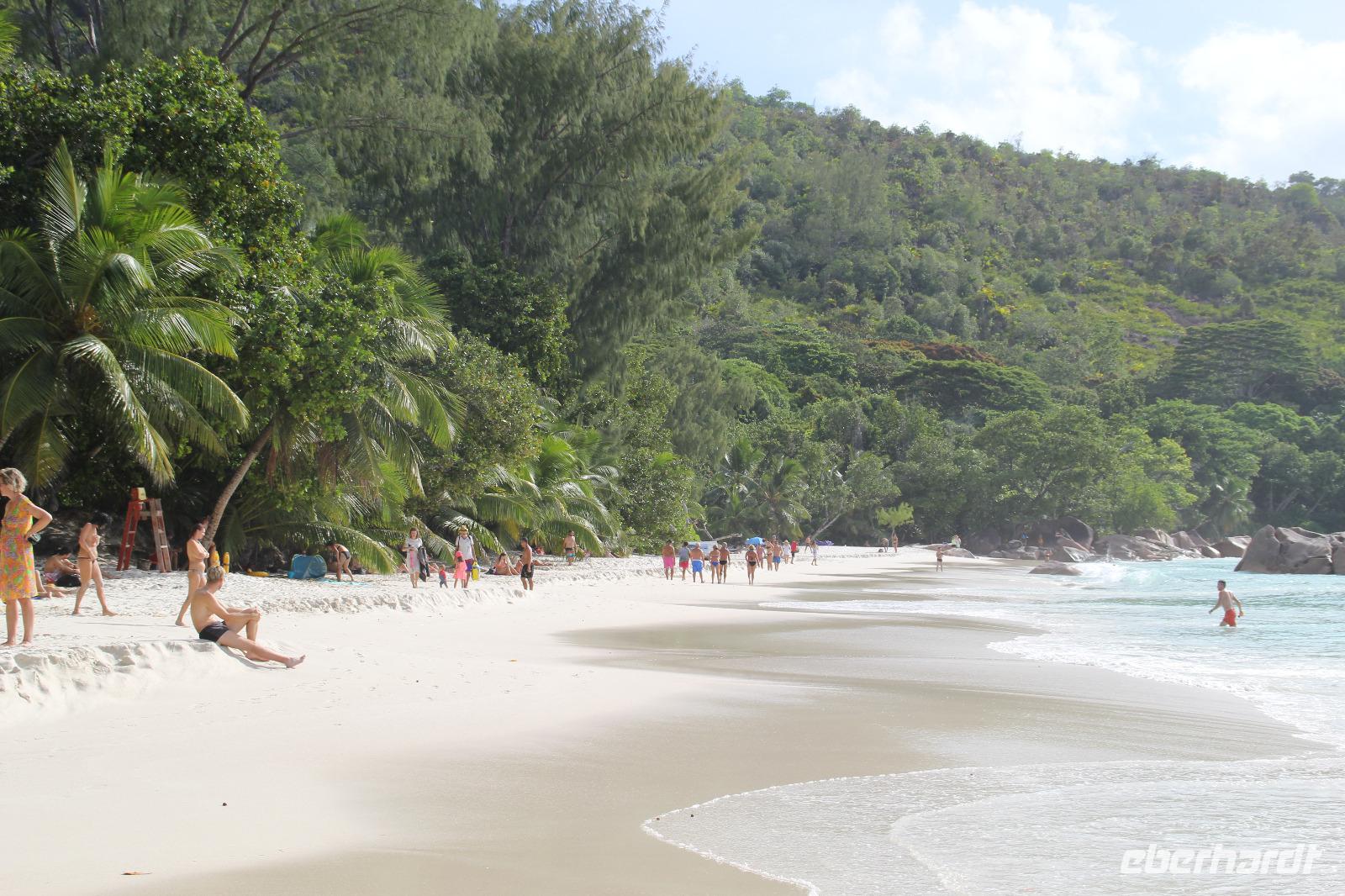 Laut National Geographic befinden sich auf der Insel allgemein mit die schönsten Strände der Welt. Die vom Wasser abgeschliffenen Granitfelsen am weißen Traumstrand vor türkisblauem Meer sprechen deutlich dafür. Hier hat man u.a. in den 90er Jahren eine Bacardi Werbung gedreht. Wir hatten ca. anderthalb Stunden Zeit zum Baden und relaxen, bevor wir am Nachmittag wieder unseren Katamaran bestiegen und noch einmal um die ganze Insel fuhren. Zuvor kauften wir noch ein paar Souvenirs im Zentrum der Insel, wo es auch Banken und eine Post gibt. Kurze Zeit später fuhren wir für ca. 45min. einmal um die ganze Insel herum. Zum Sonnenuntergang erreichten wir wieder die Insel Praslin und unser Hotel. Wieder einmal war es ein wunderschöner Tag im Paradies.