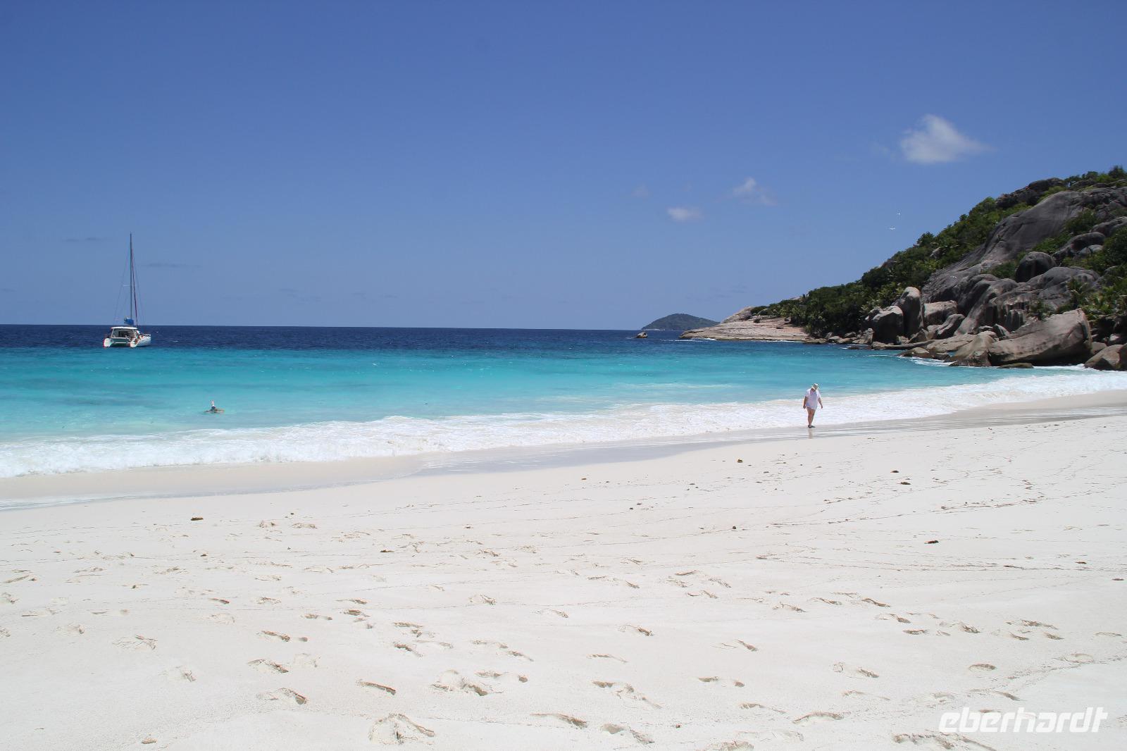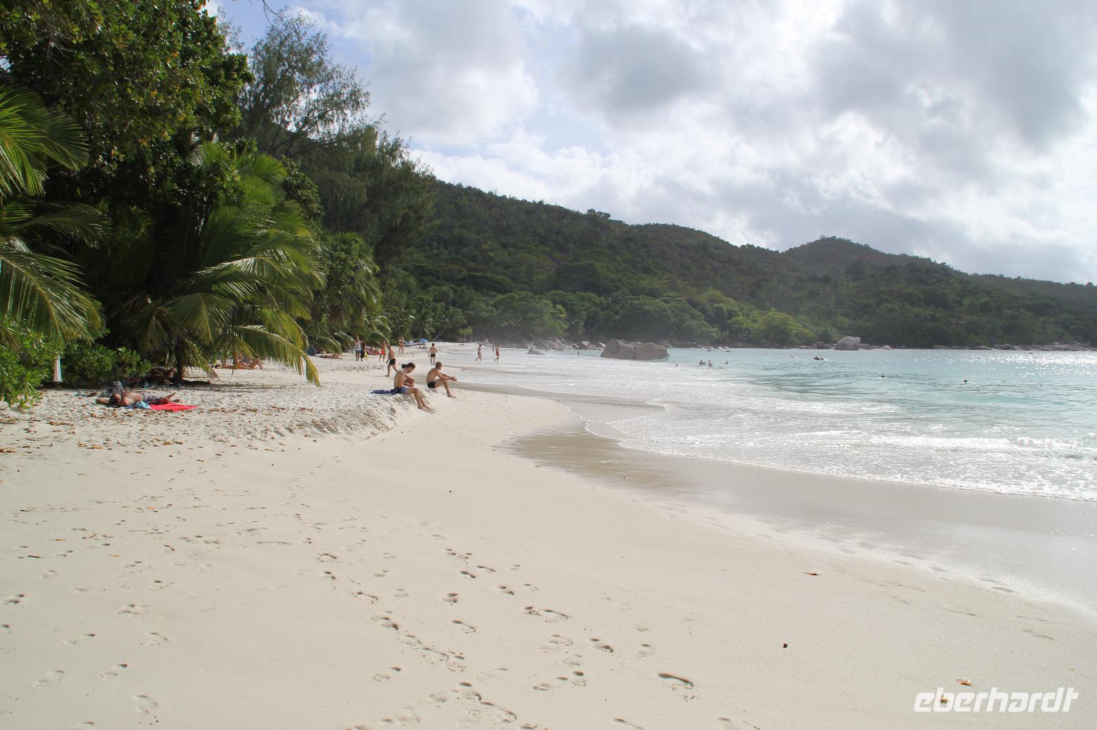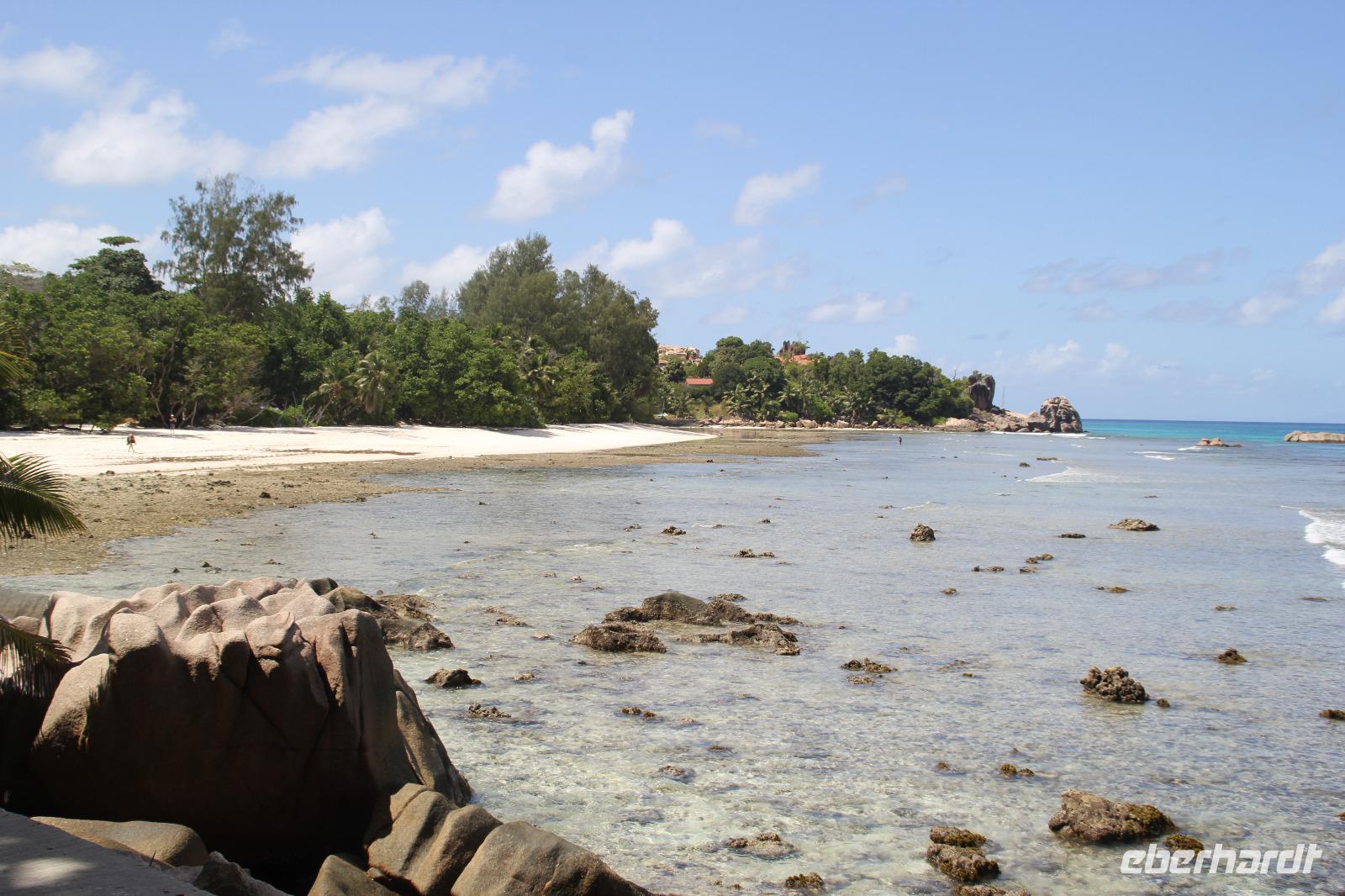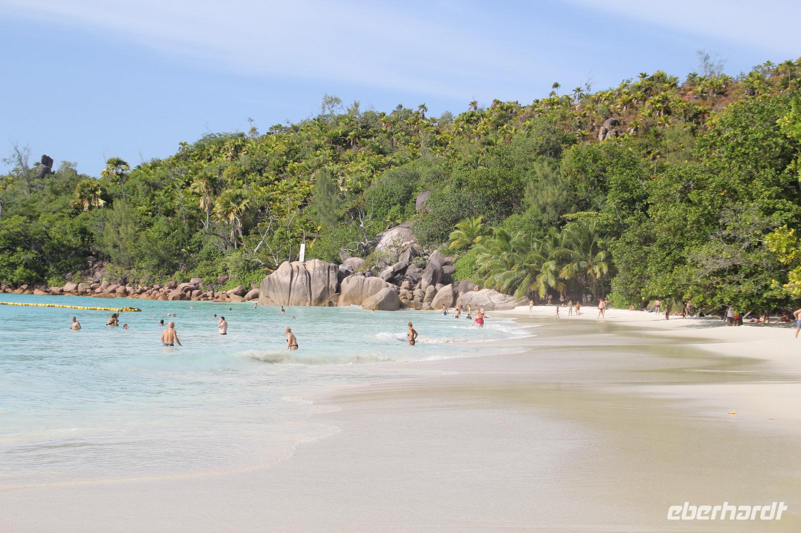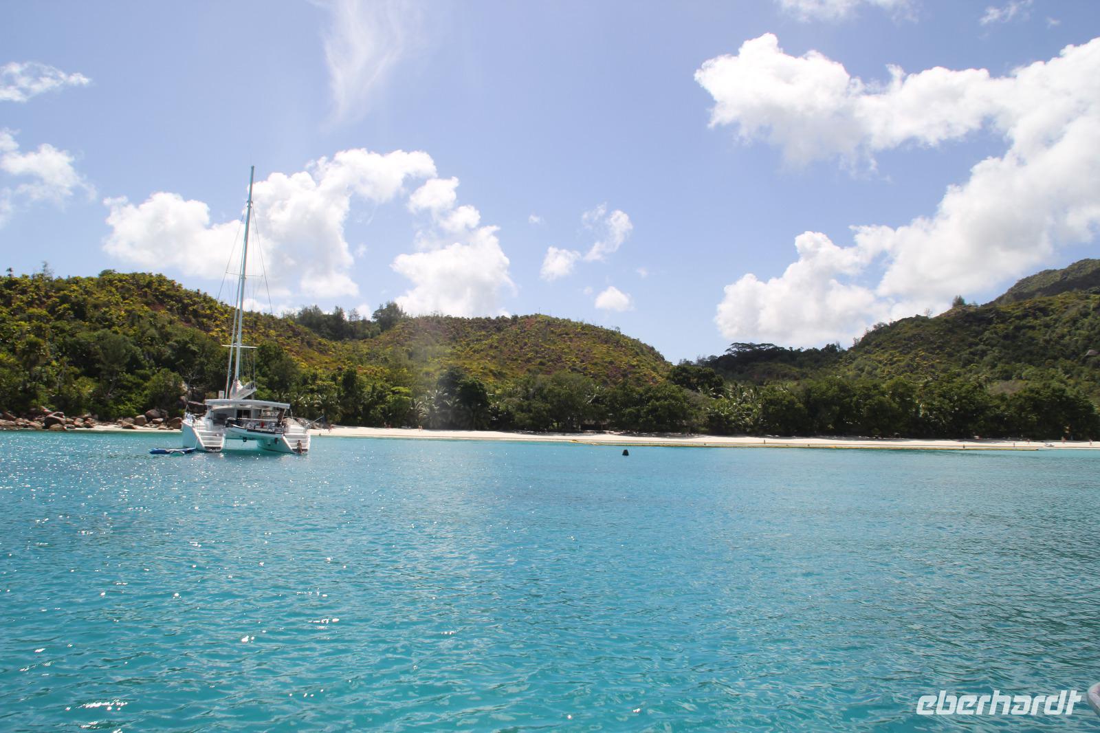 Laut National Geographic befinden sich auf der Insel allgemein mit die schönsten Strände der Welt. Die vom Wasser abgeschliffenen Granitfelsen am weißen Traumstrand vor türkisblauem Meer sprechen deutlich dafür. Hier hat man u.a. in den 90er Jahren eine Bacardi Werbung gedreht. Wir hatten ca. anderthalb Stunden Zeit zum Baden und relaxen, bevor wir am Nachmittag wieder unseren Katamaran bestiegen und noch einmal um die ganze Insel fuhren. Zuvor kauften wir noch ein paar Souvenirs im Zentrum der Insel, wo es auch Banken und eine Post gibt. Kurze Zeit später fuhren wir für ca. 45min. einmal um die ganze Insel herum. Zum Sonnenuntergang erreichten wir wieder die Insel Praslin und unser Hotel. Wieder einmal war es ein wunderschöner Tag im Paradies.